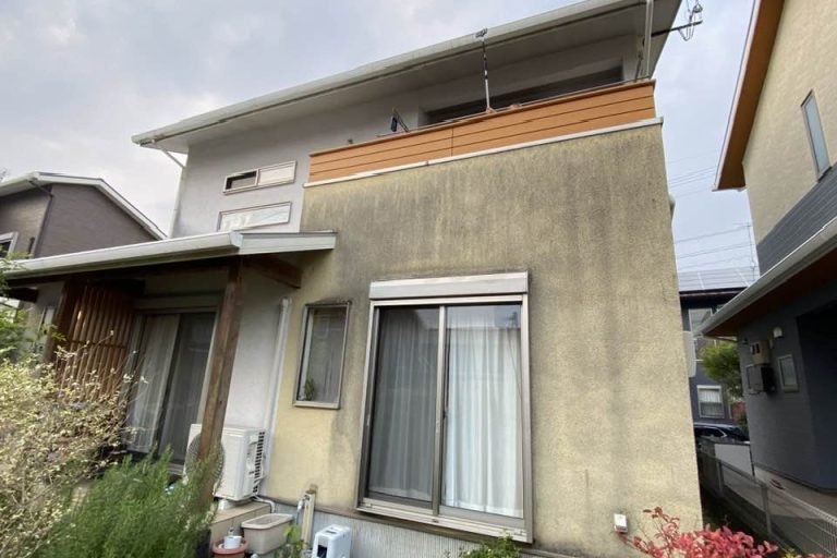 屋根勾配が大きく見た目的に下屋は汚れが目立ってしまうためにフッ素塗料(遮熱)にて塗装させて頂きました。