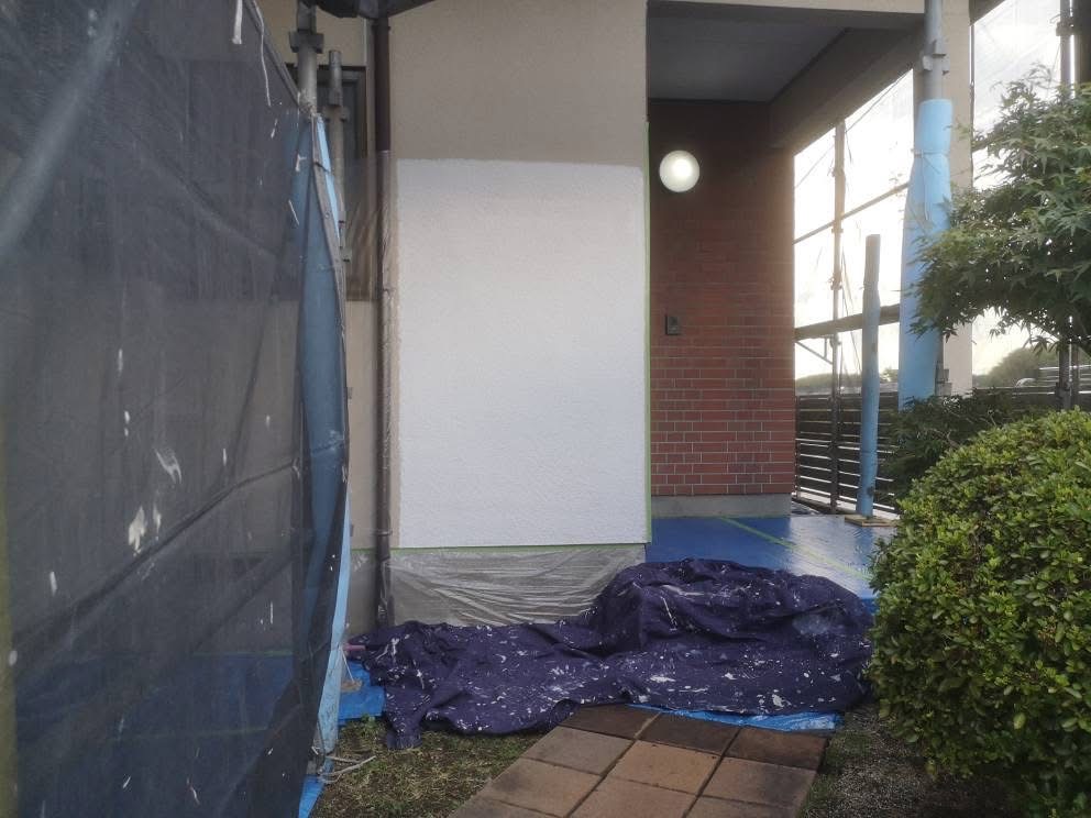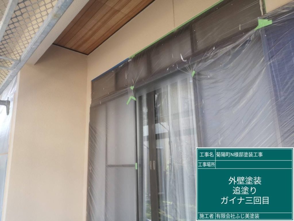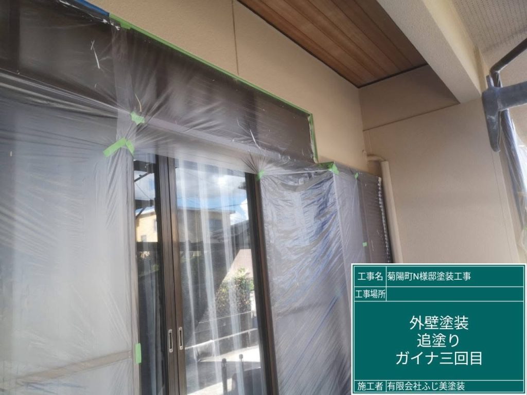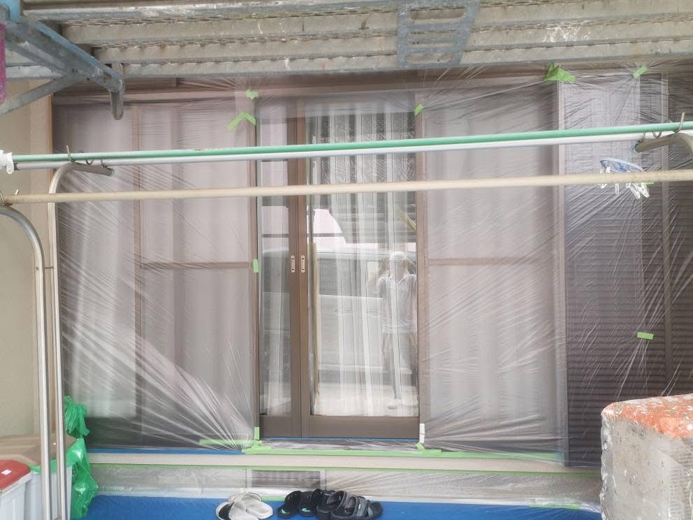 午後より玄関ドアマスキング、雨戸塗布など行なっております。