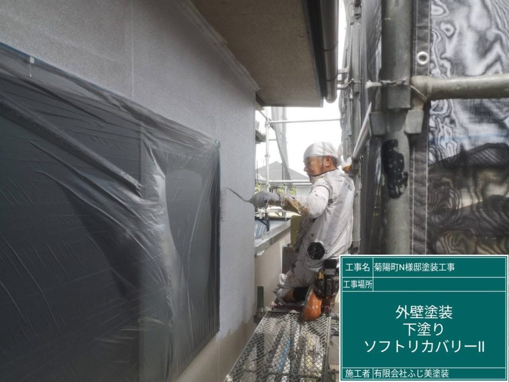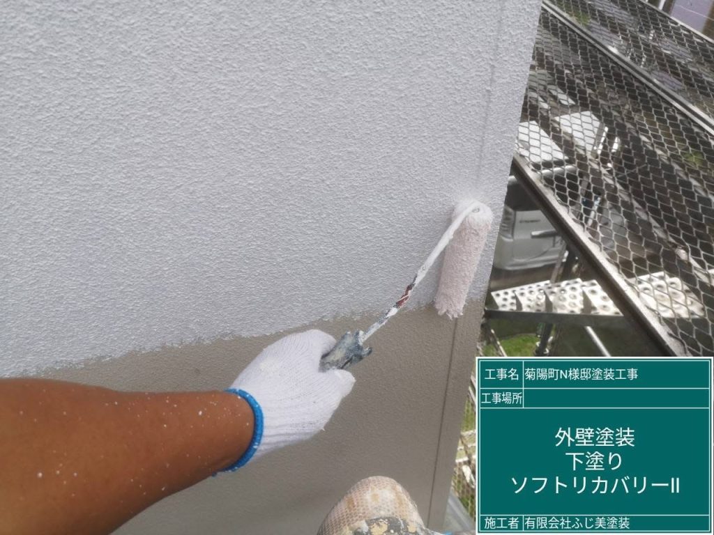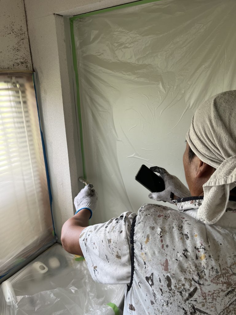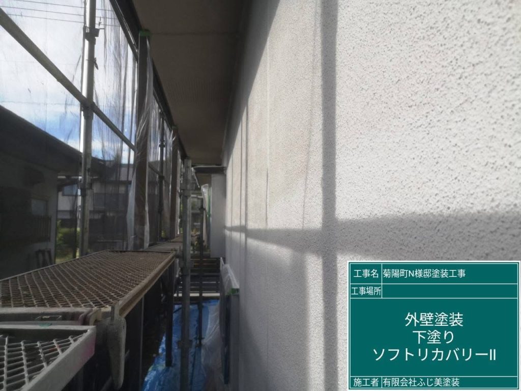 大変お世話になります。本日は朝より乗り込ませて頂き壁下塗を行なっております。