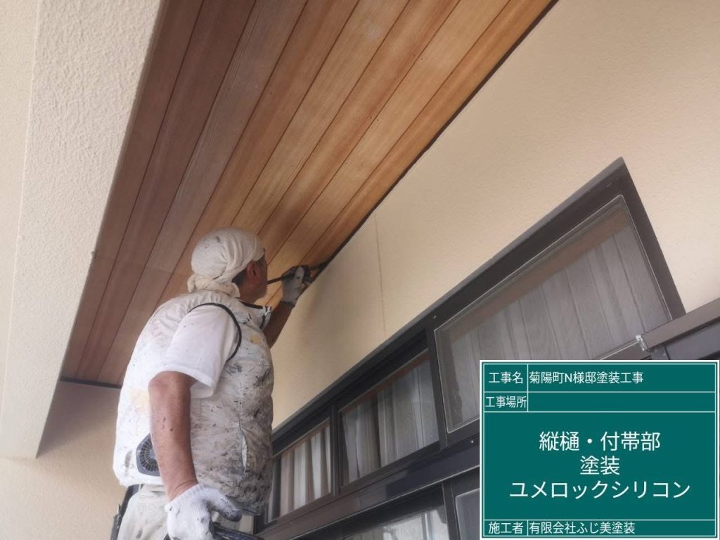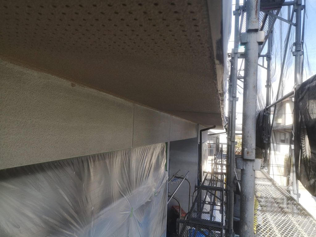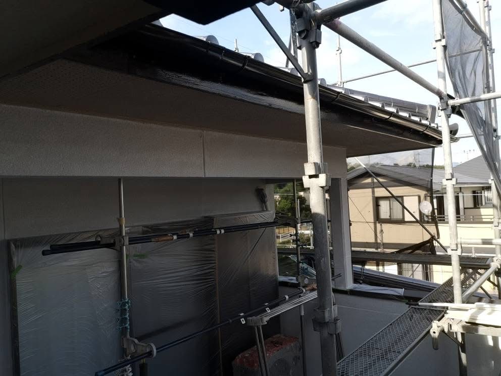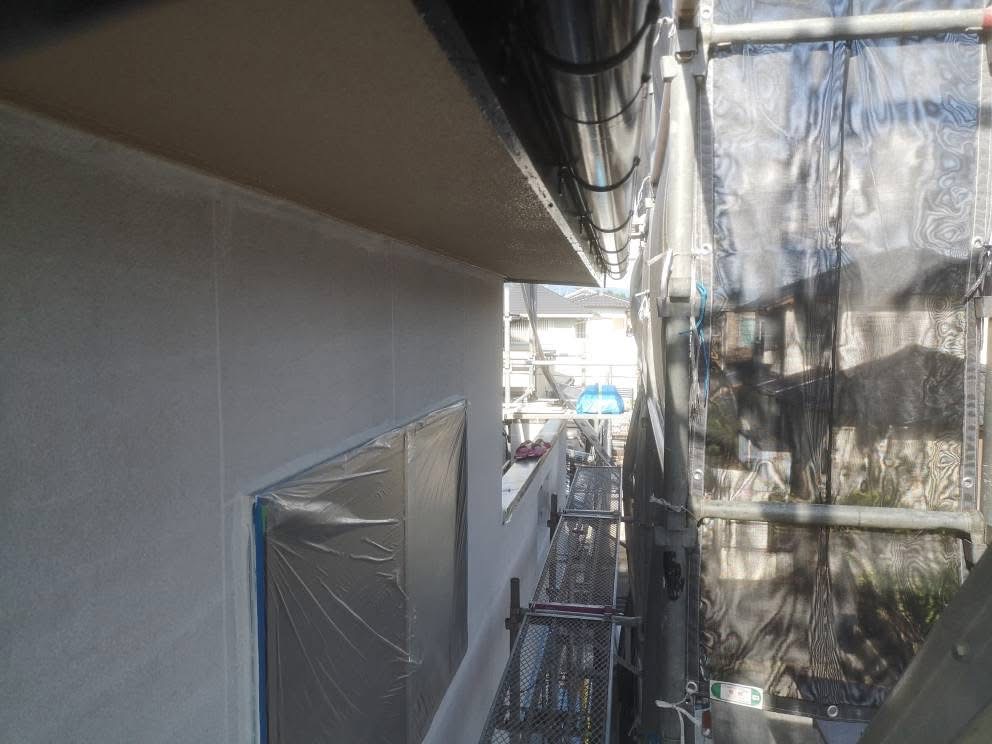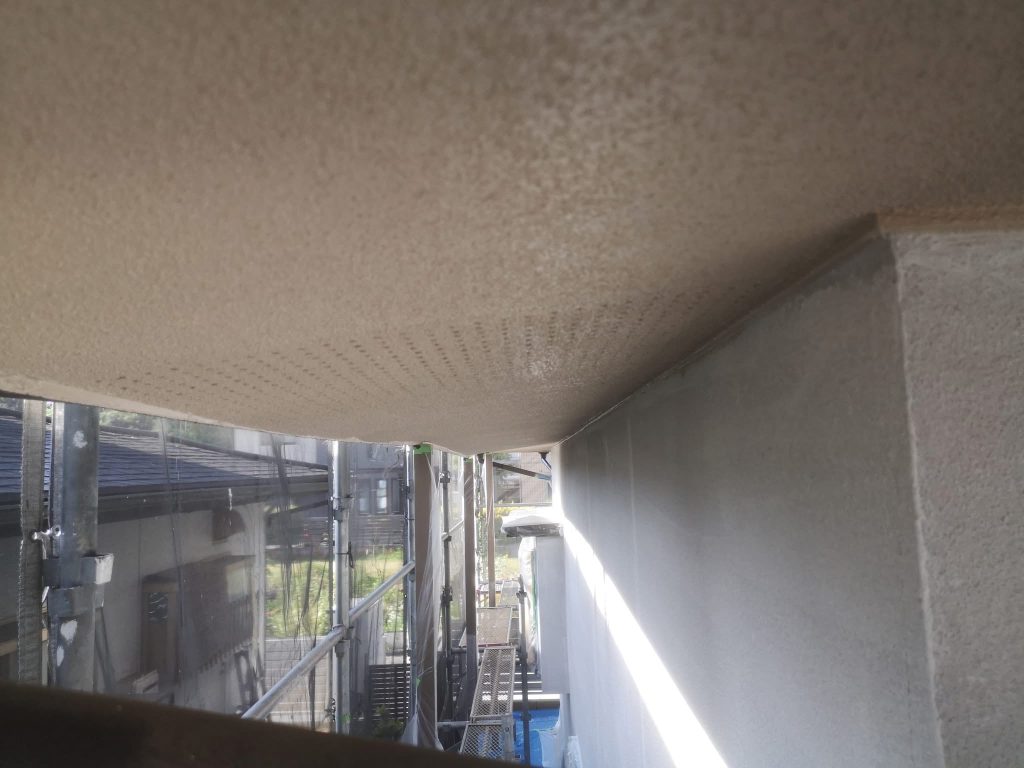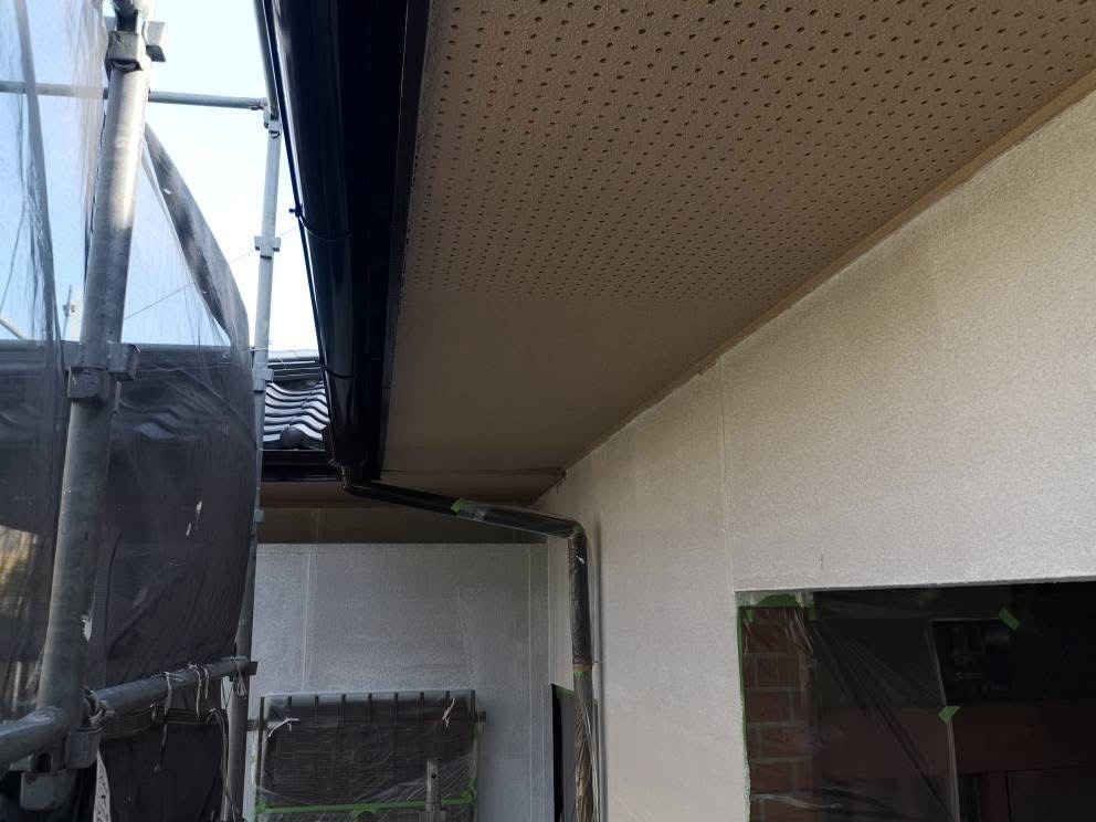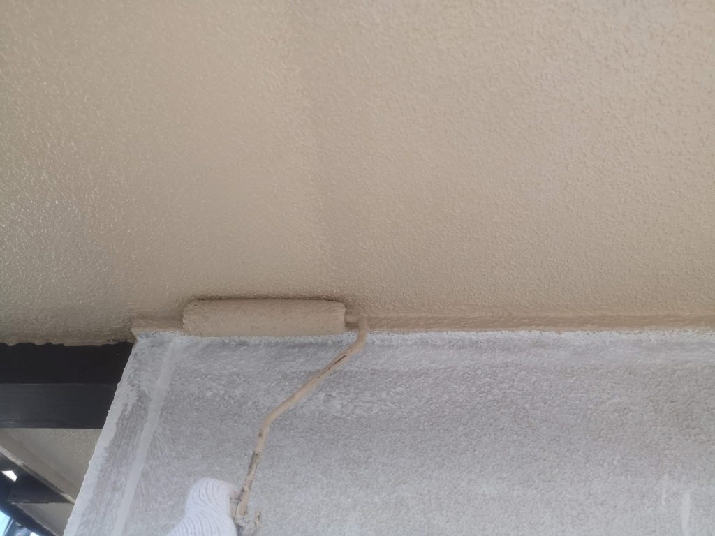 大変お世話になります。本日は朝より乗り込ませて頂き軒天井塗布1回目からスタートしております。平行しながら破風、横樋の塗布1回目を行なっております。乾燥後軒天井塗布2回目を行なっております。