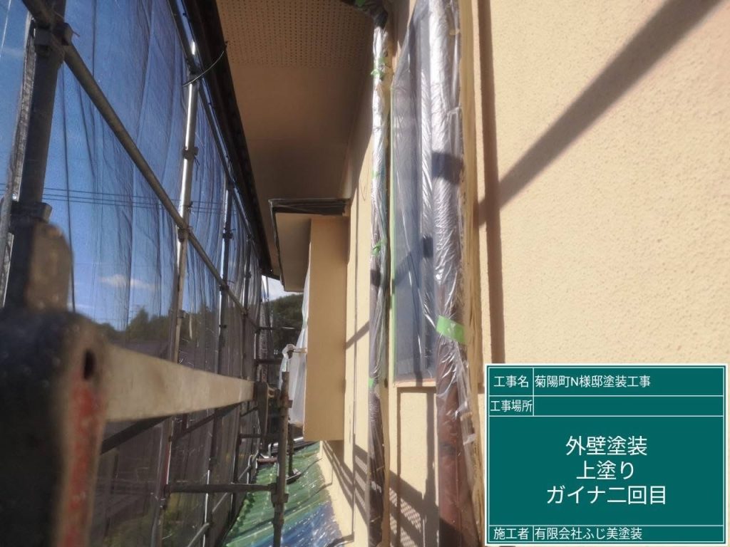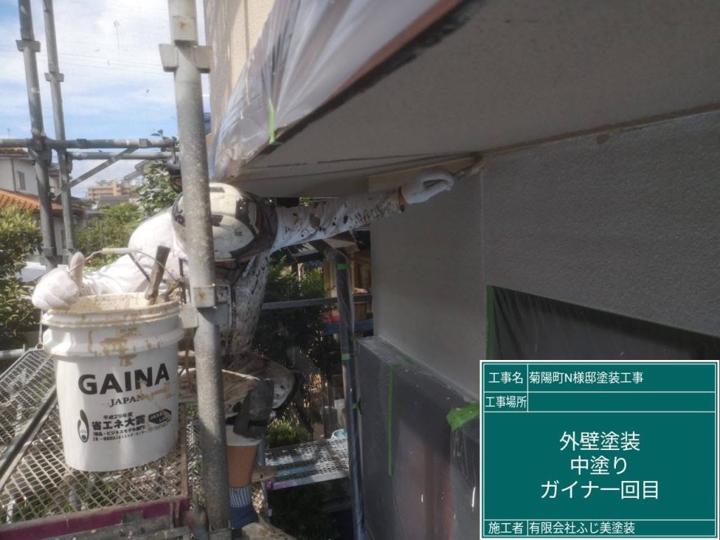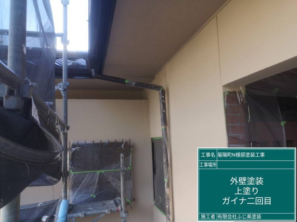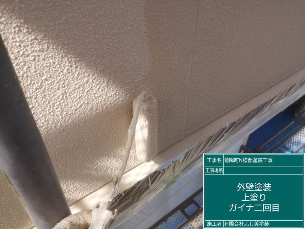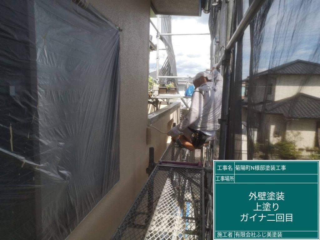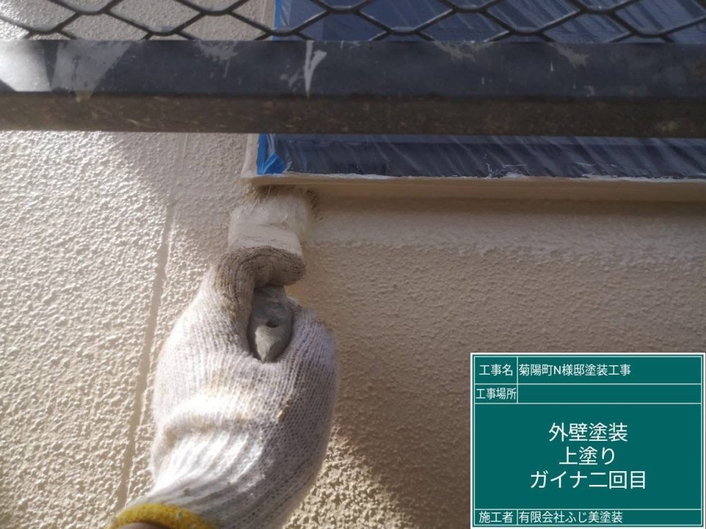本日は朝より乗り込ませて頂きガイナ塗布1回目からスタートしております。午後よりガイナ塗布2回目を行い、3回目塗布を2階ベランダ内、