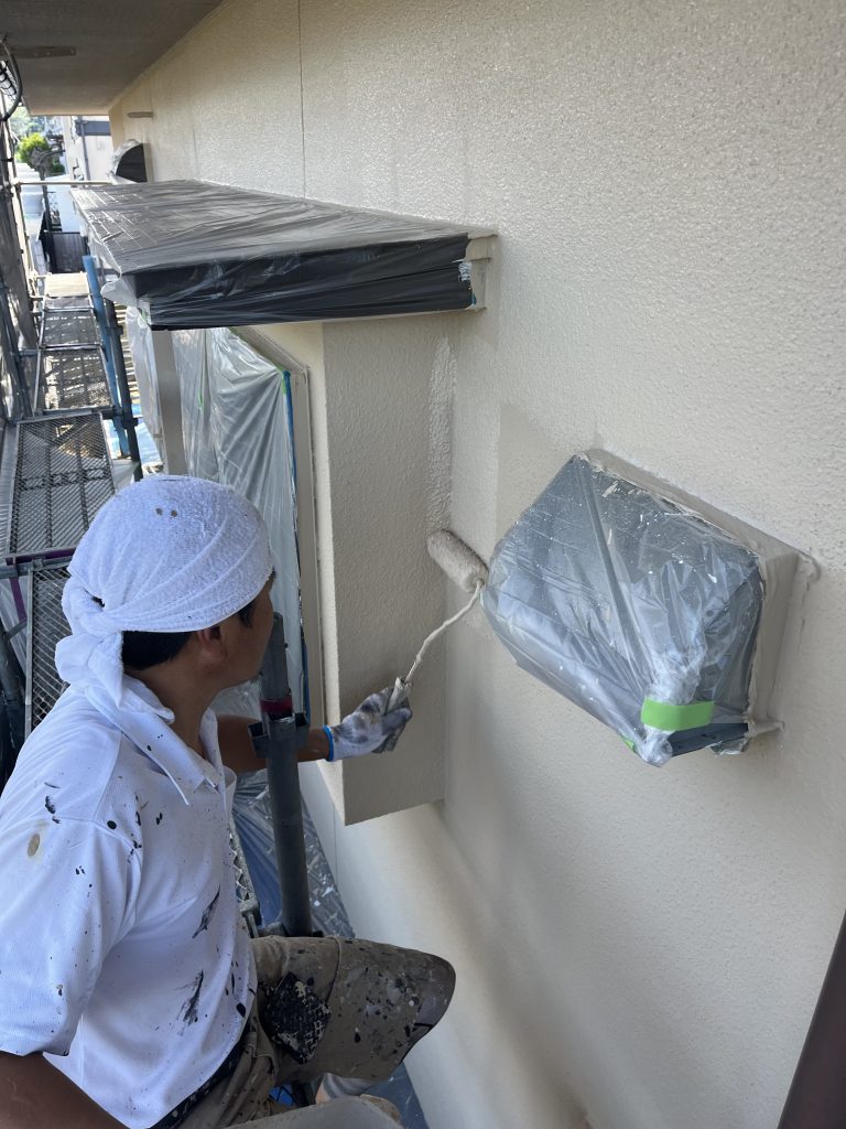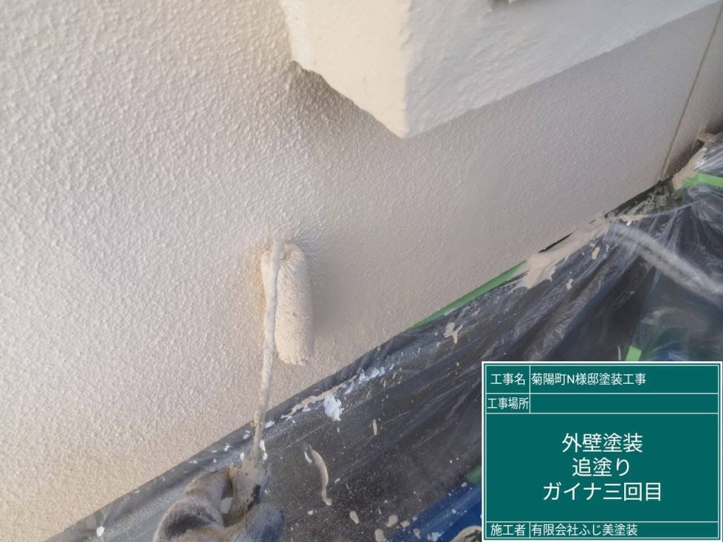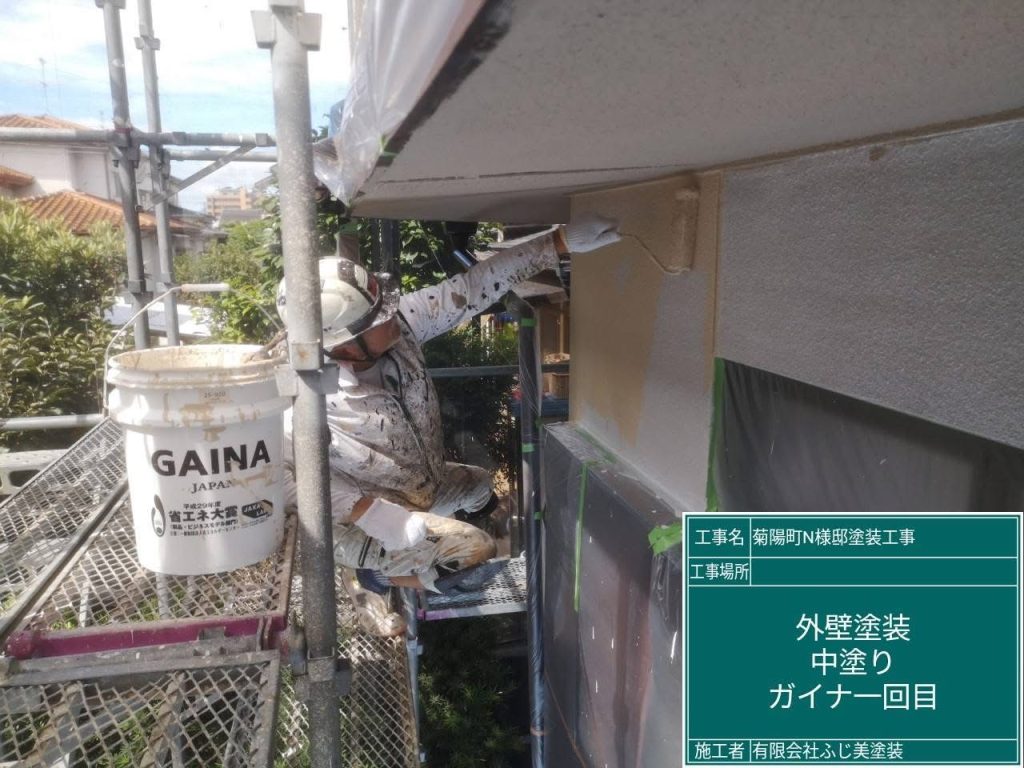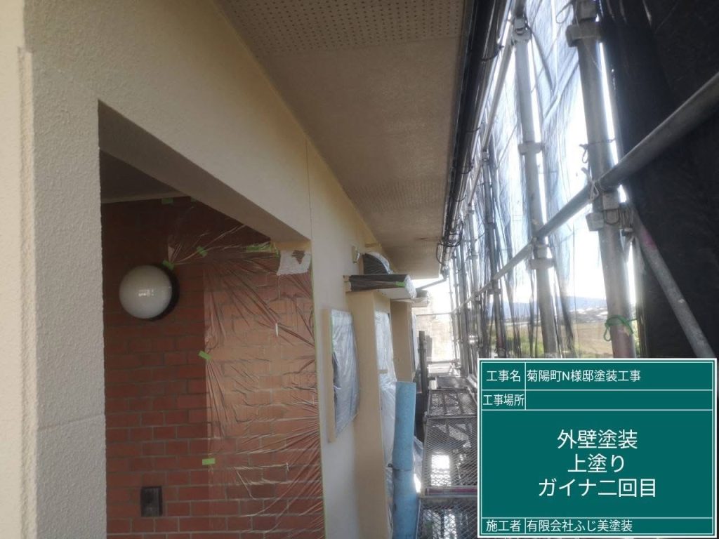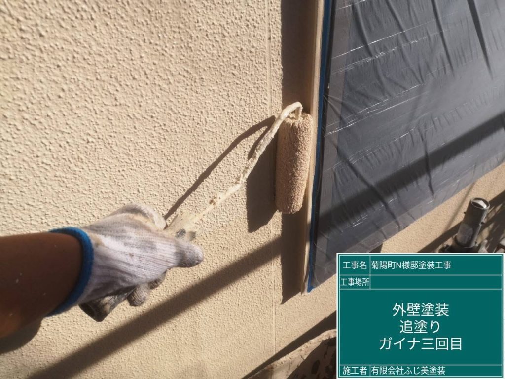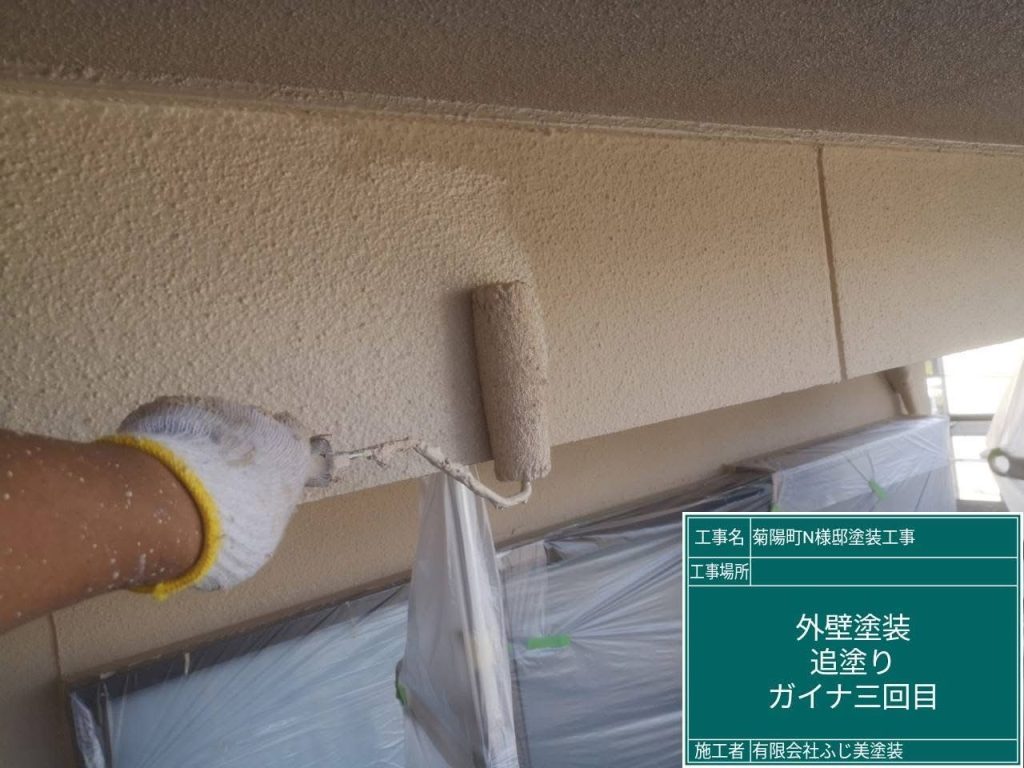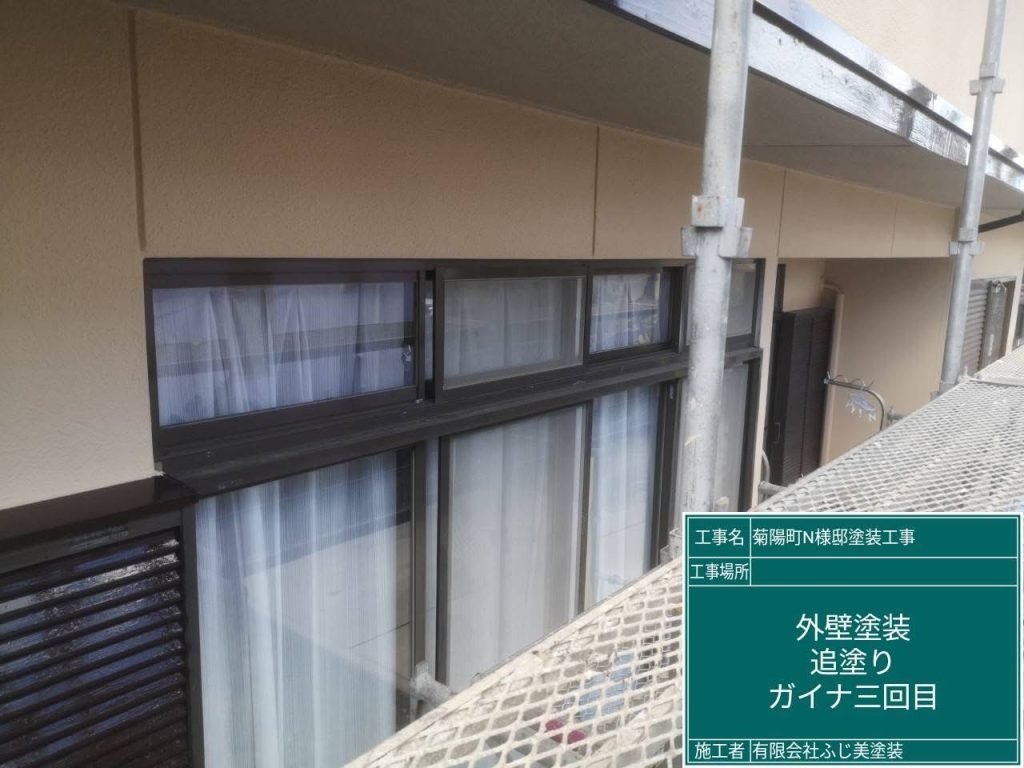 本日は朝より乗り込ませて頂きガイナ塗布1回目からスタートしております。午後よりガイナ塗布2回目を行い、3回目塗布を2階ベランダ内、
