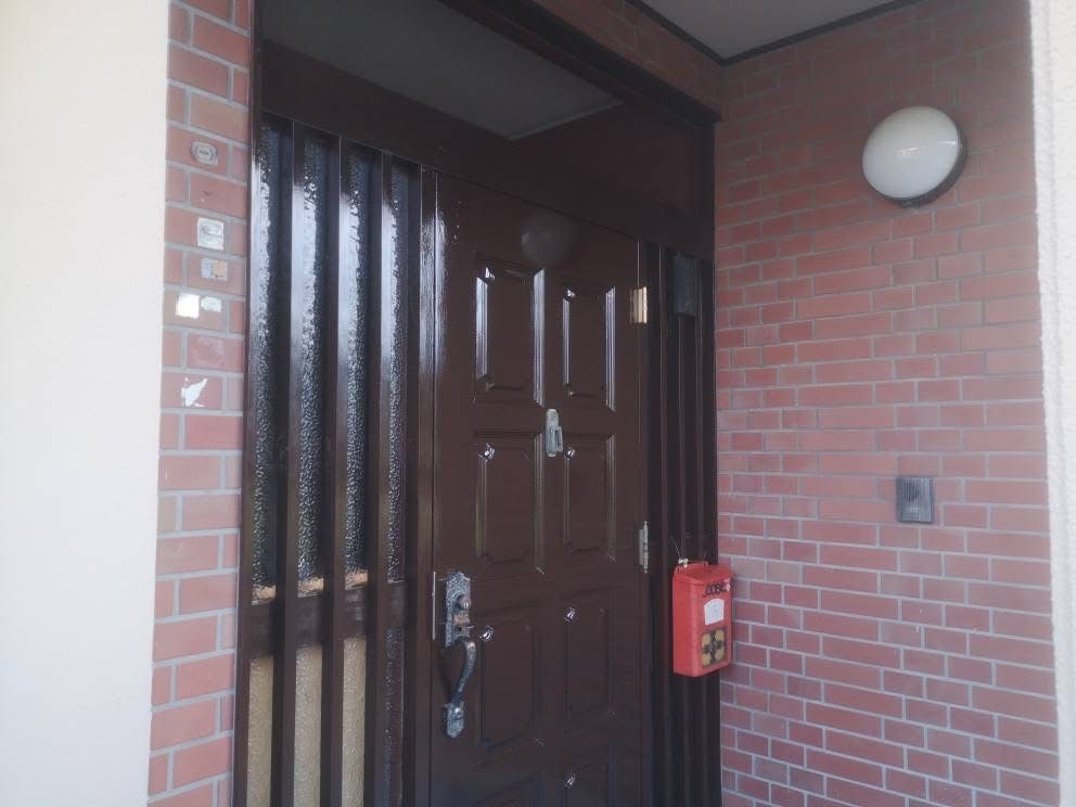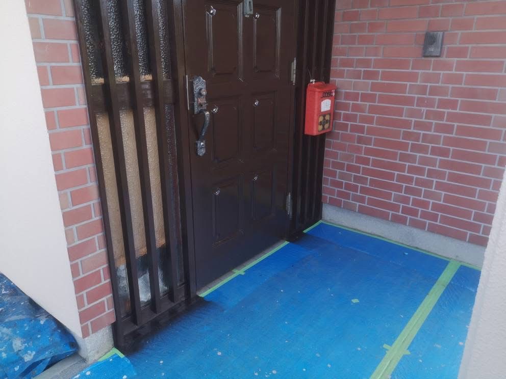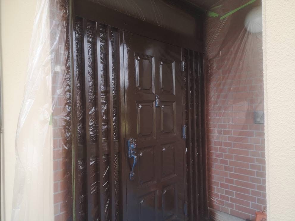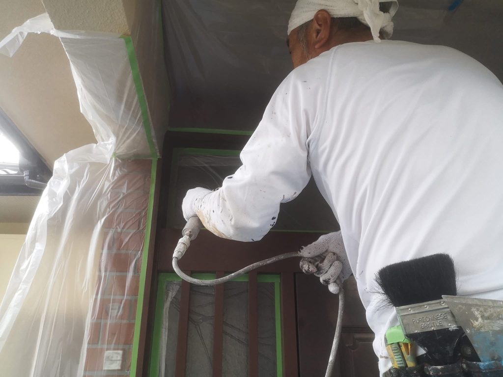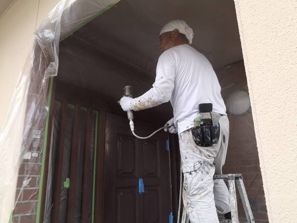 大変お世話になります。本日は朝より乗り込ませて頂き玄関ドア吹付を行なっております。