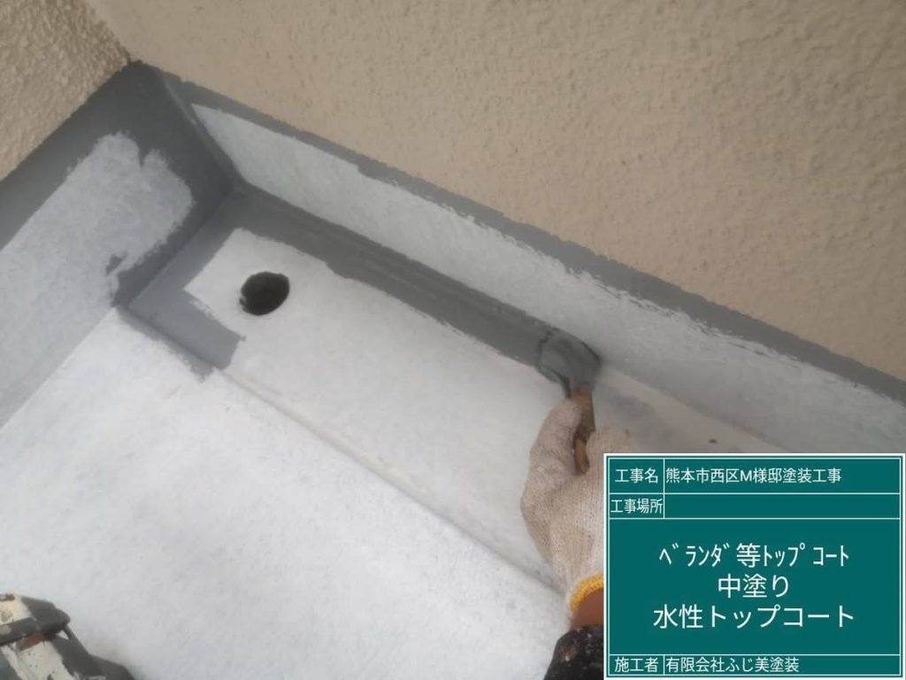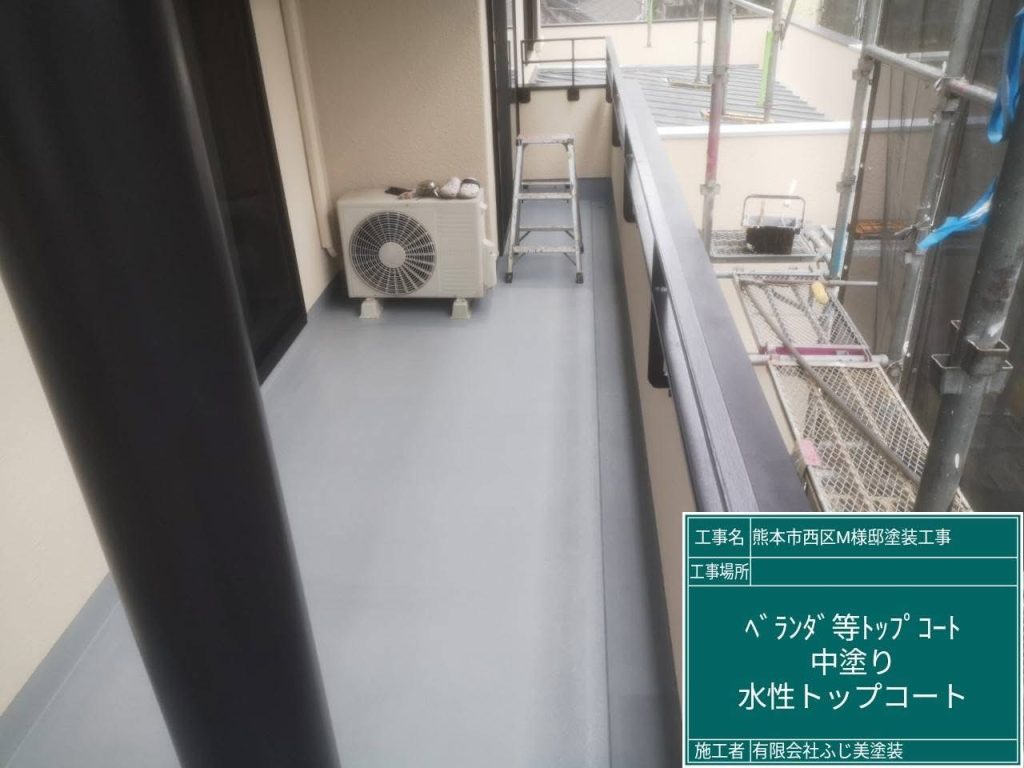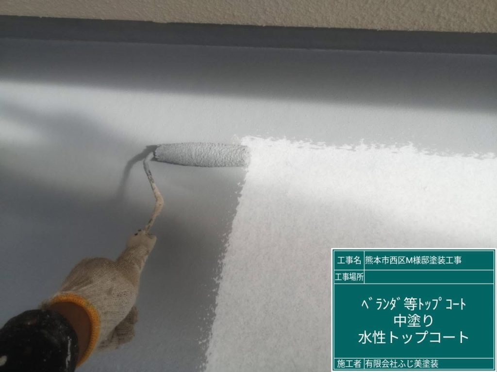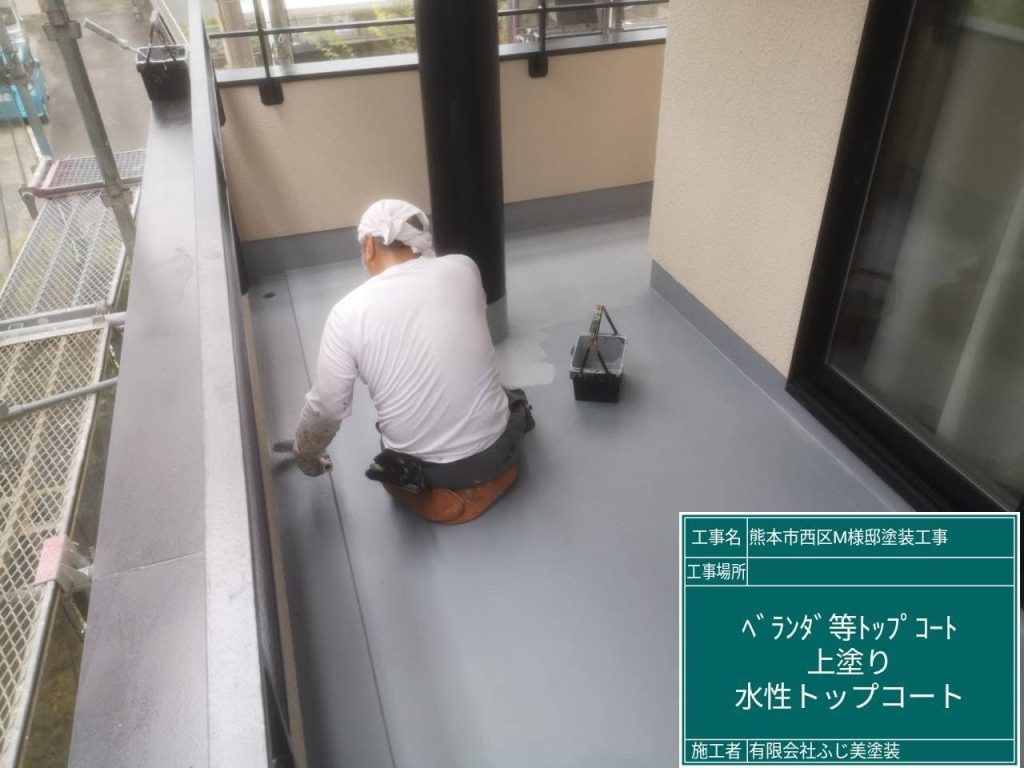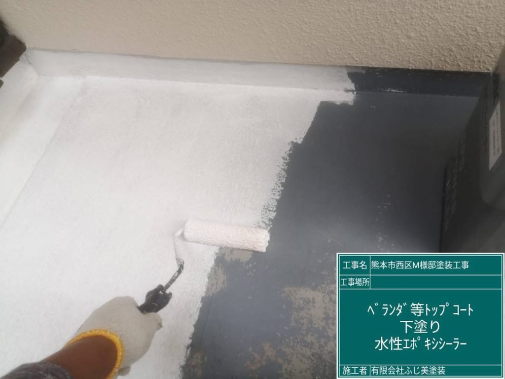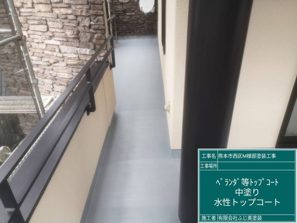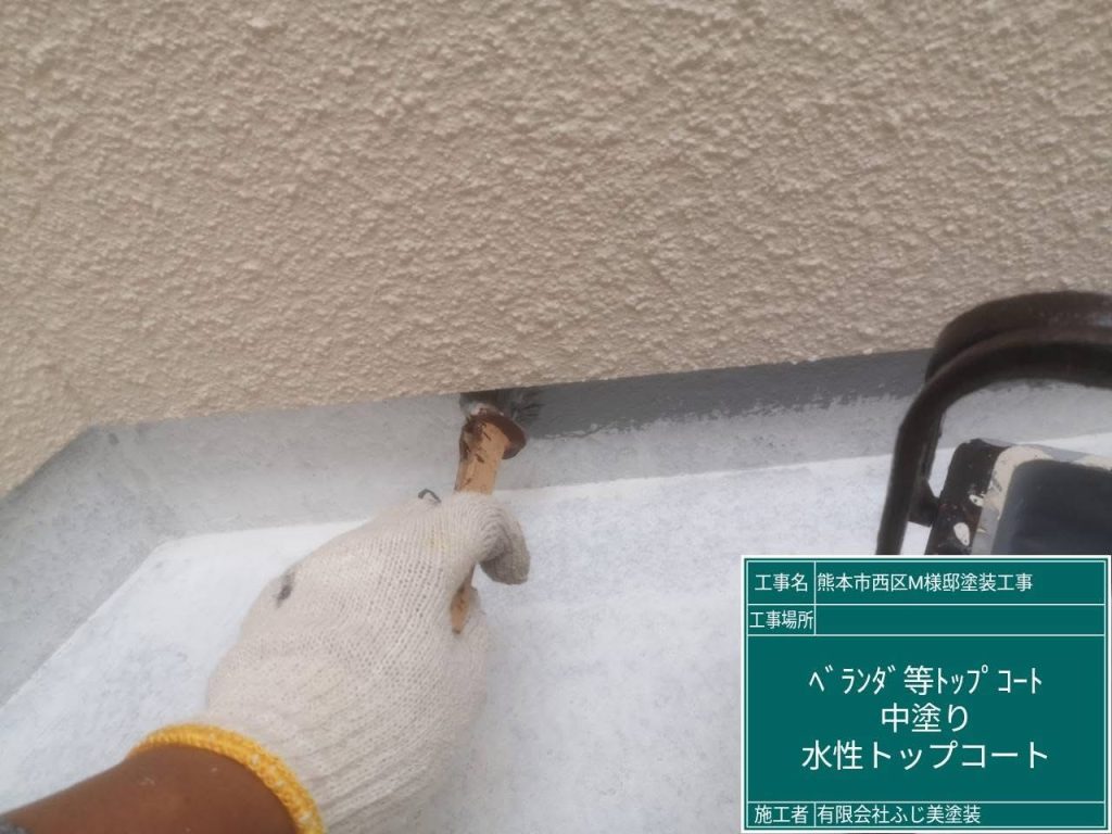 大変お世話になります。本日はお昼前に乗り込ませて頂きベランダ床防水中塗からスタートしております。その後ベランダ防水上塗を行なっております。