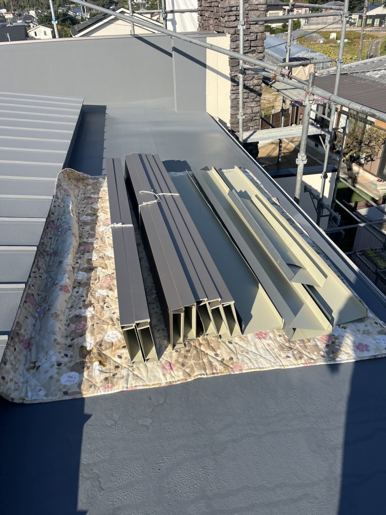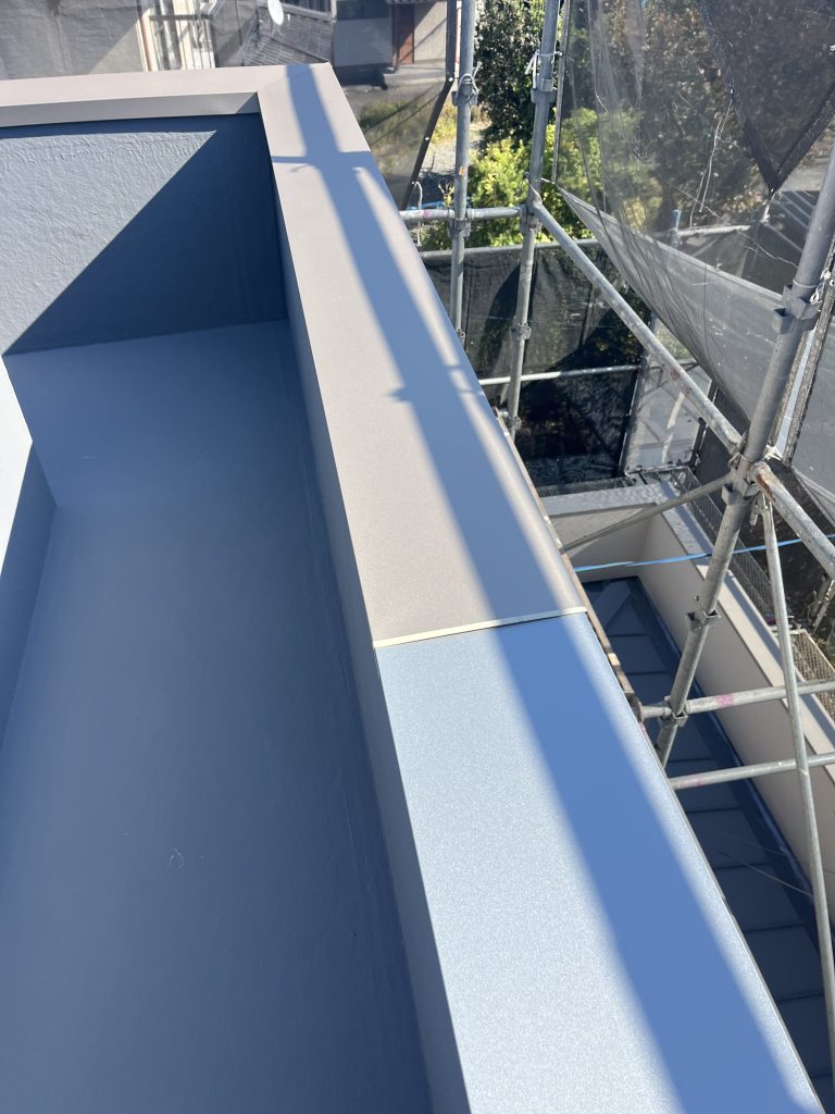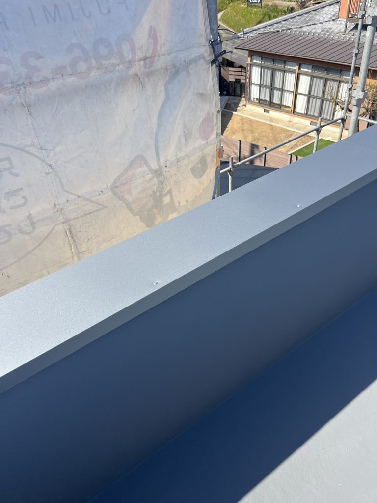 大変お世話になります。本日は笠木取付作業からスタートしております。下地に捨て板金を取付しその上に仕上げ板金を被せております。