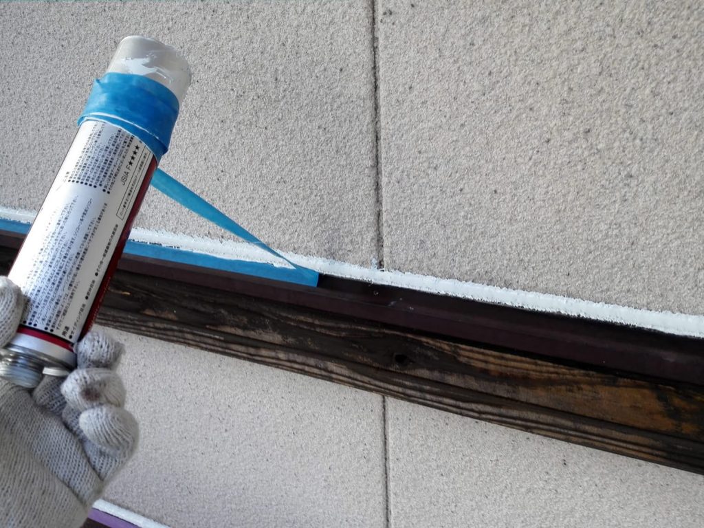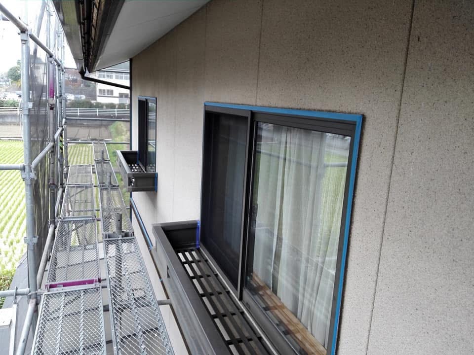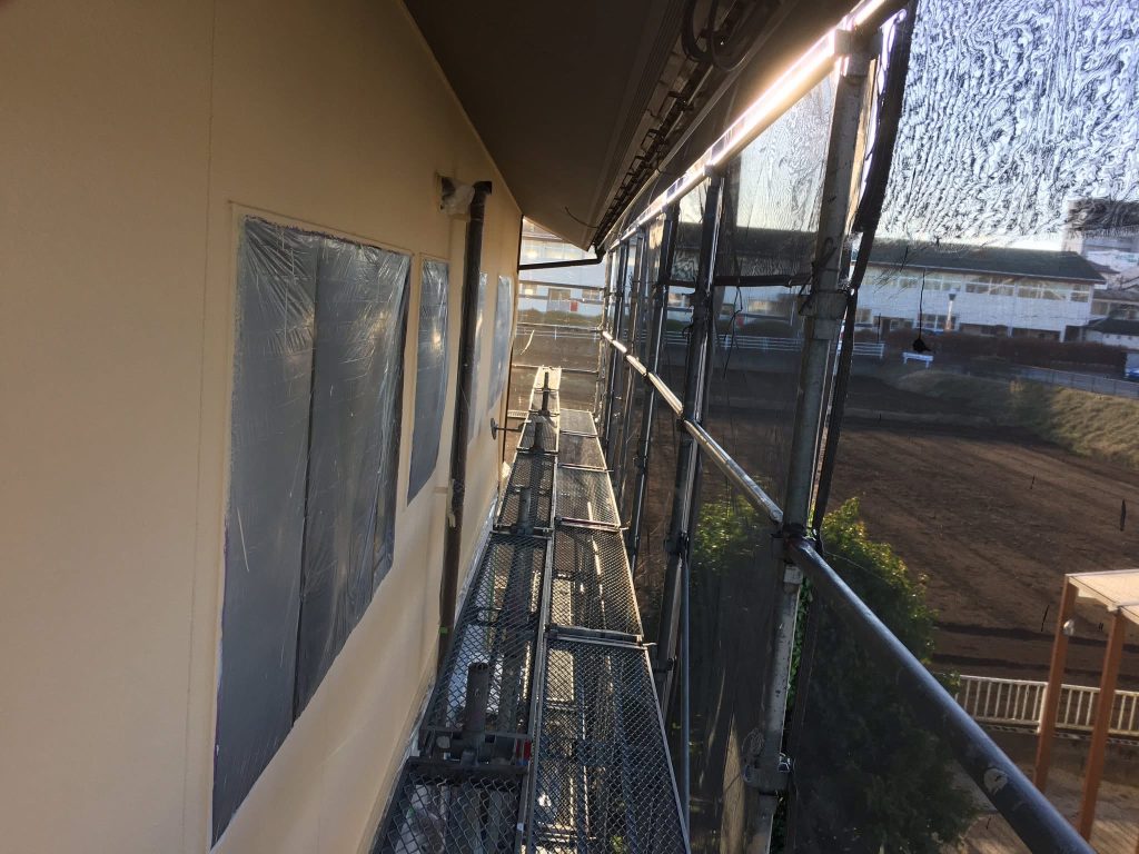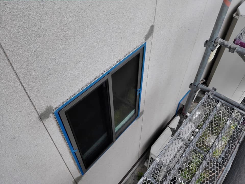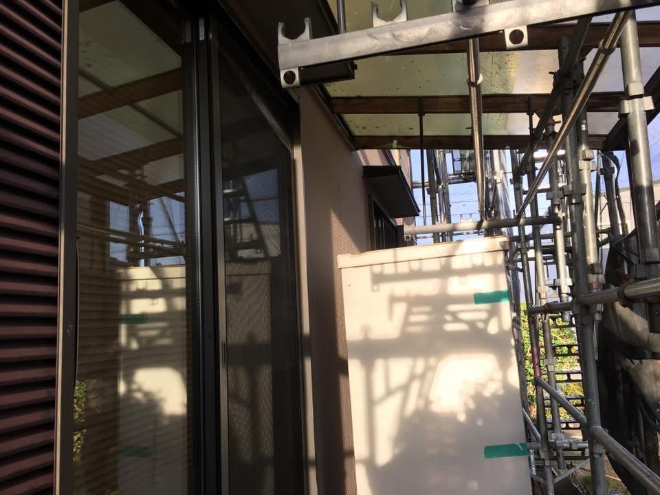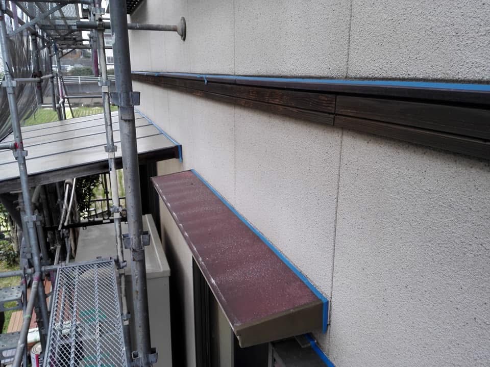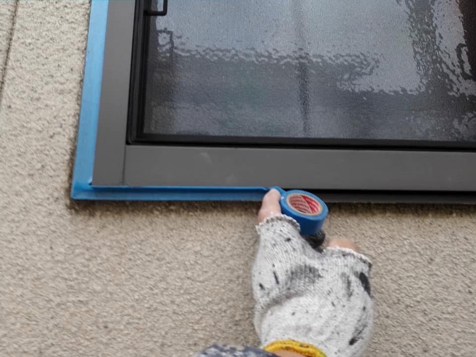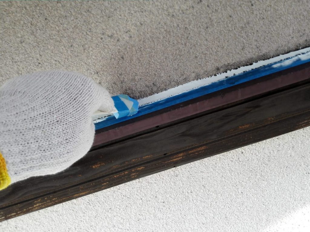 大変お世話になります。本日は朝より乗り込ませて頂きシーリング充填用のマスキングを行なっております。