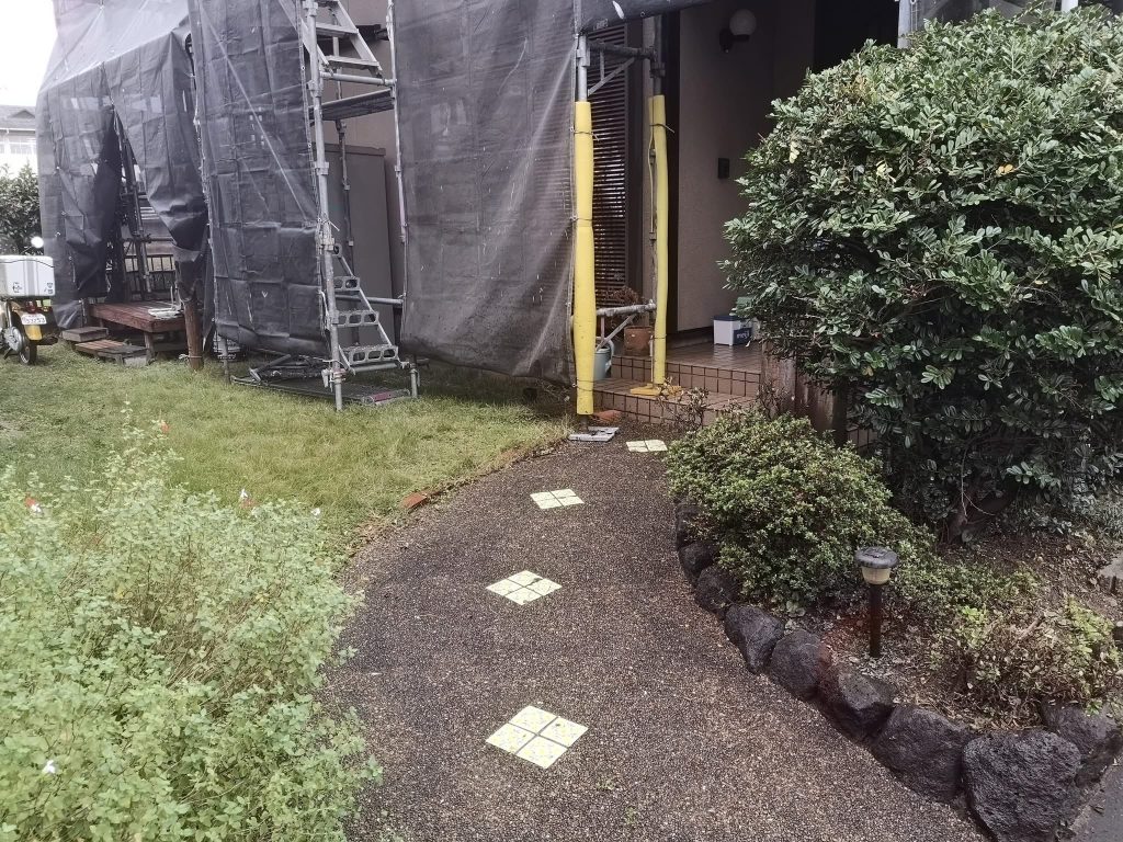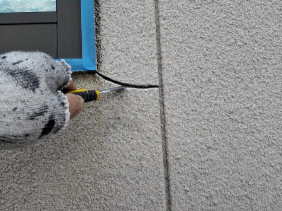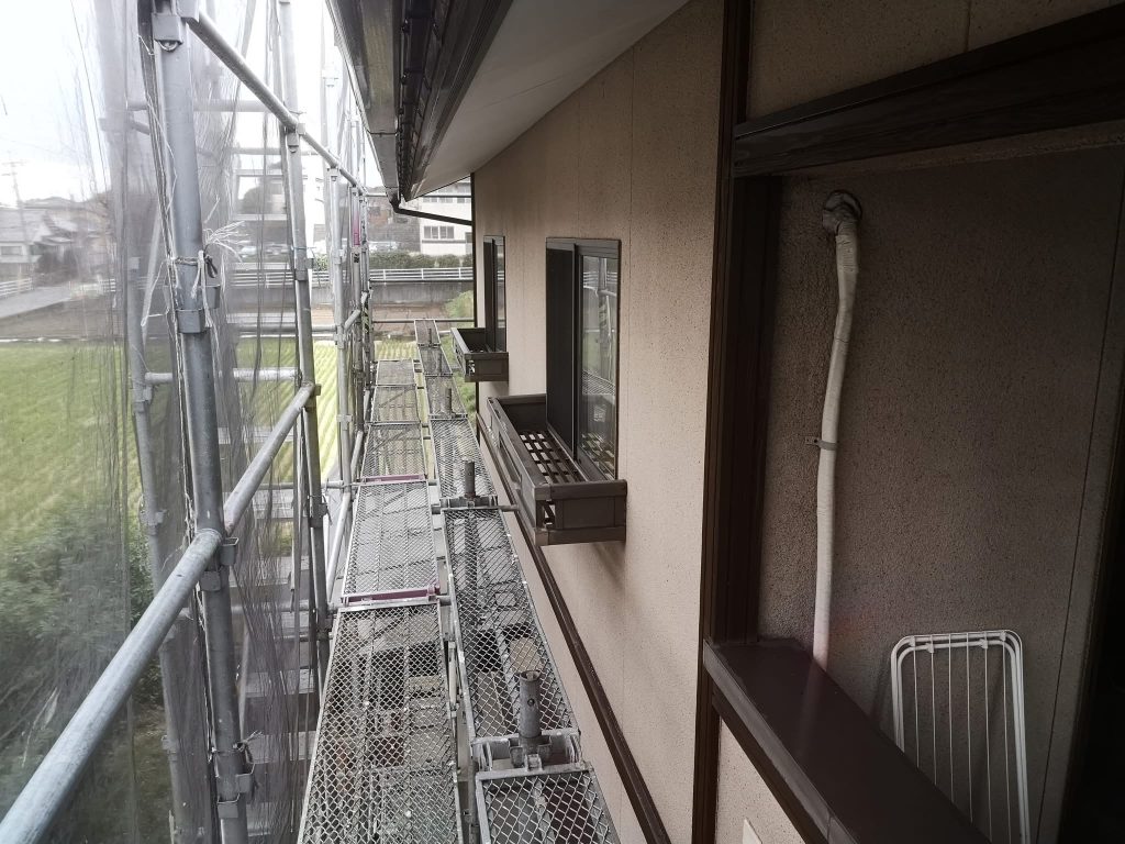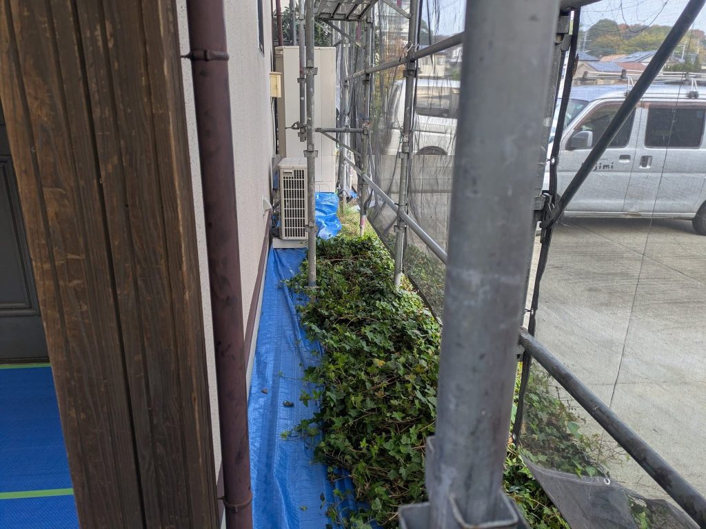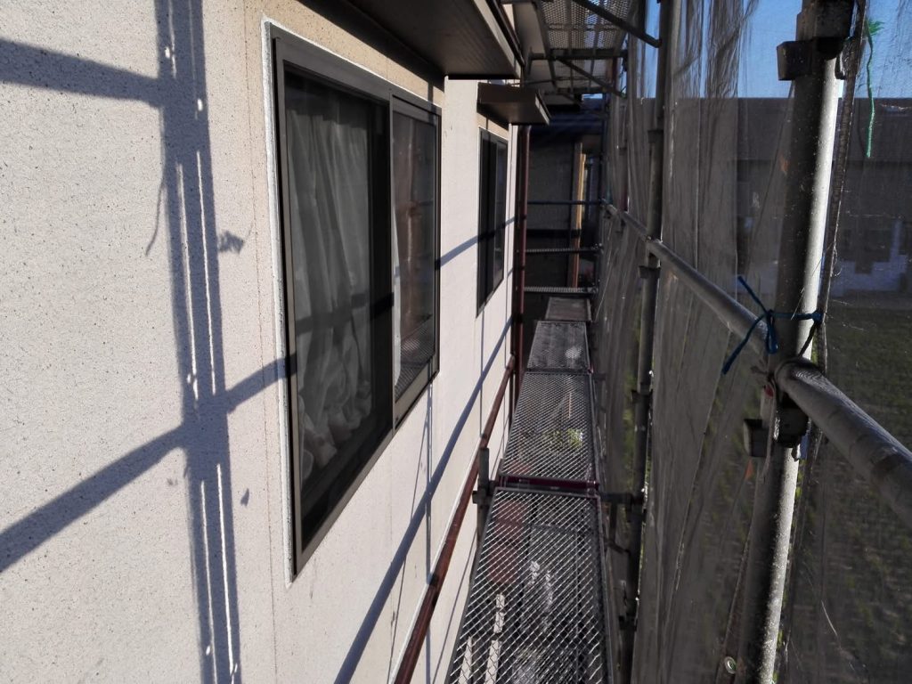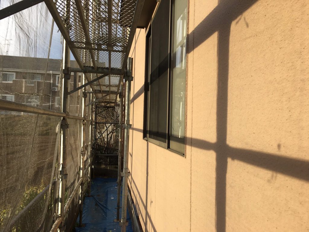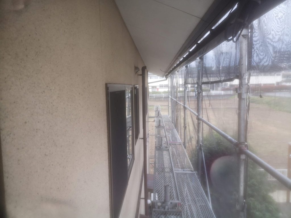 大変お世話になります。本日は朝より乗り込ませて頂きシーリング充填用のマスキングを行なっております。
