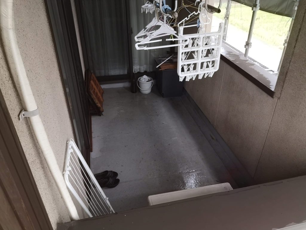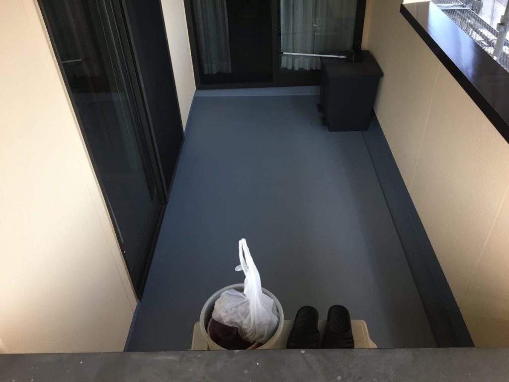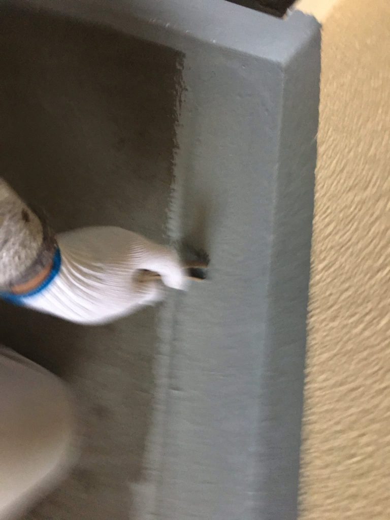 大変お世話になります。本日は朝より雨模様でしたのでベランダ内、床部の防水材塗布をさせて頂きました。午前中1回塗布、午後より2回目塗布を行なっております。