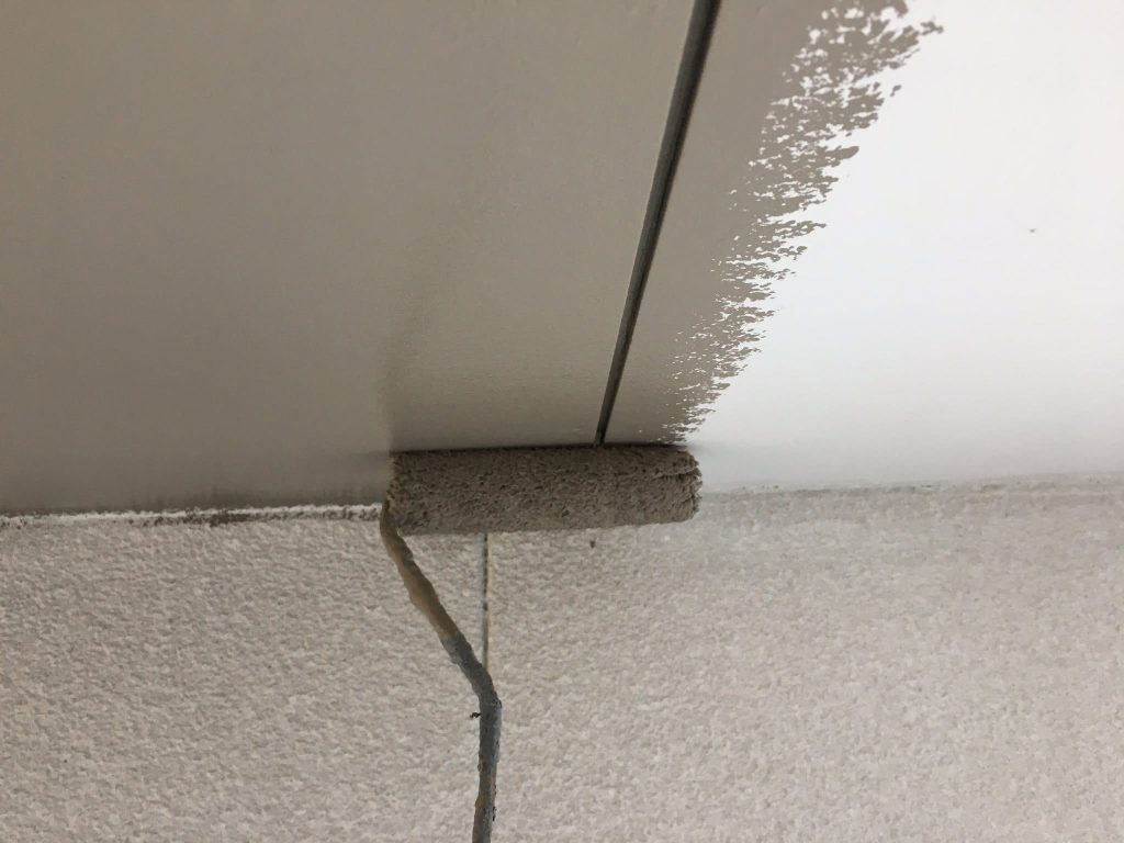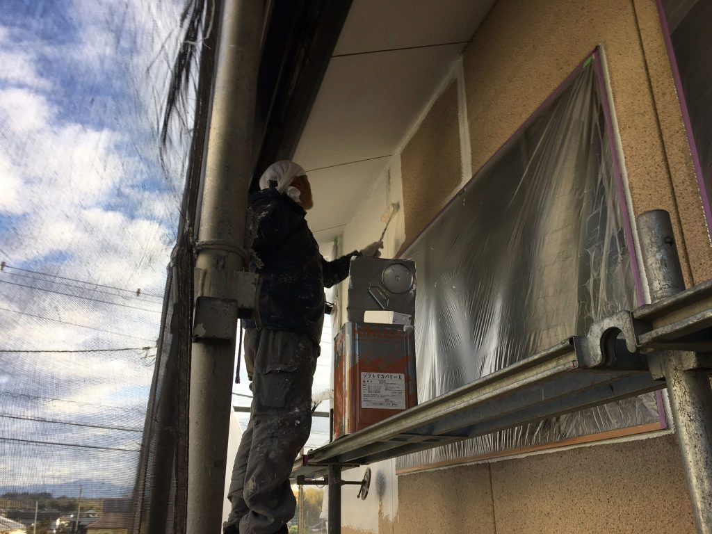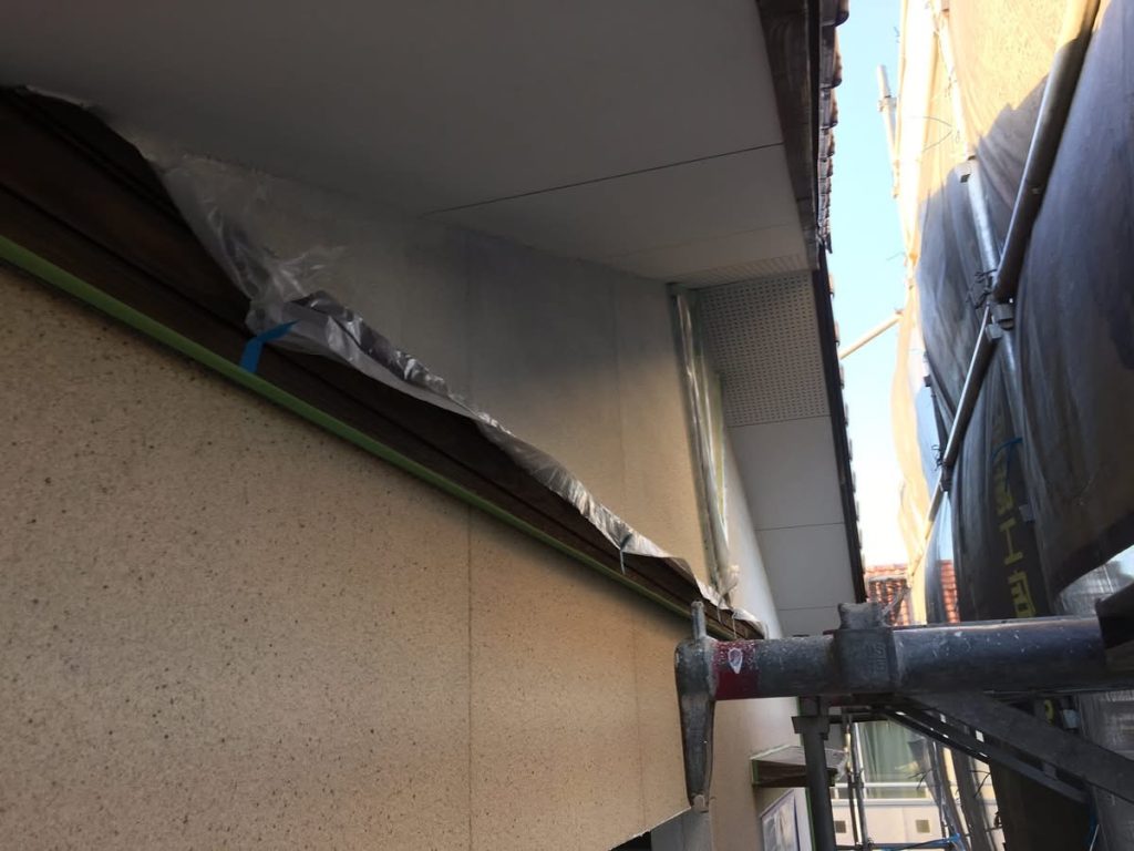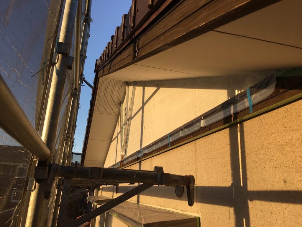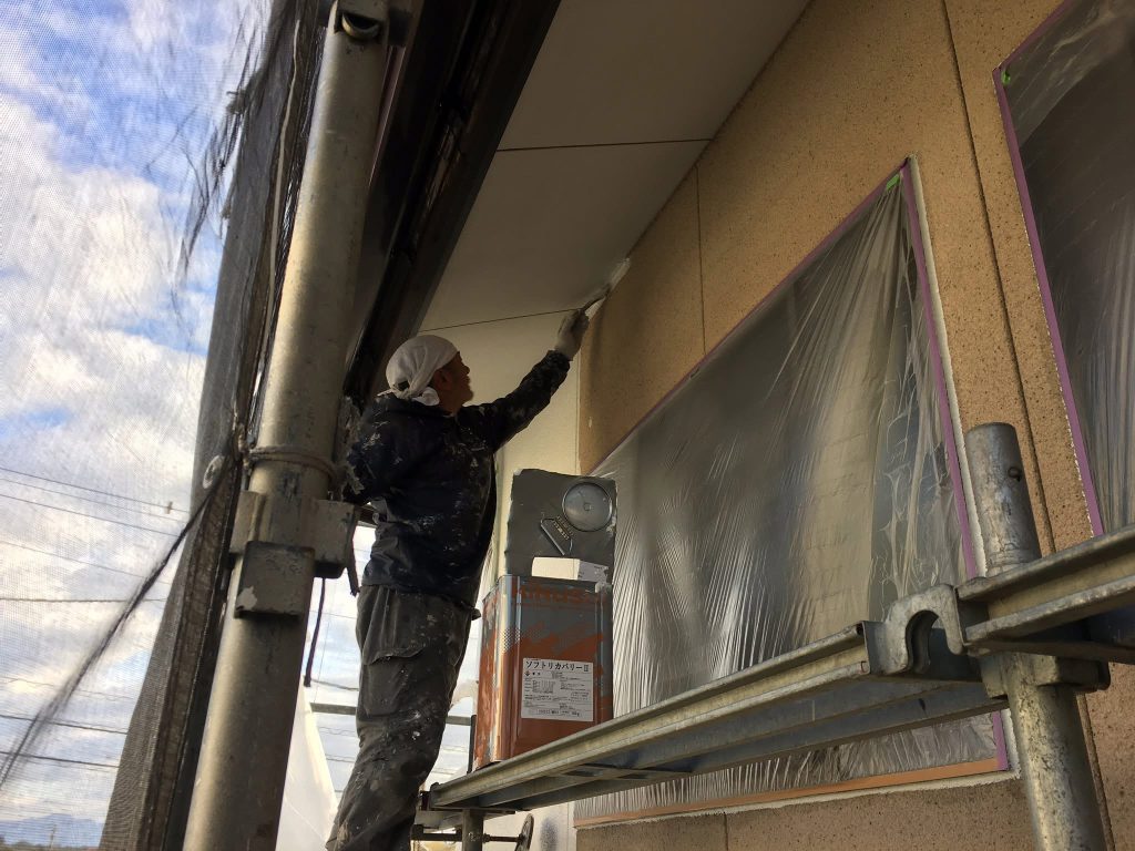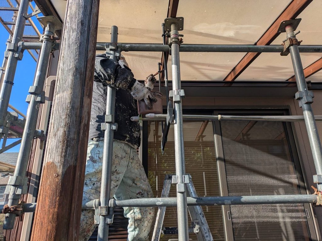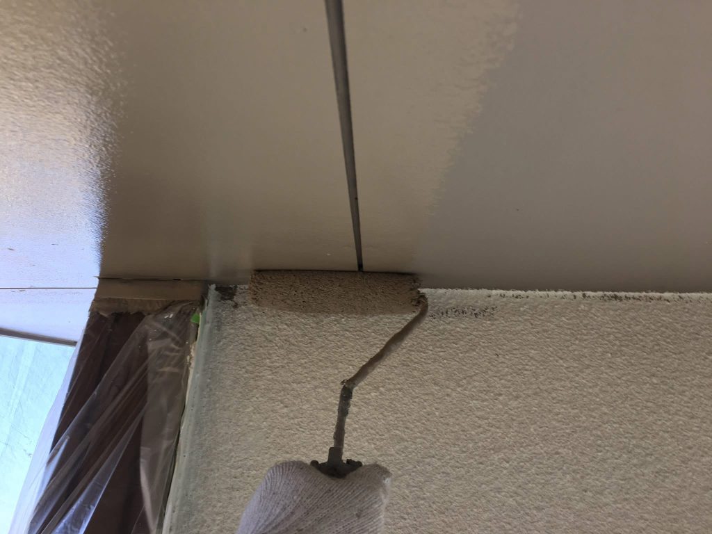 大変お世話になります。本日は朝より乗り込ませて頂き軒天井塗布を行なっております。