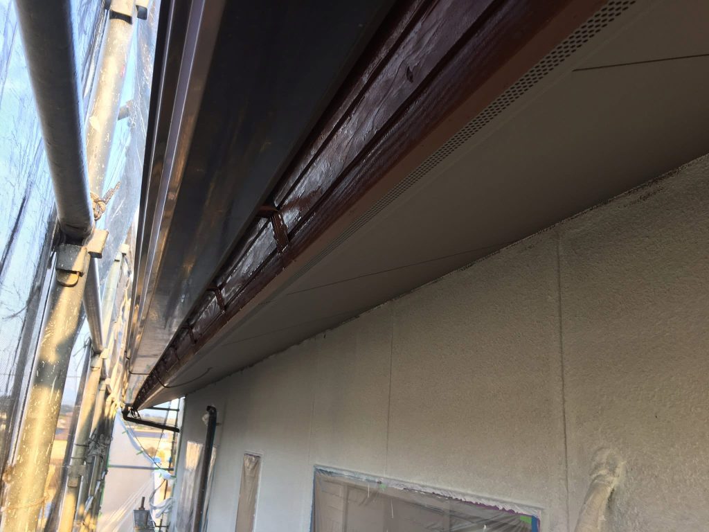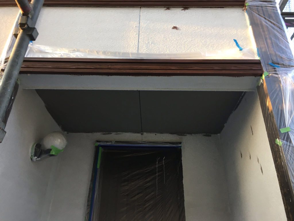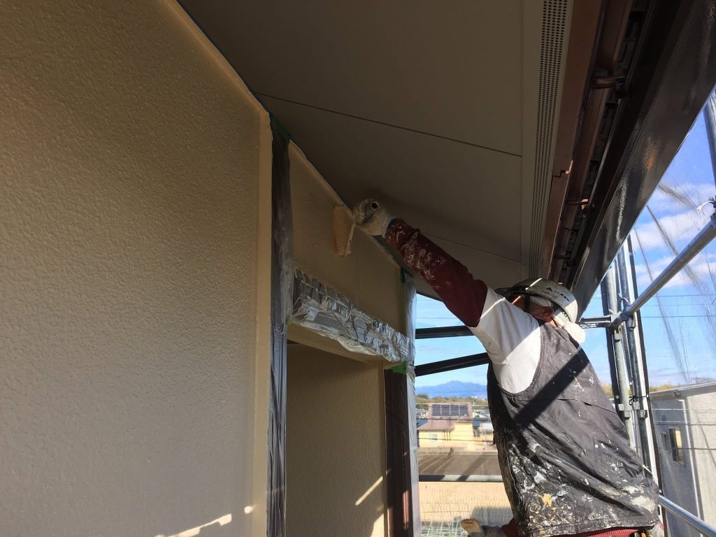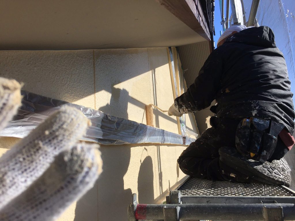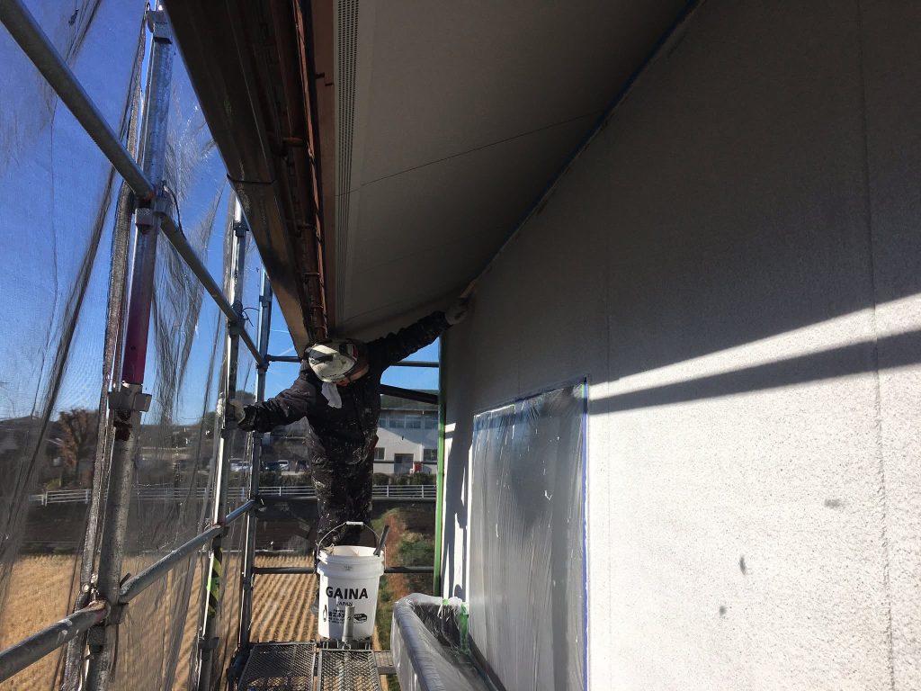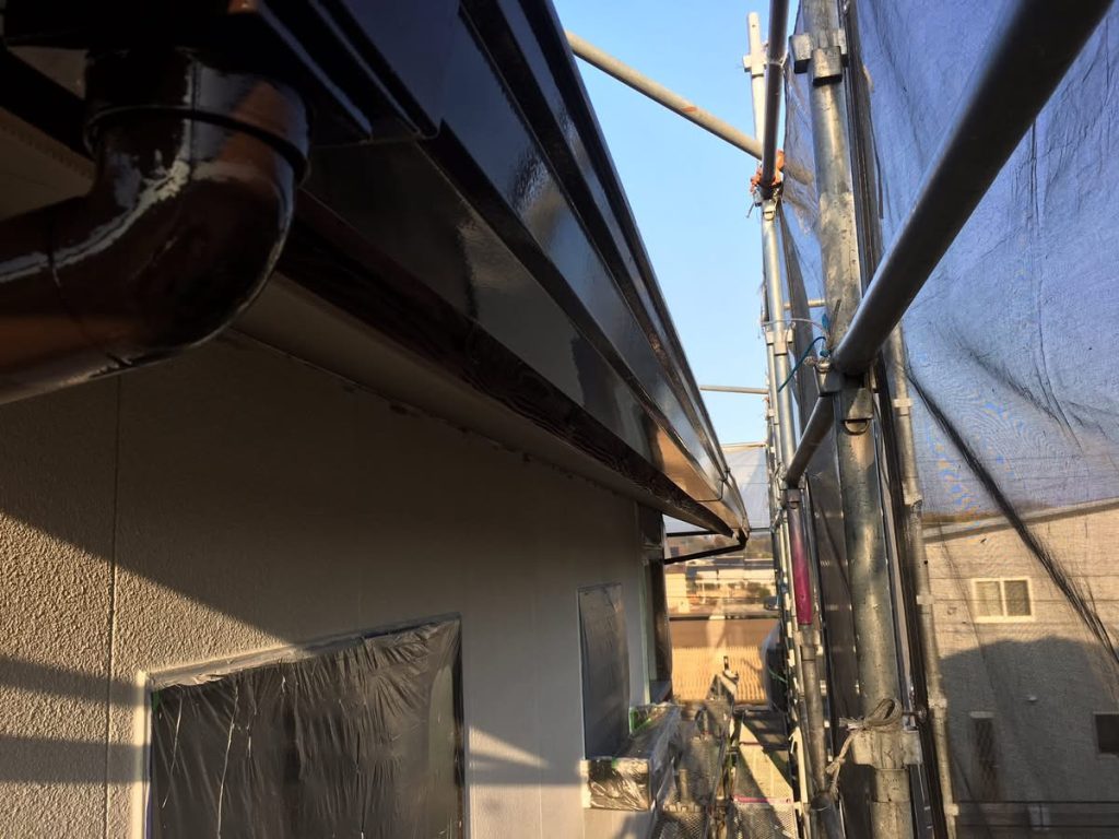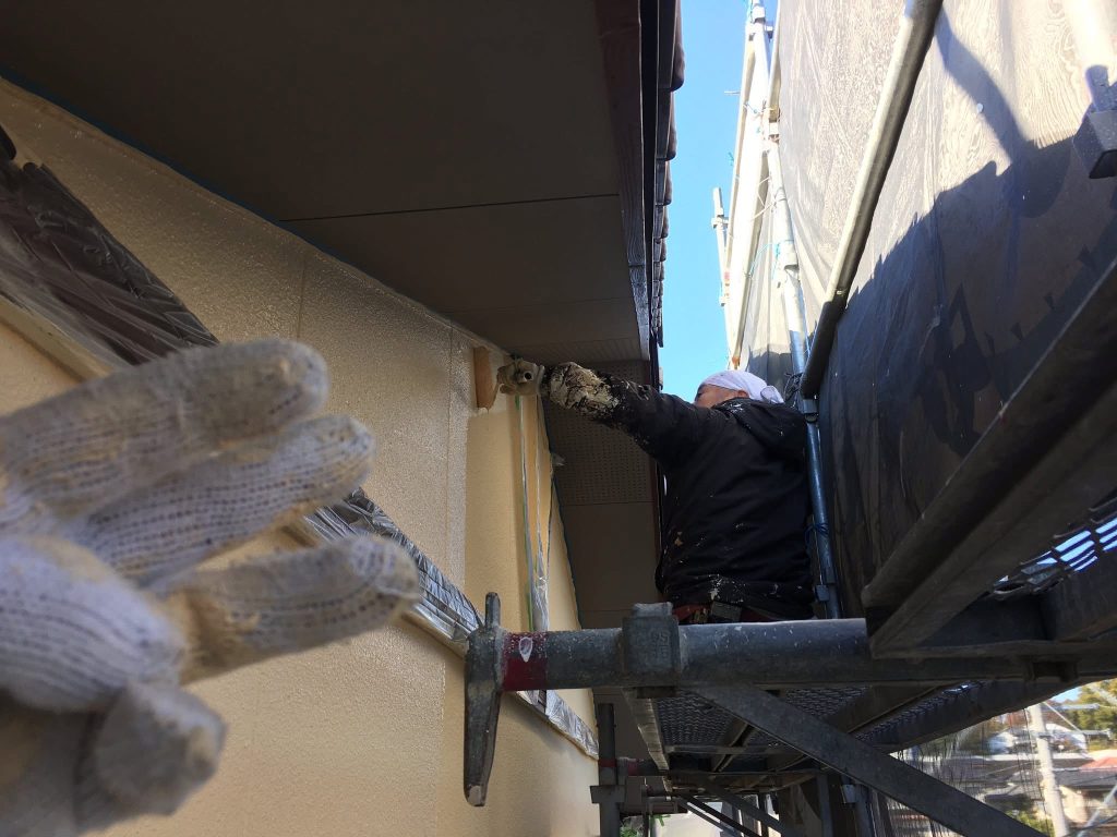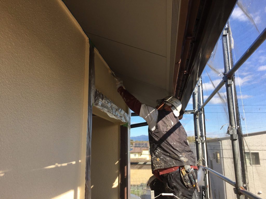 大変お世話になります。本日は朝より乗り込ませて頂き軒天井塗布を行なっております。