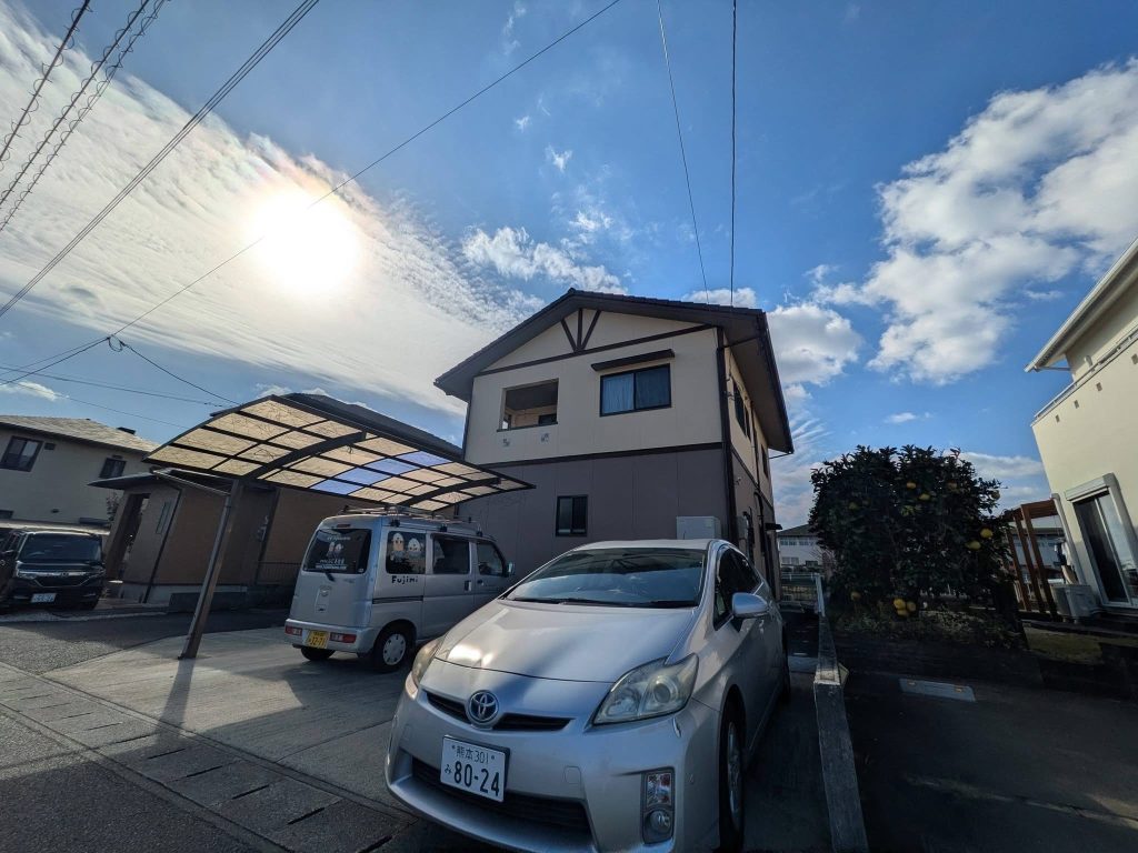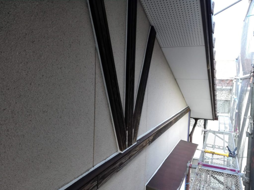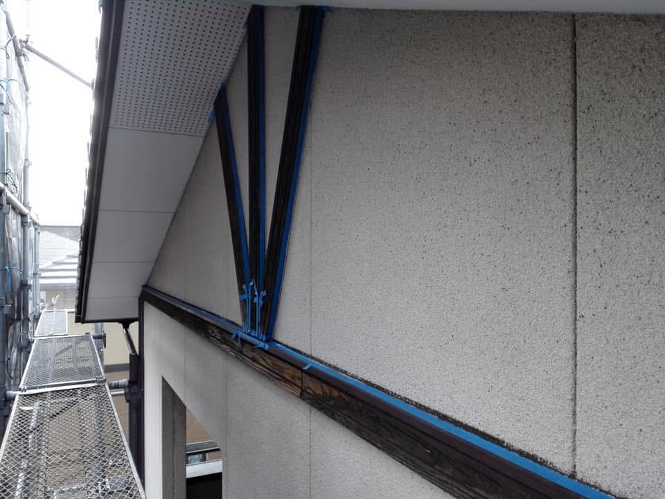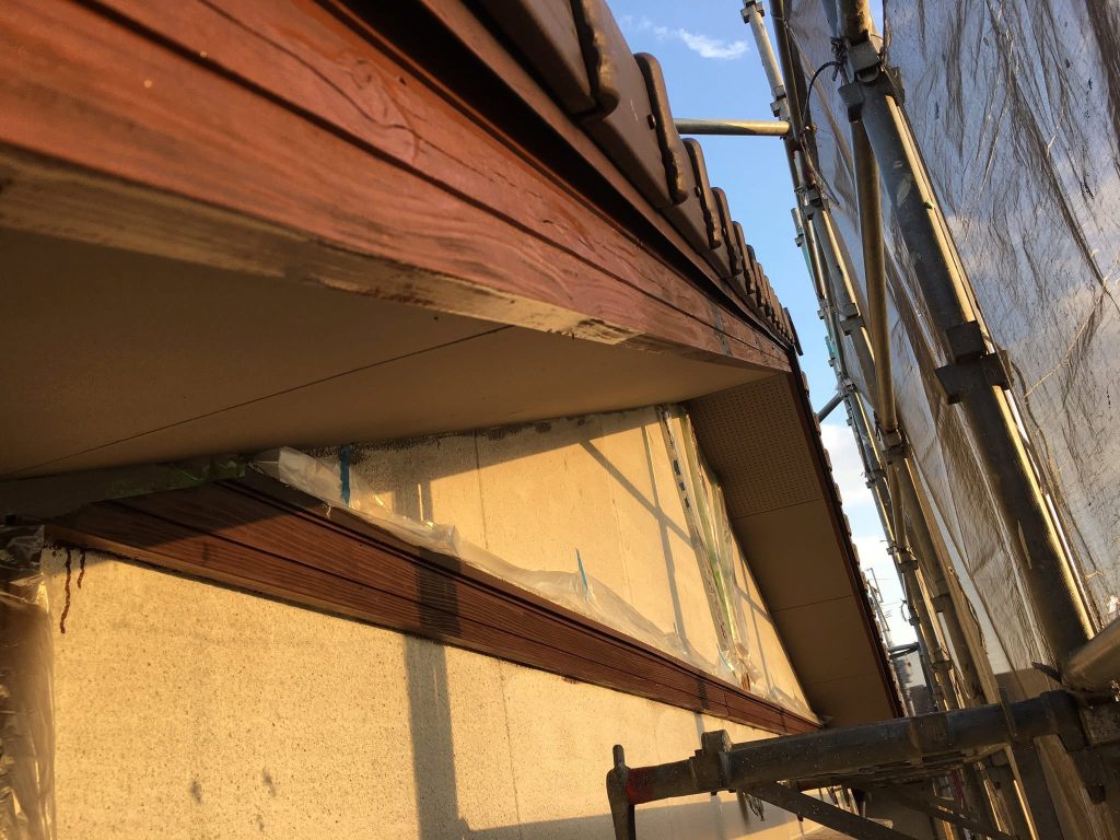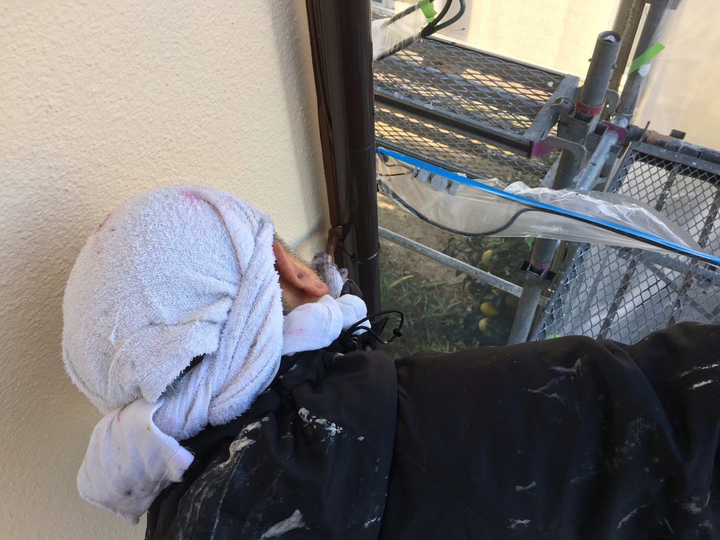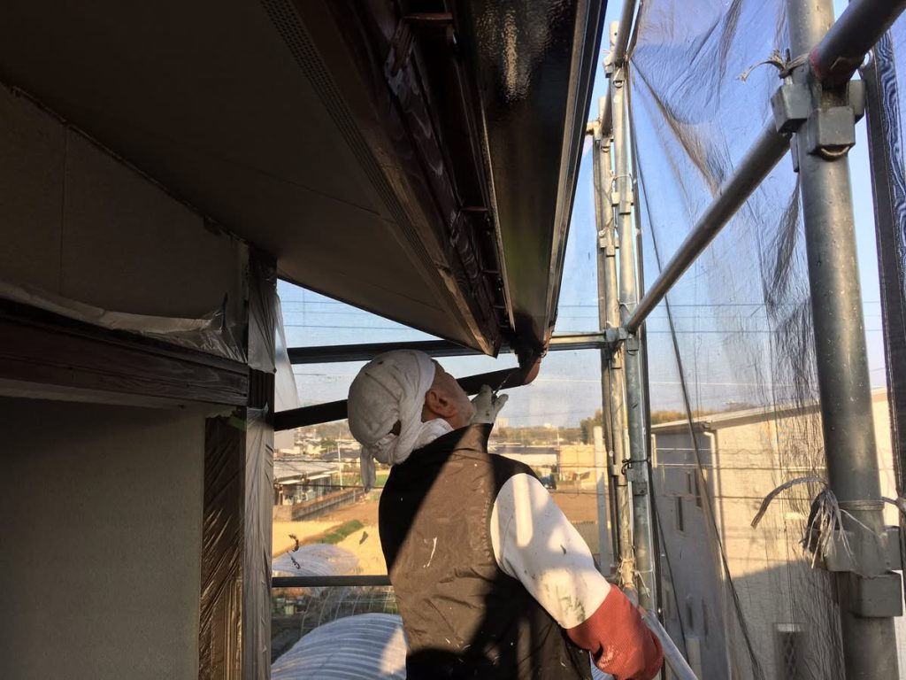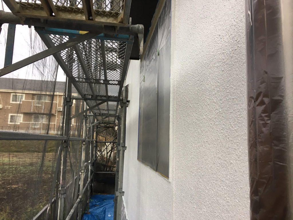 大変お世話になります。本日は朝より乗り込ませて頂き軒天井塗布を行なっております。