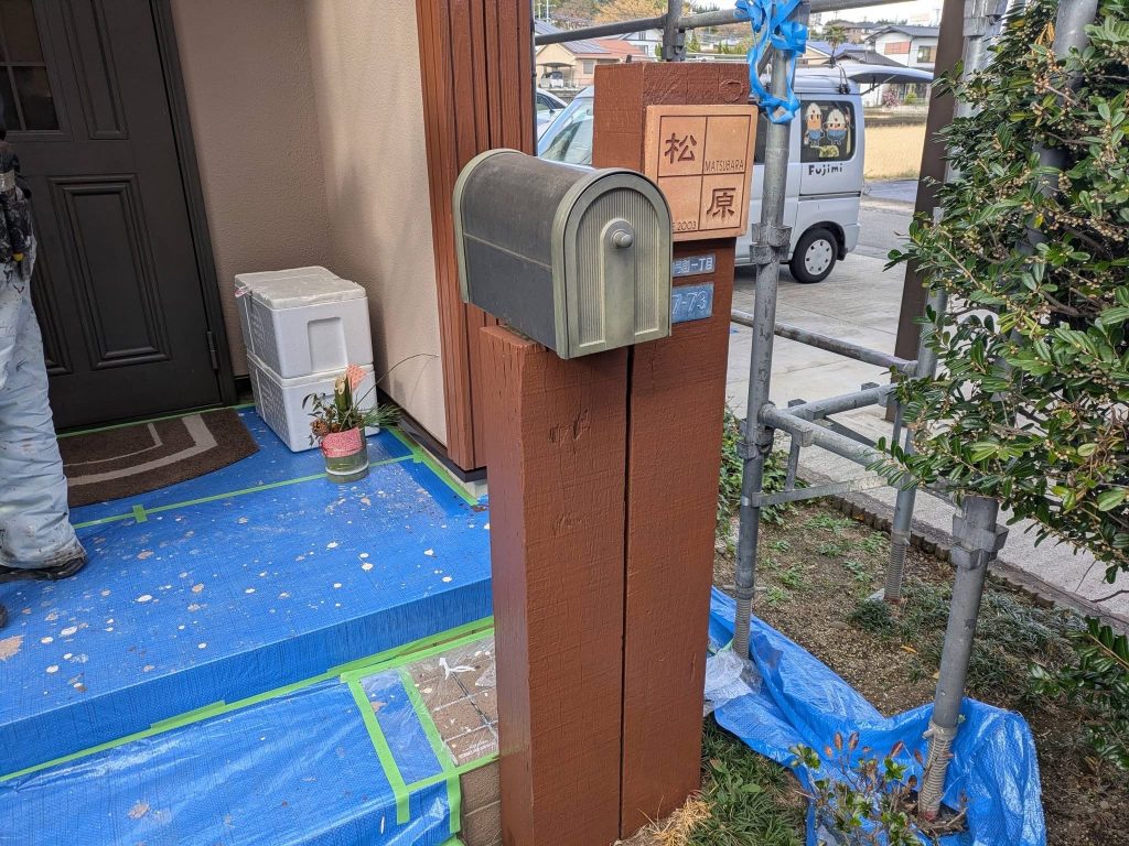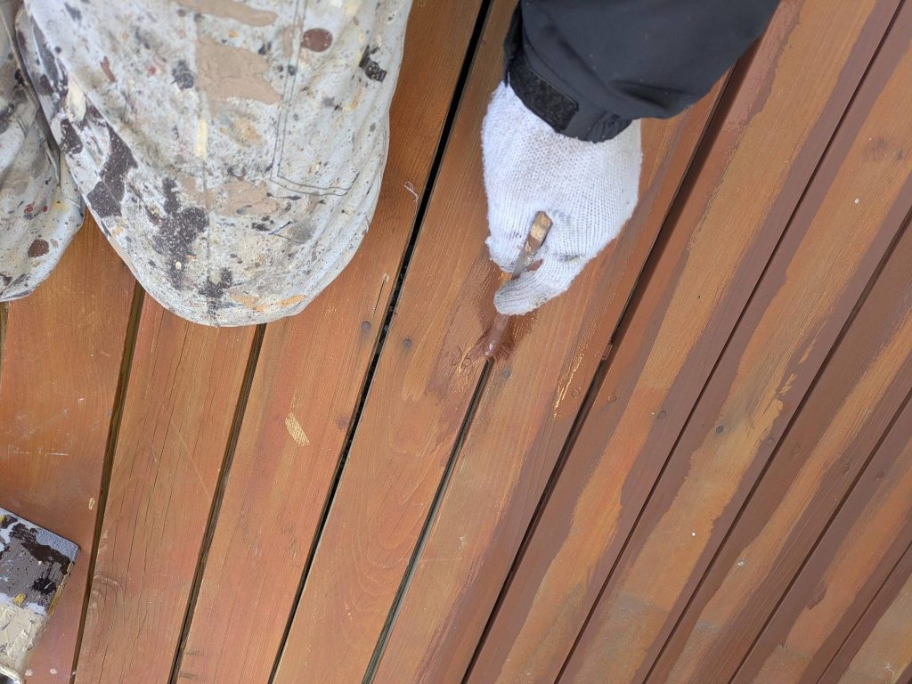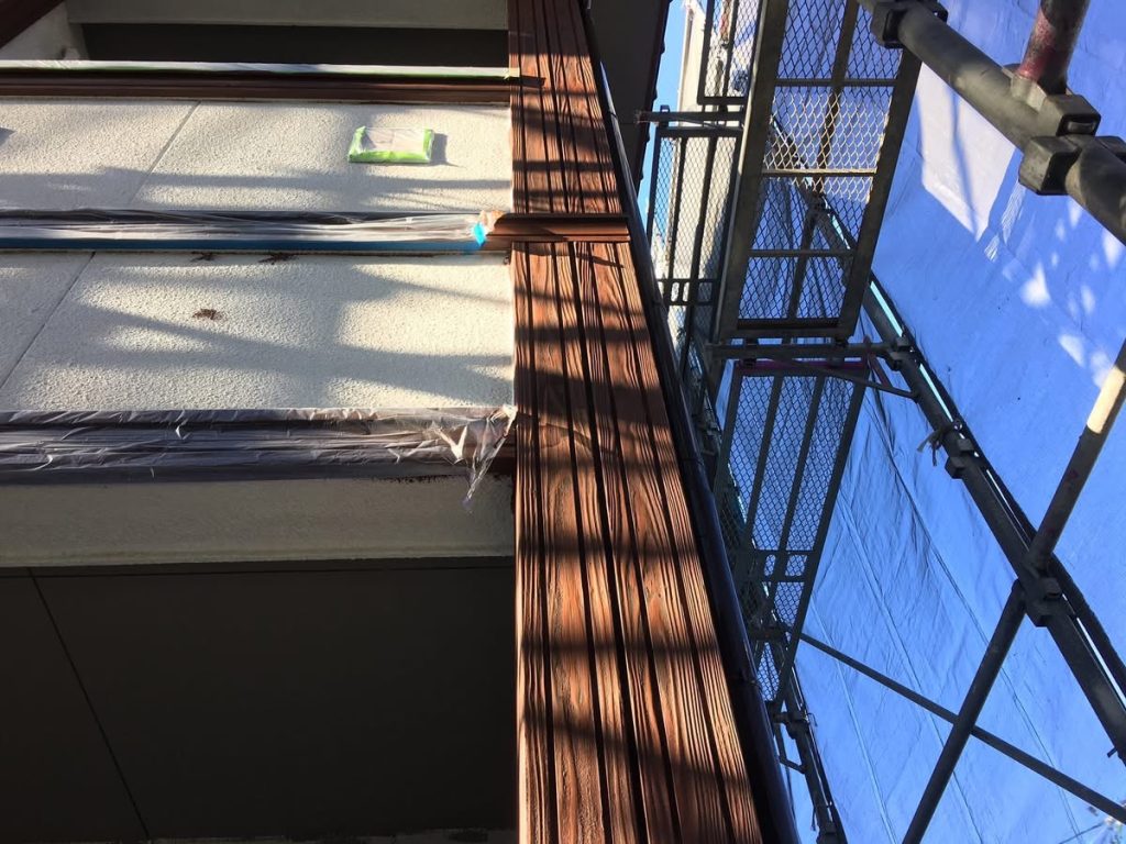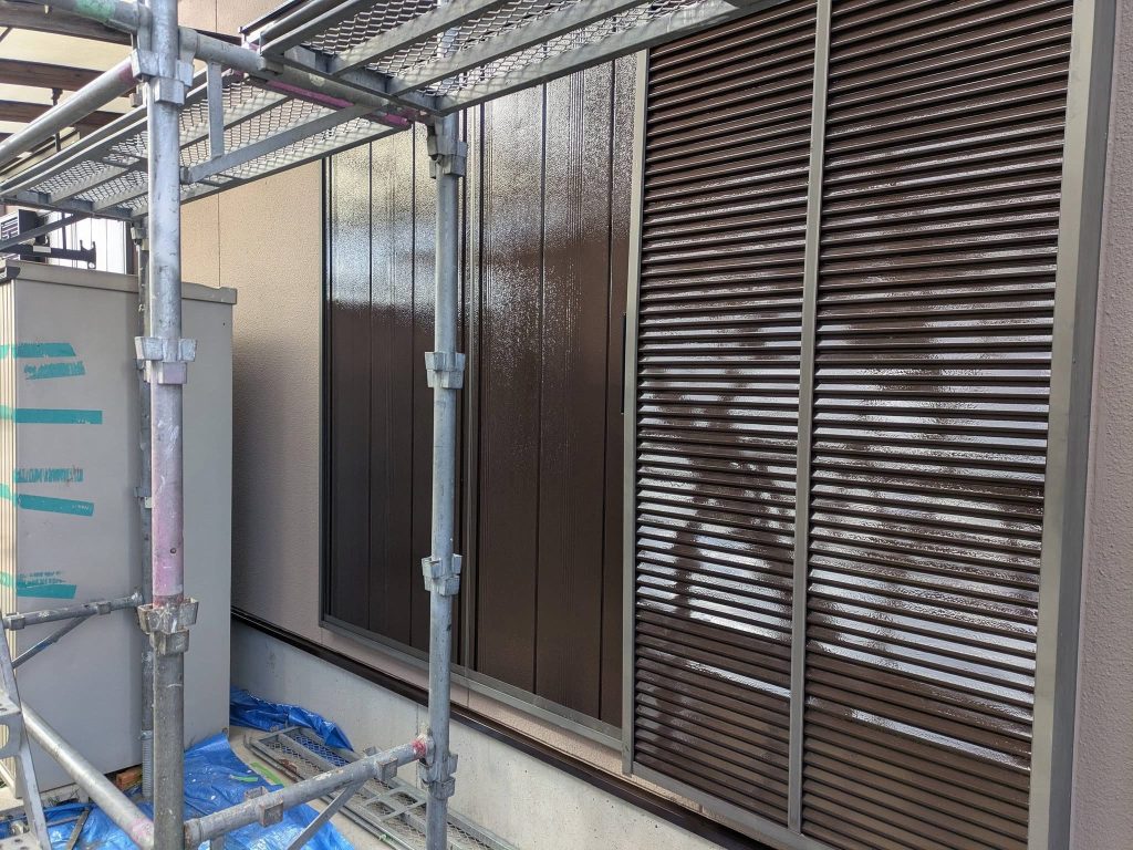 平行しながらテラスのさん木の補強、雨戸塗布、門柱塗布など塗布しております。