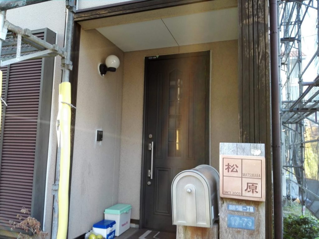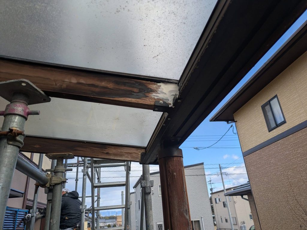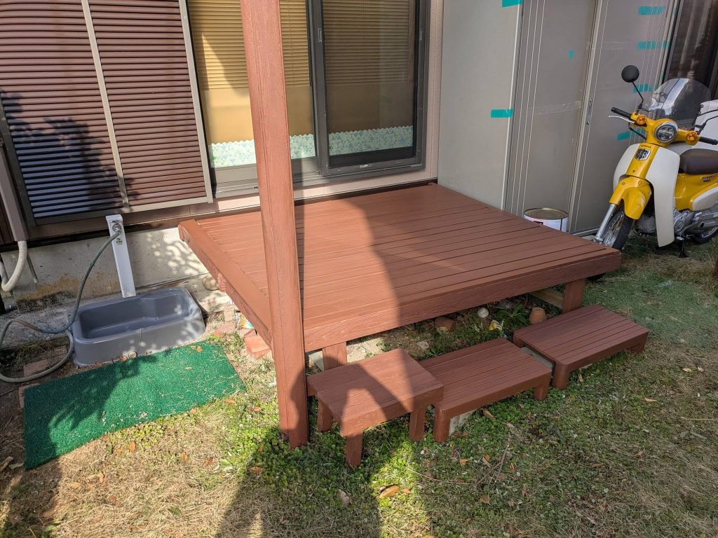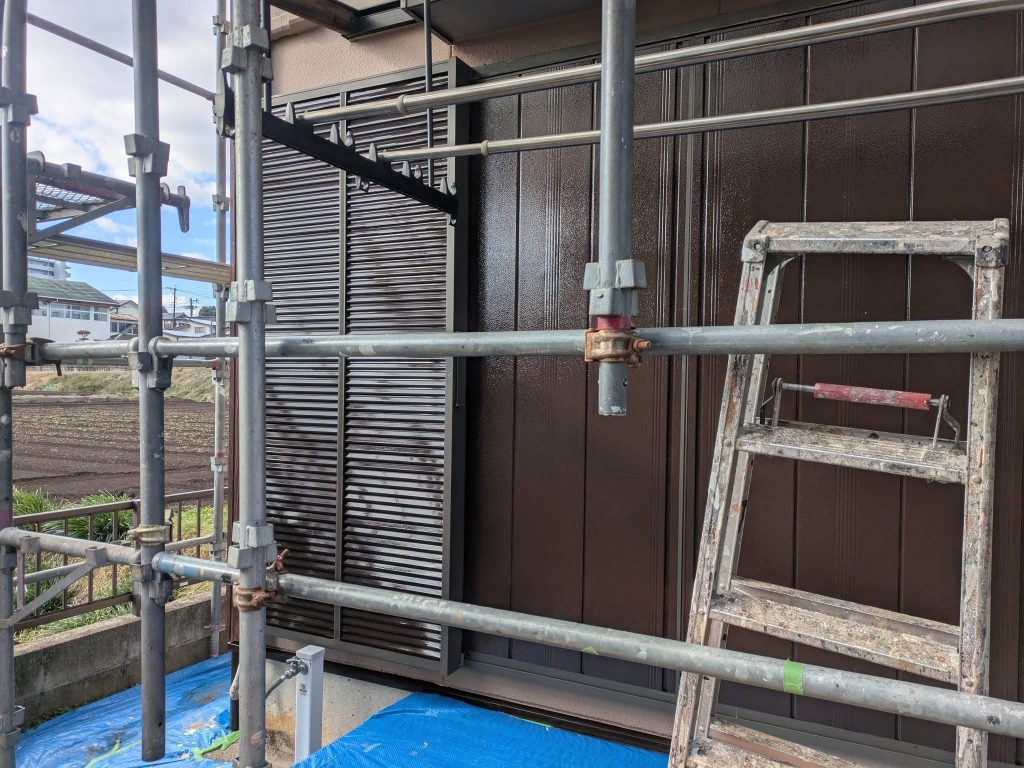 平行しながらテラスのさん木の補強、雨戸塗布、門柱塗布など塗布しております。