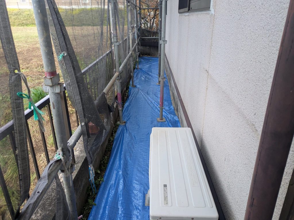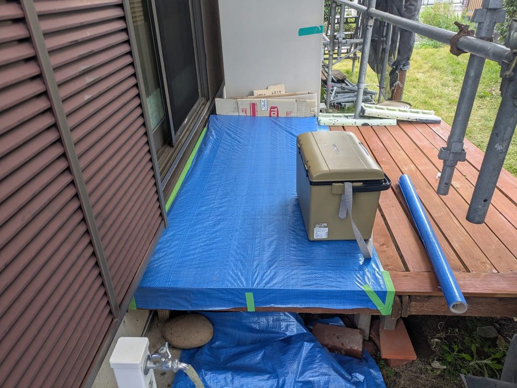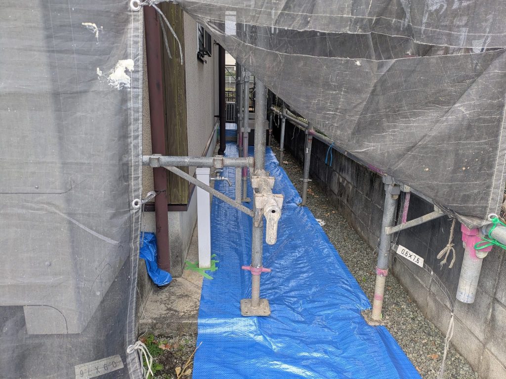 大変お世話になります。本日は朝より乗り込ませて頂き下部ブルーシート張りを行なっております。