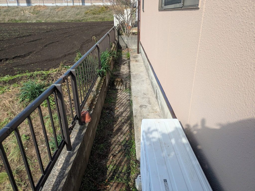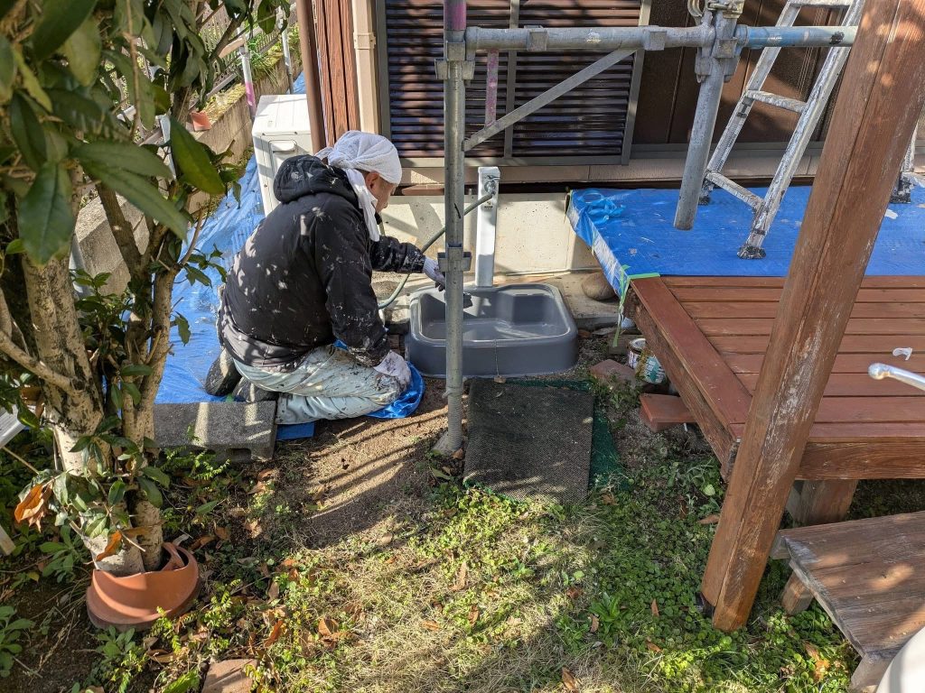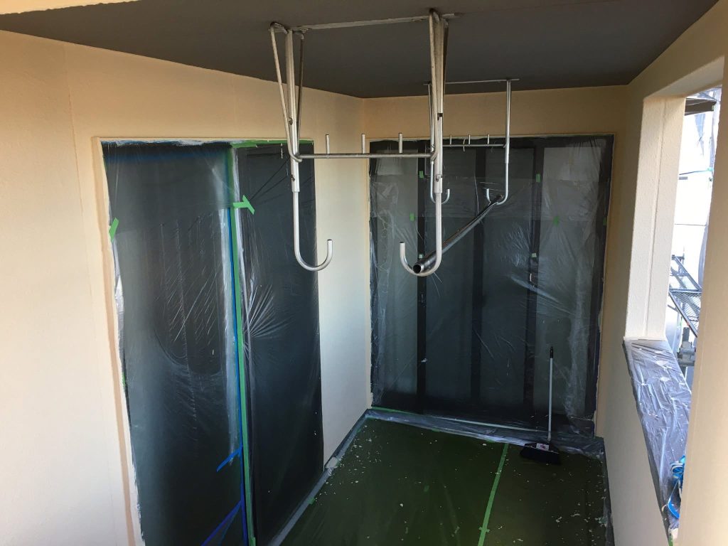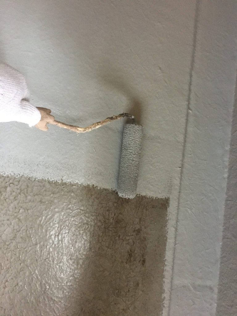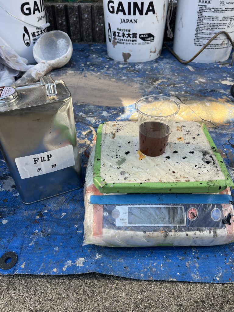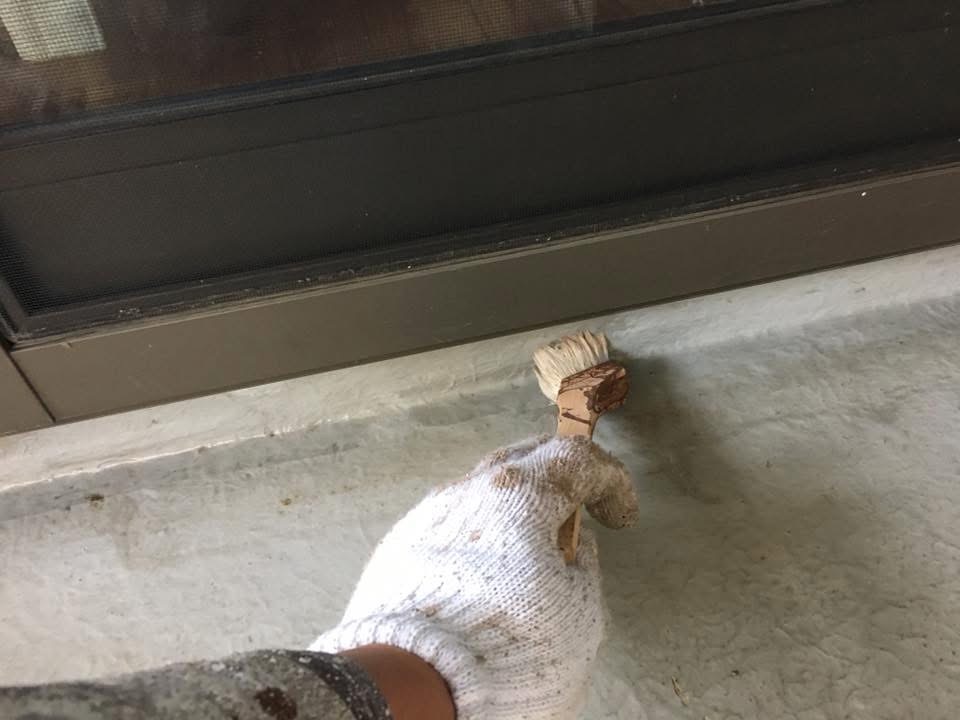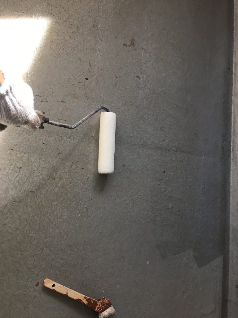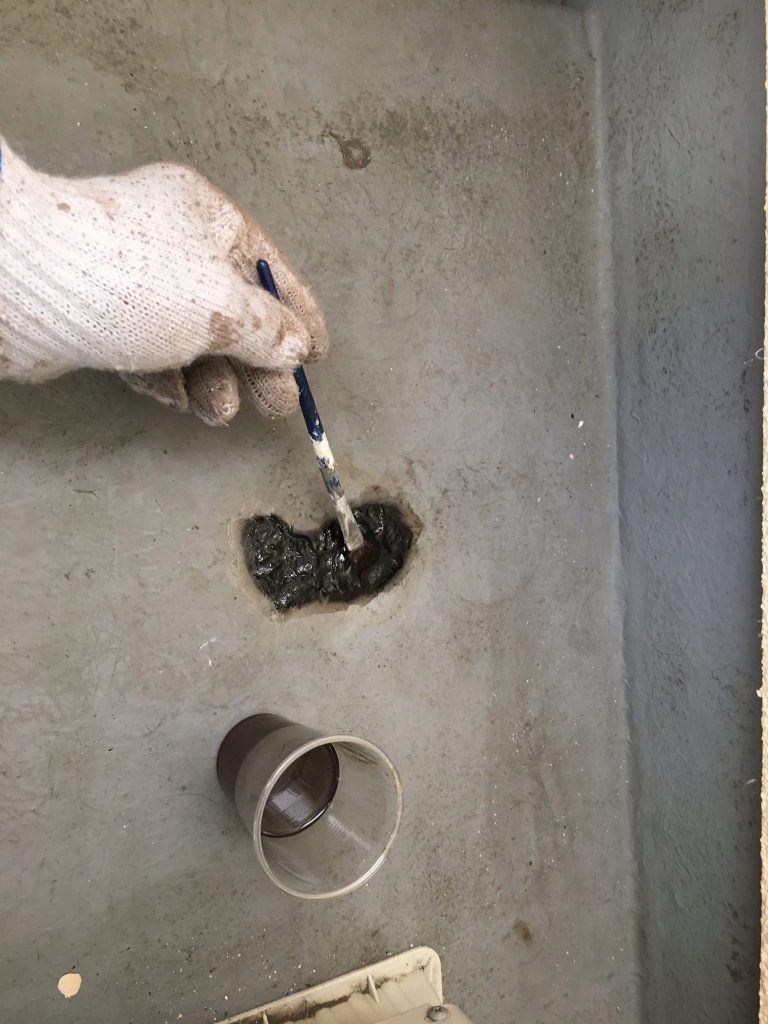 乾燥を待っている間にベランダ床部のFRPを補修、ベランダ床部下塗を行なっております。