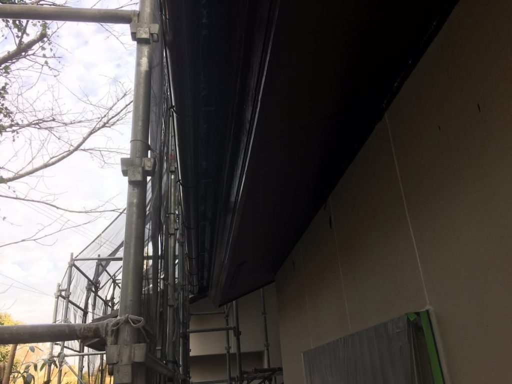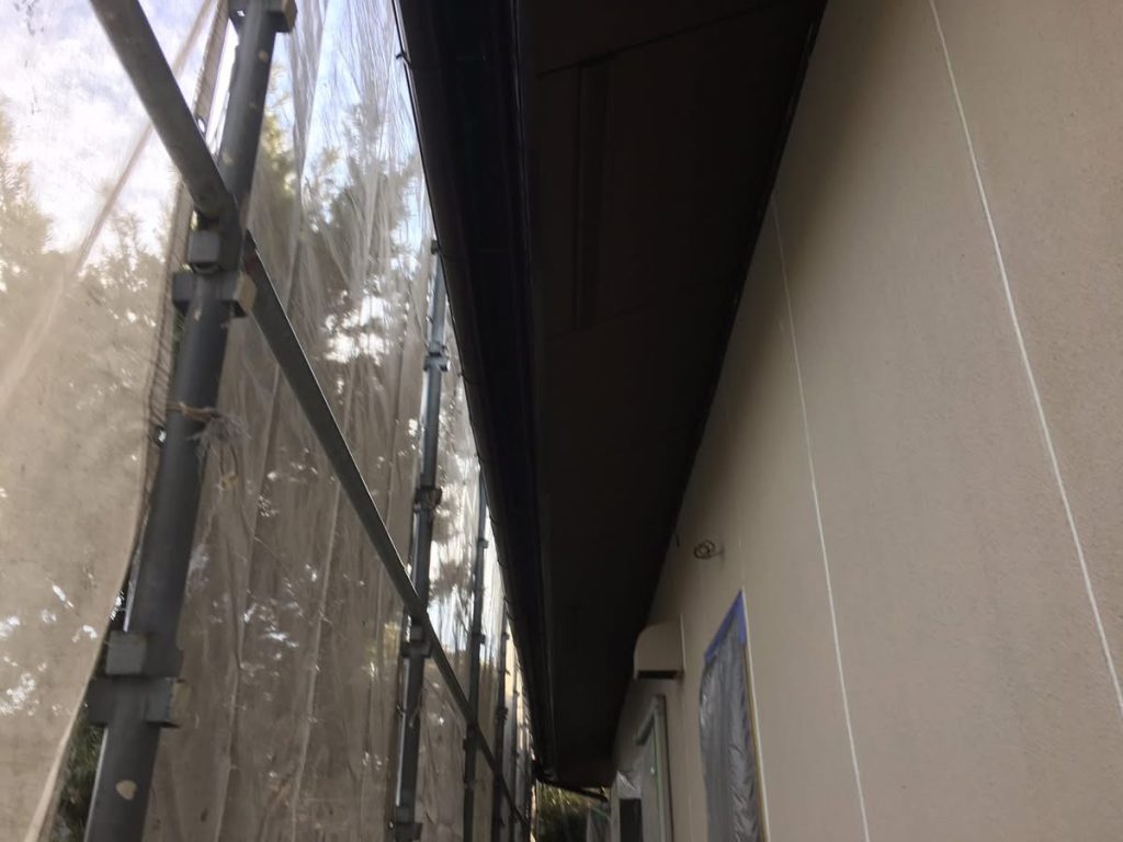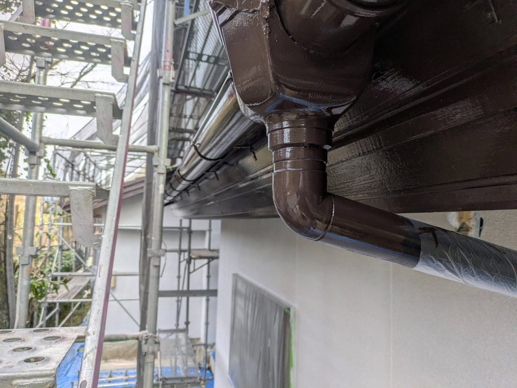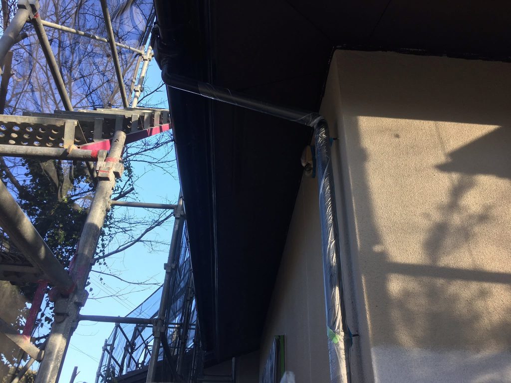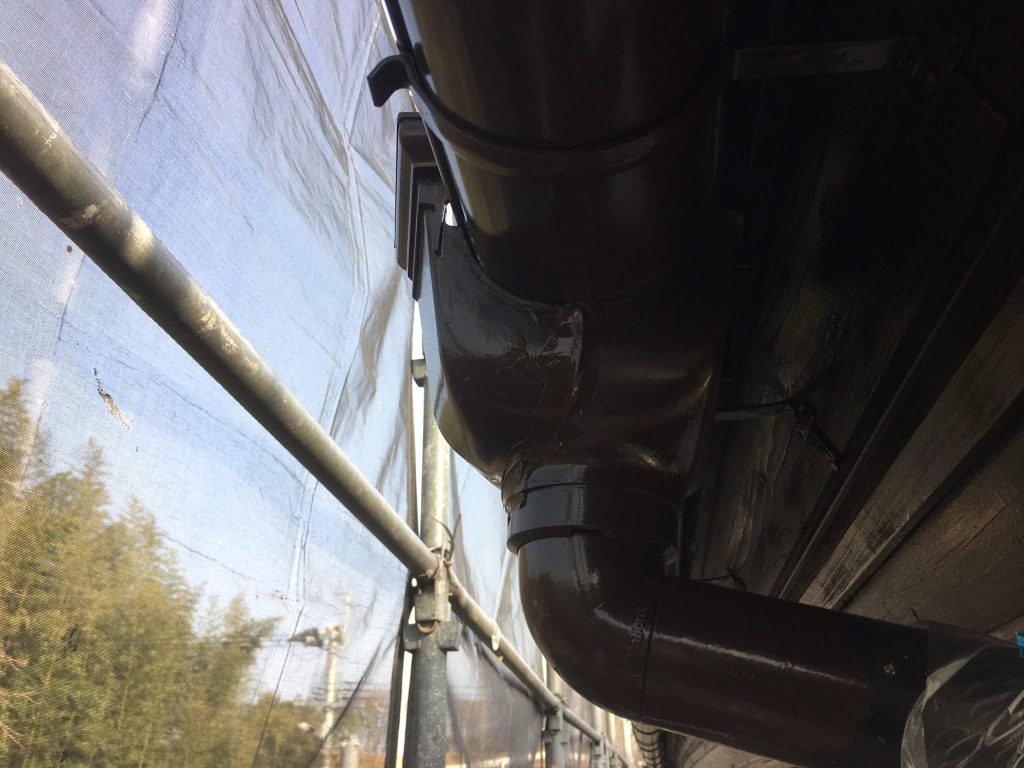 大変お世話になります。本日は朝より乗り込ませて頂き破風、横樋塗布を行なっております。