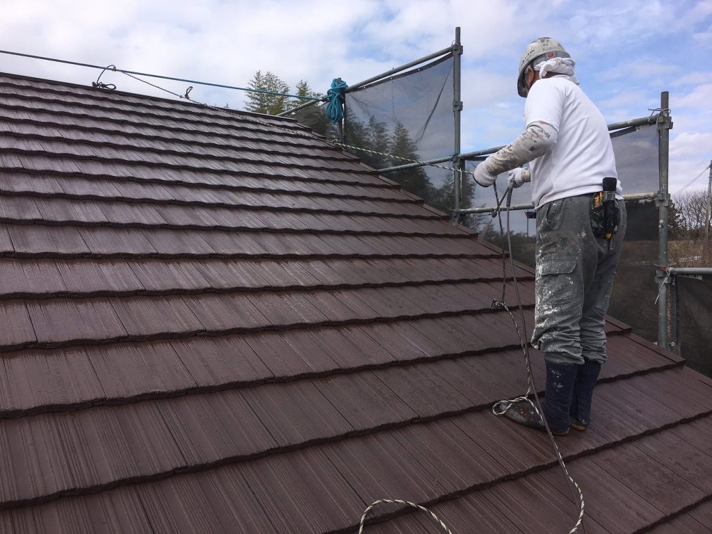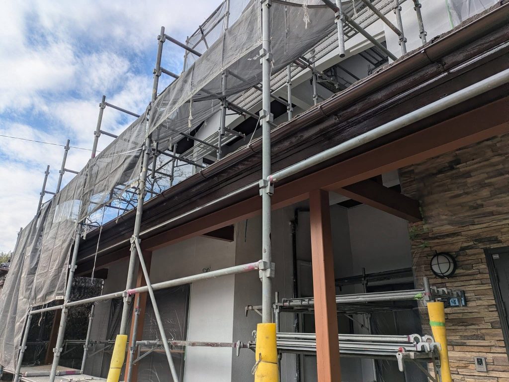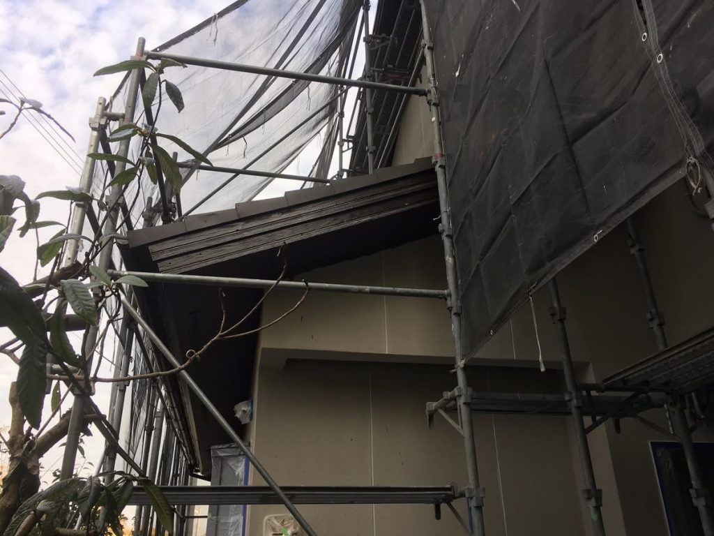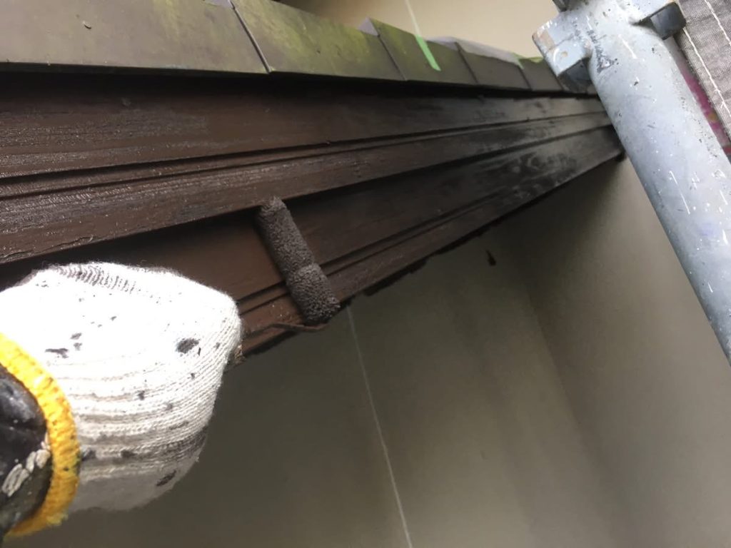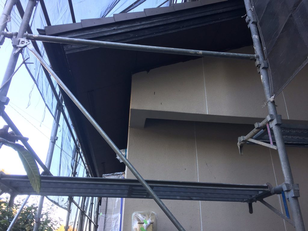 大変お世話になります。本日は朝より乗り込ませて頂き破風、横樋塗布を行なっております。