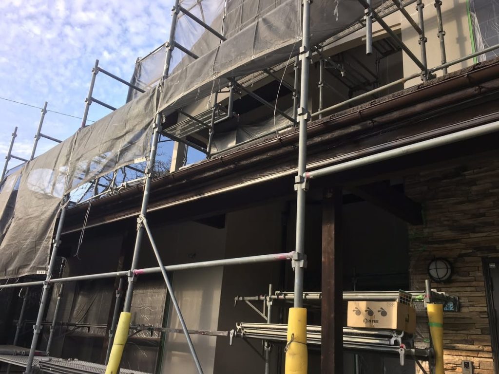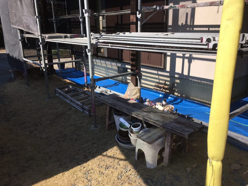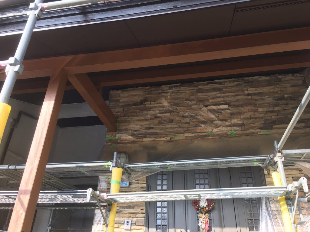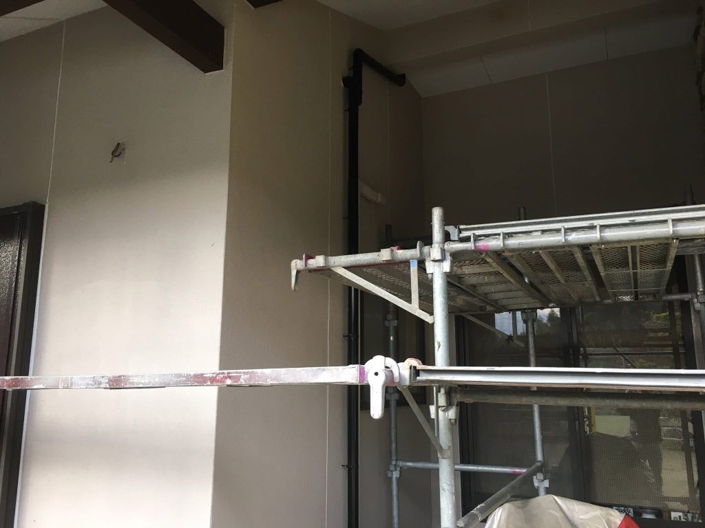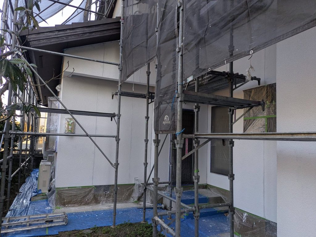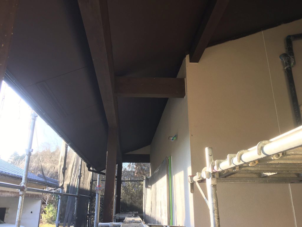 大変お世話になります。本日は朝より乗り込ませて頂き軒天井塗布を行なっております。