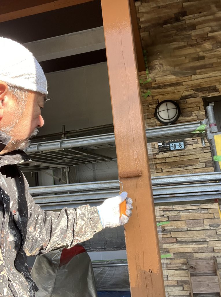 その後下部マスキング手直し、木部のケレン作業、下塗を行なっております。