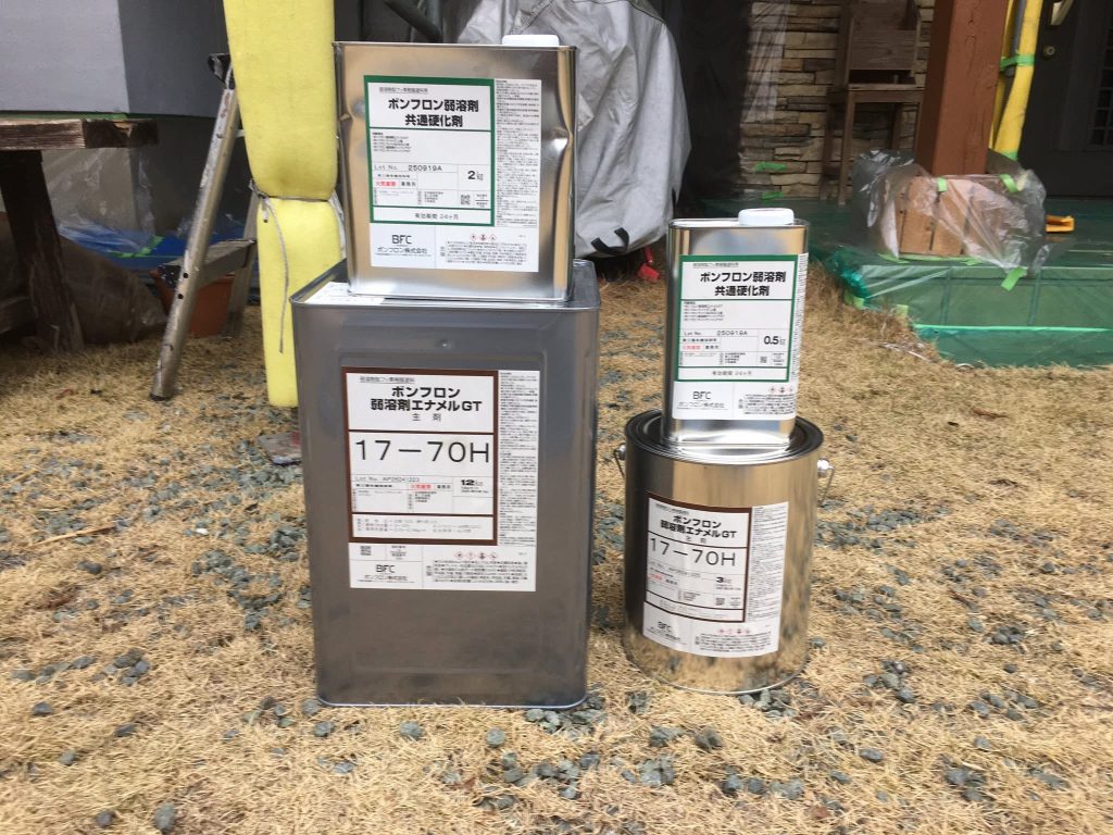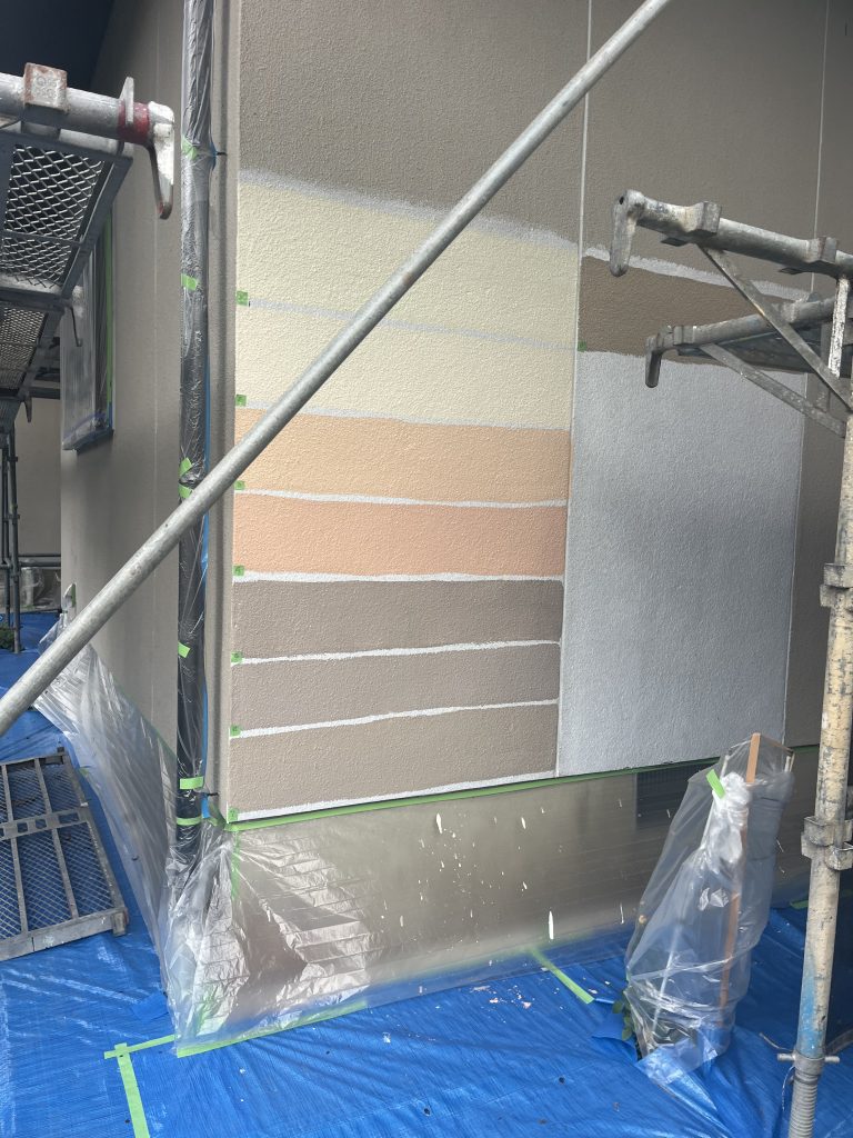 大変お世話になります。本日は朝より乗り込ませて頂きサンプル塗料塗布を行なっております。