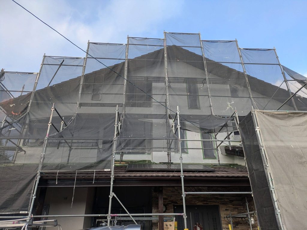 大変お世話になります。本日は朝より乗り込ませて頂き下部ブルーシート張りを行なっております。