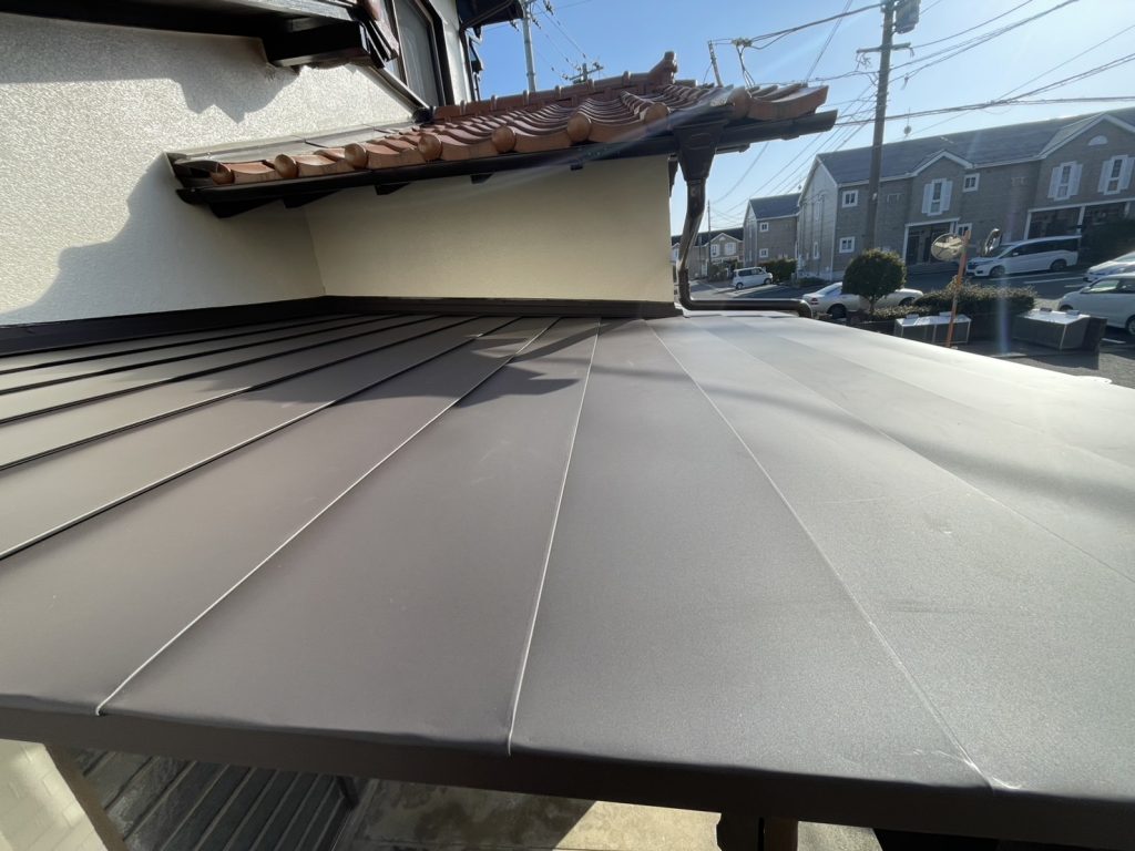 本日は庇板金、ケレン、錆止め後、フッ素にて板金塗装を行なっております。
