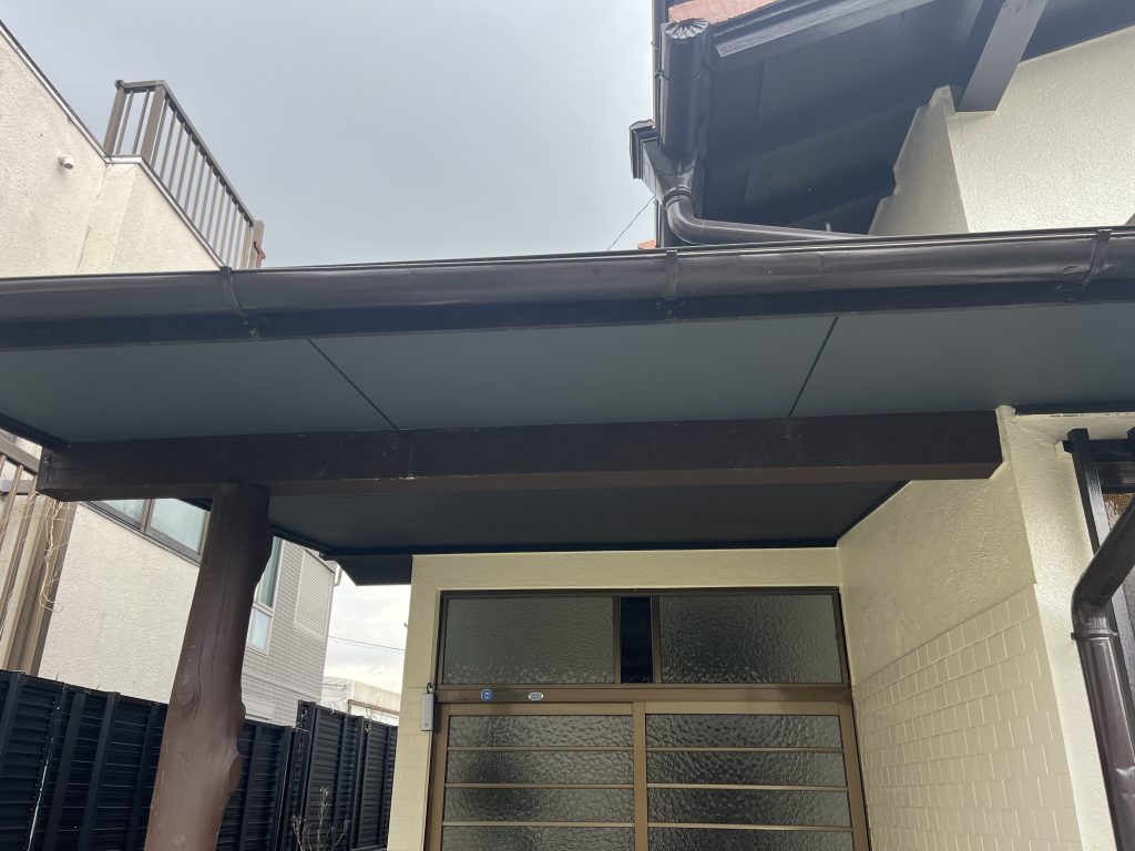 大変お世話になります。本日は朝より乗り込ませて頂き玄関庇部軒天井塗布を行なっております。