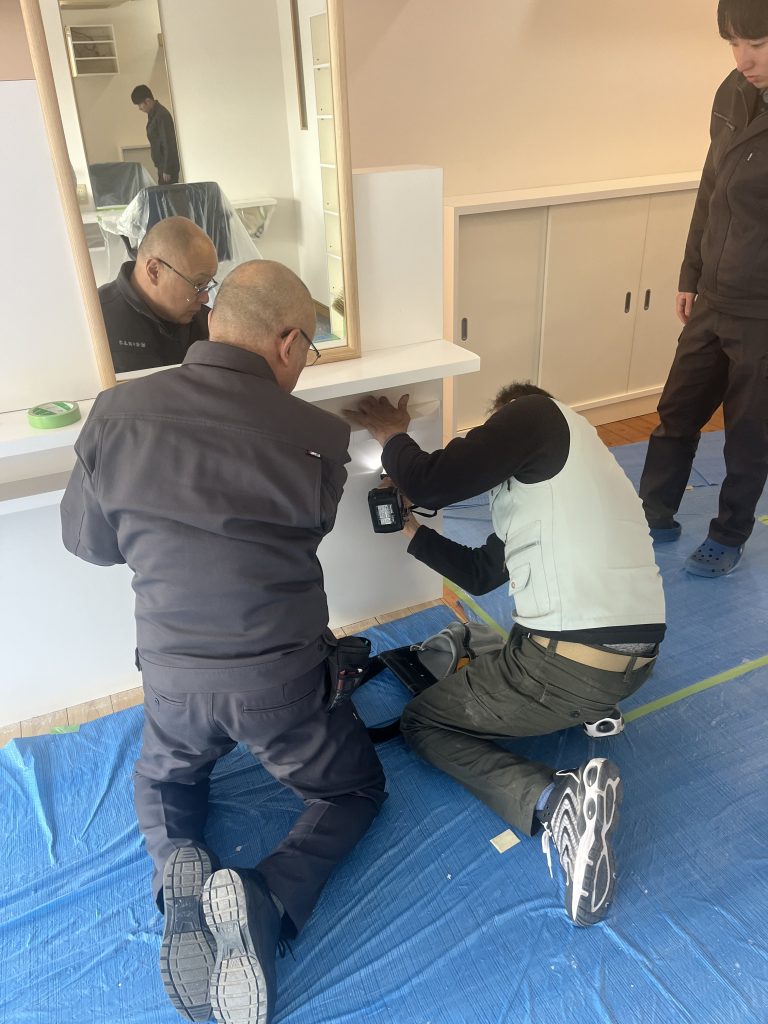 大変お世話になります。本日は朝より乗り込ませて頂き洗面台、棚、シーリング充填からスタートしております。