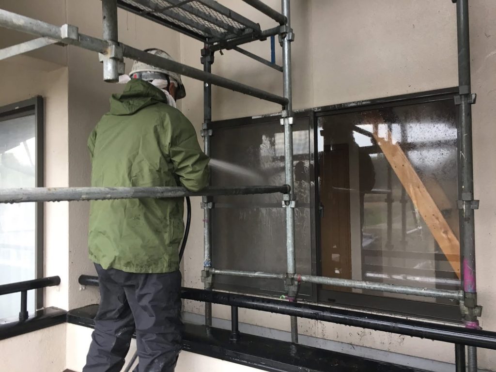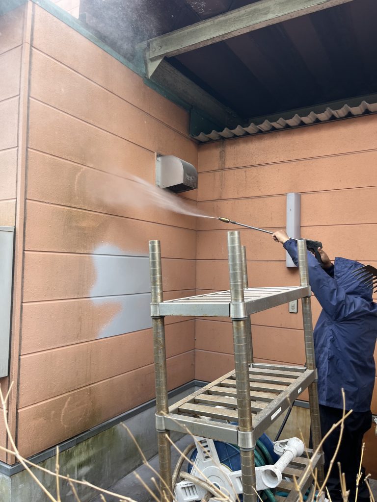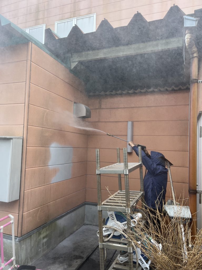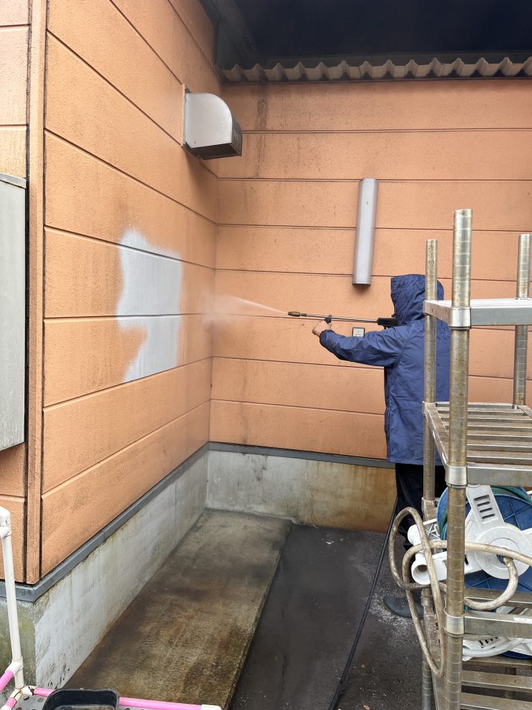 大変お世話になります。本日は朝より乗り込ませて頂き高圧洗浄を行なっております。