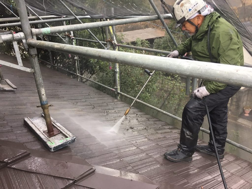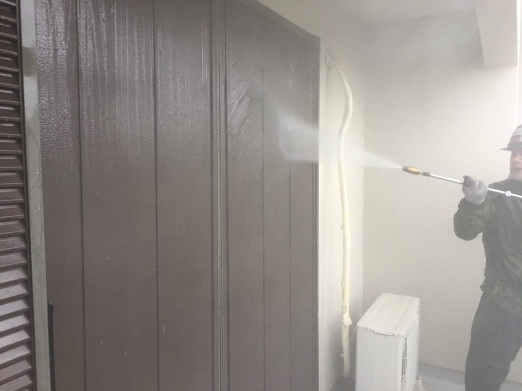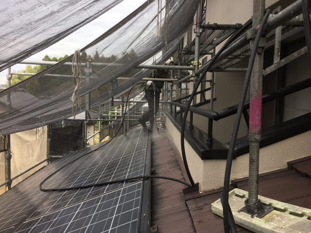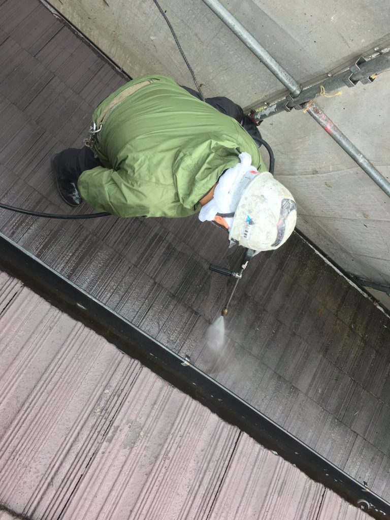 大変お世話になります。本日は朝より乗り込ませて頂き高圧洗浄を行なっております。