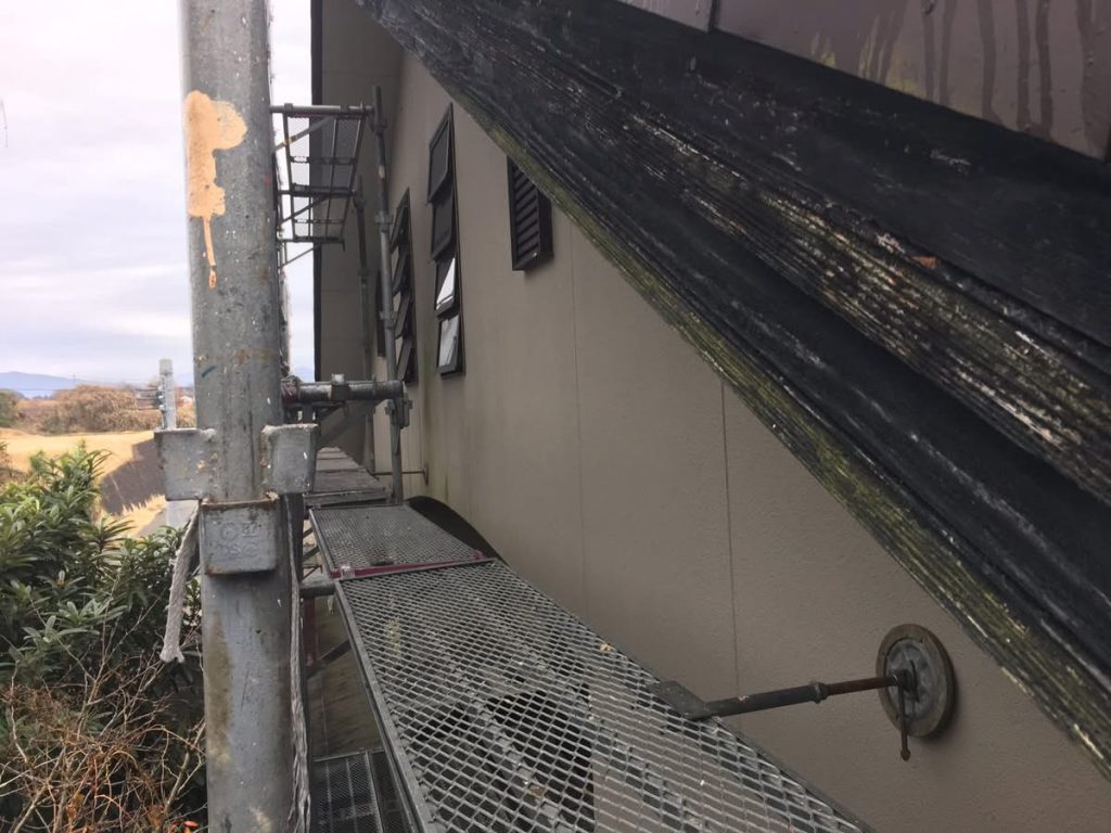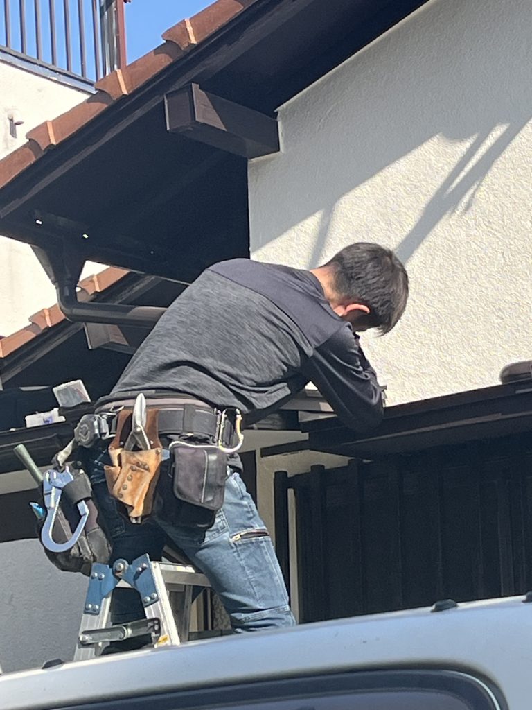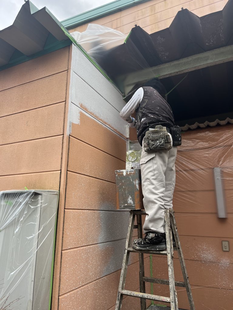 大変お世話になります。本日は朝より乗り込ませて頂き玄関庇部軒天井塗布を行なっております。