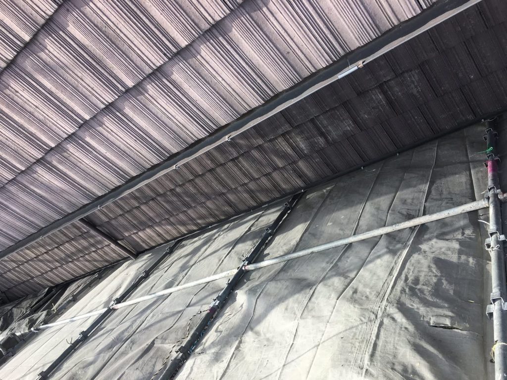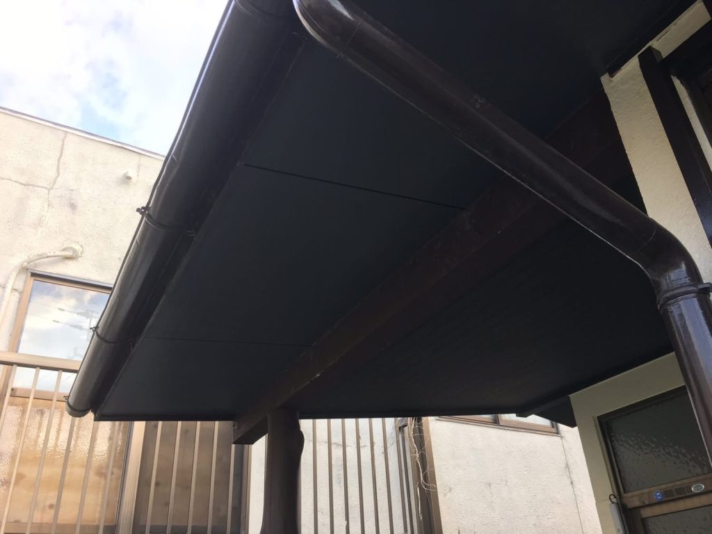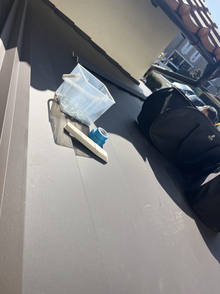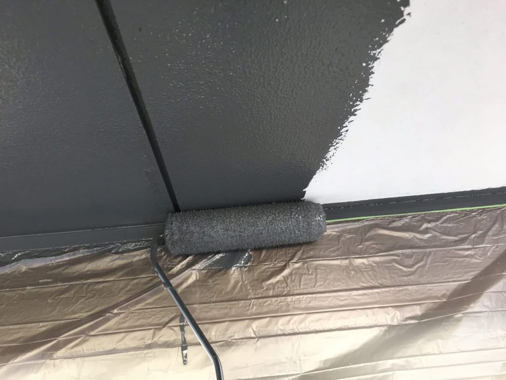 本日は庇板金、ケレン、錆止め後、フッ素にて板金塗装を行なっております。