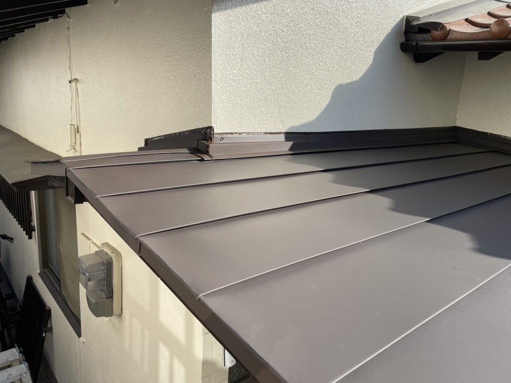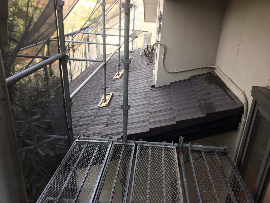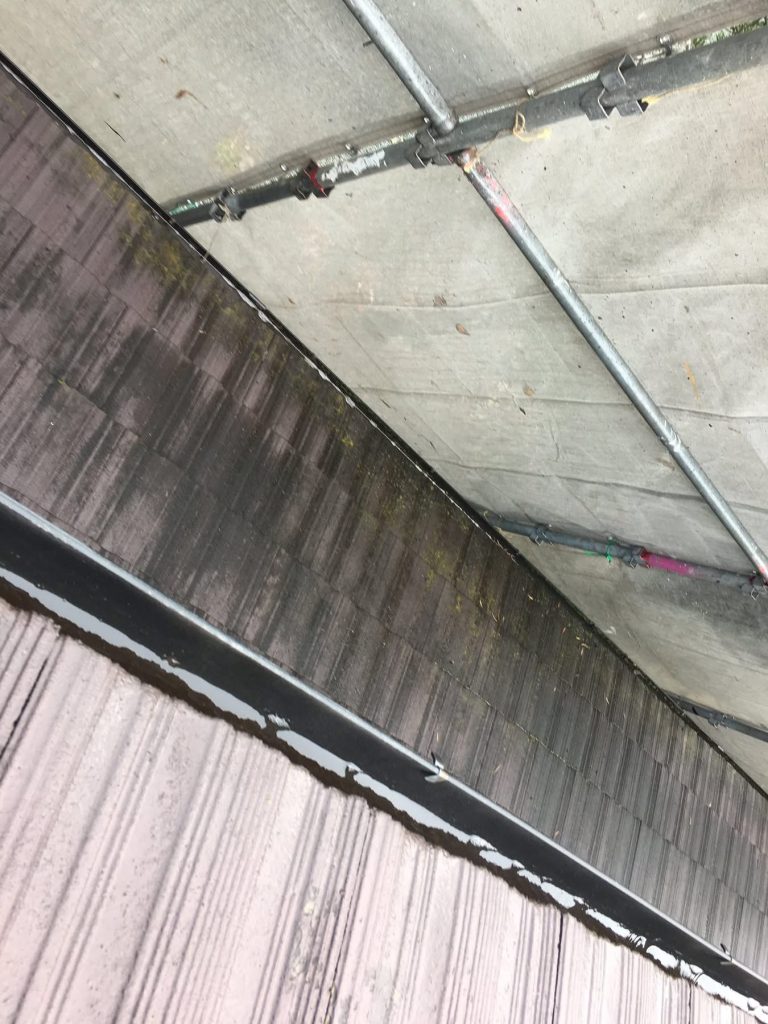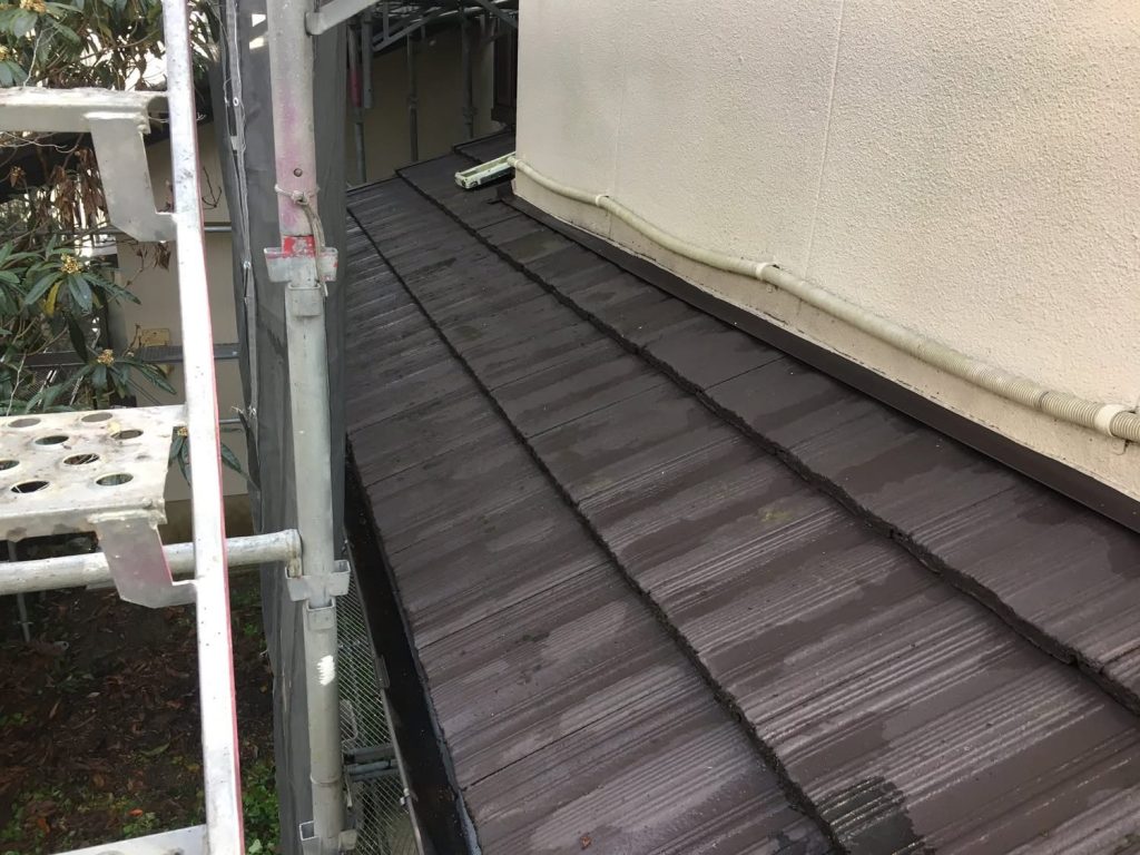 本日は庇板金、ケレン、錆止め後、フッ素にて板金塗装を行なっております。