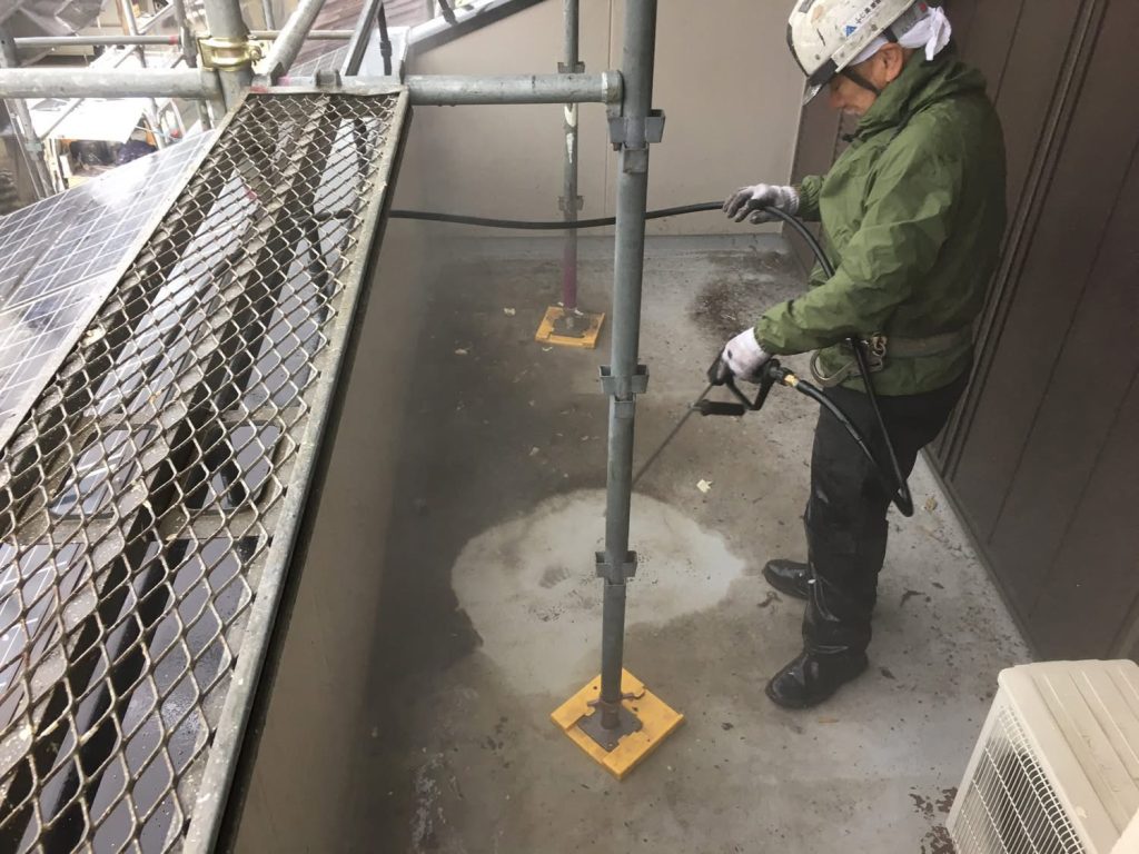 大変お世話になります。本日は朝より乗り込ませて頂きベランダ床防水塗装を進めております。