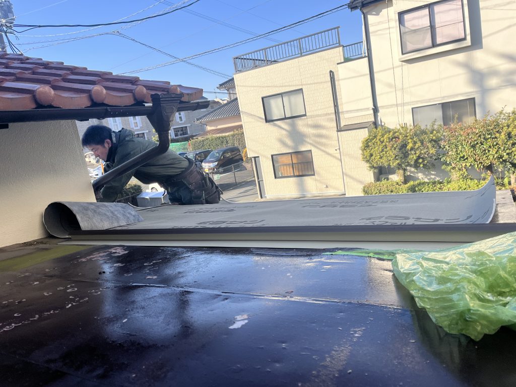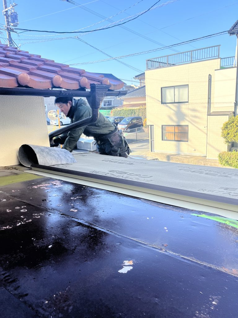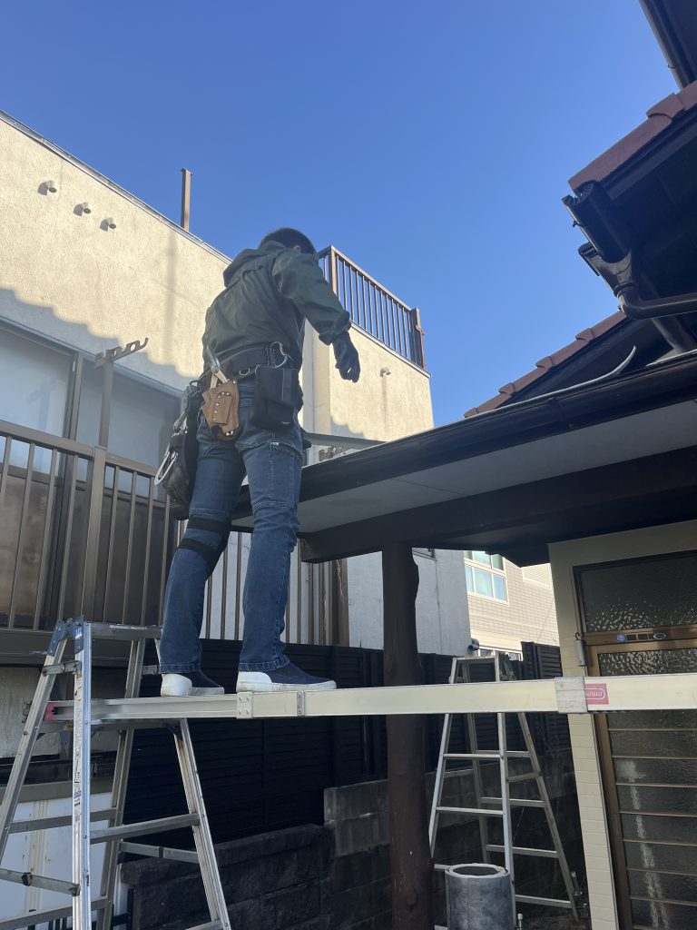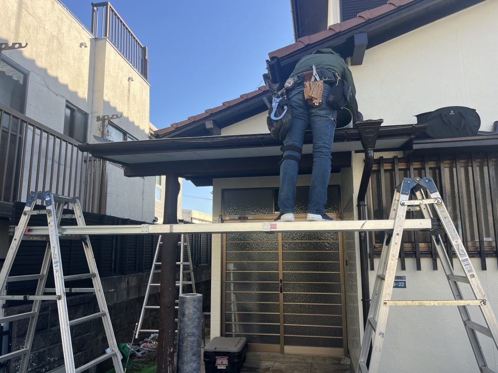 大変お世話になります。本日は朝より乗り込ませて頂き玄関庇のカバー工法を行なっております。