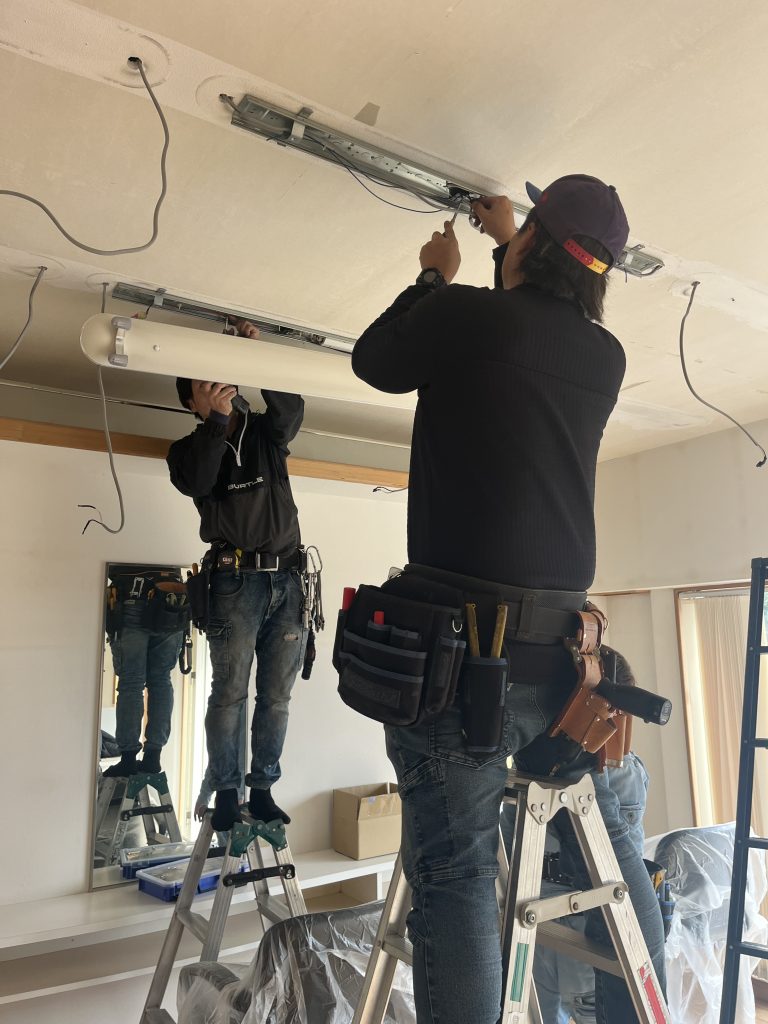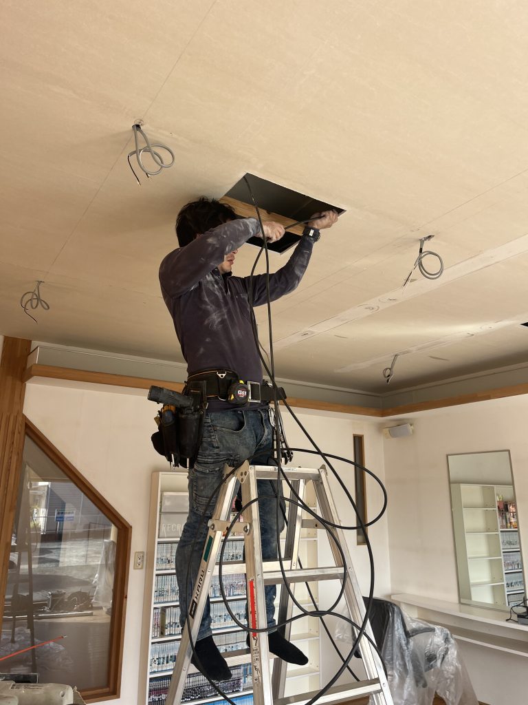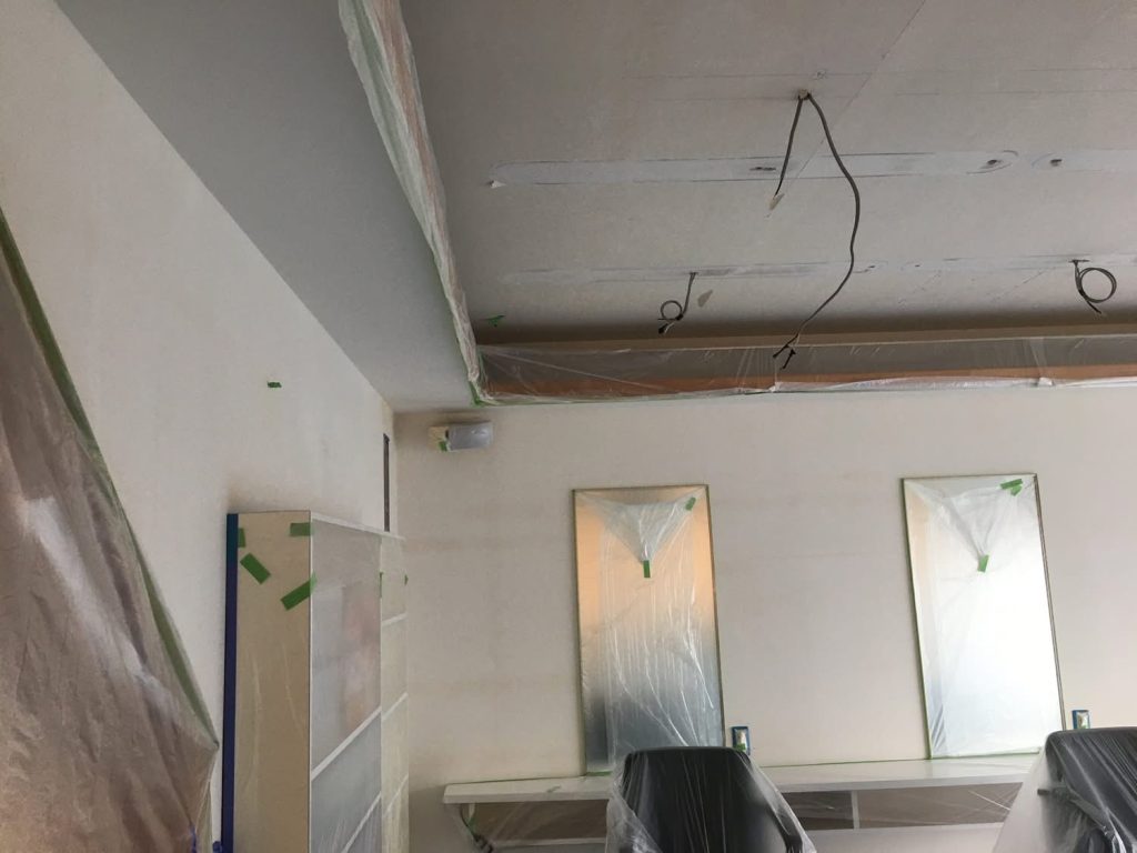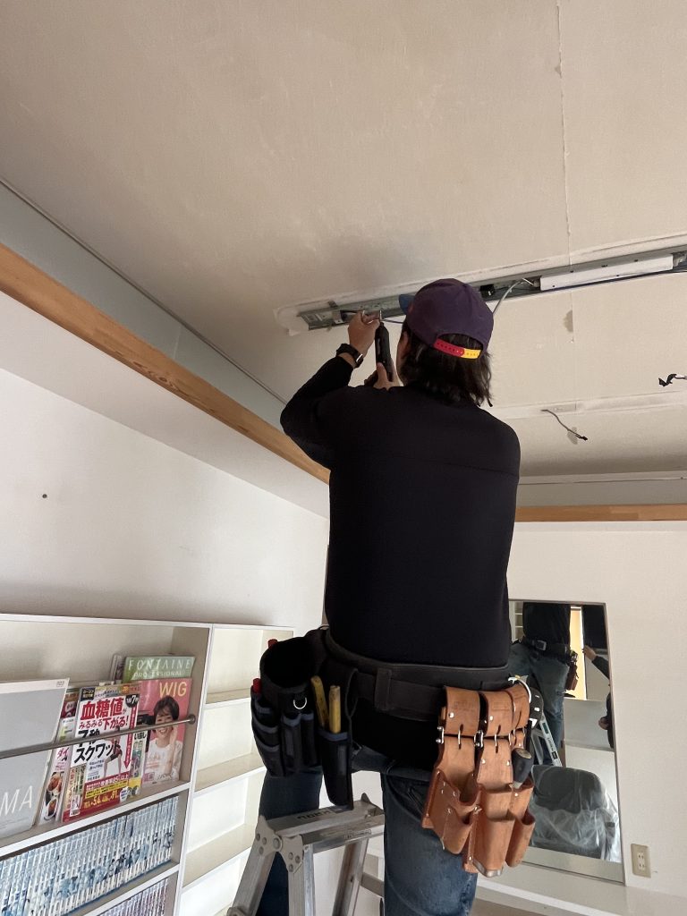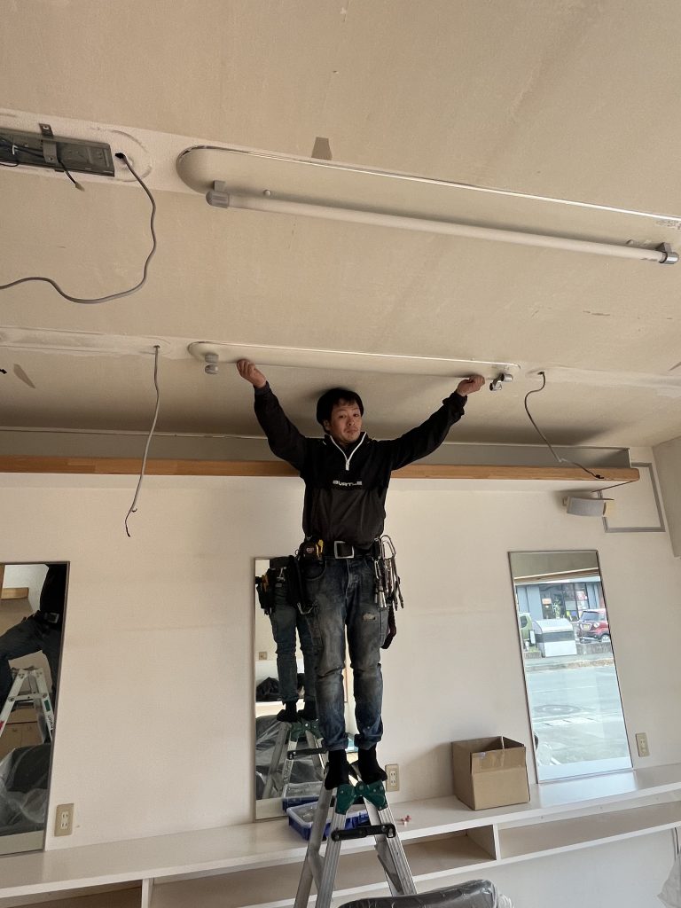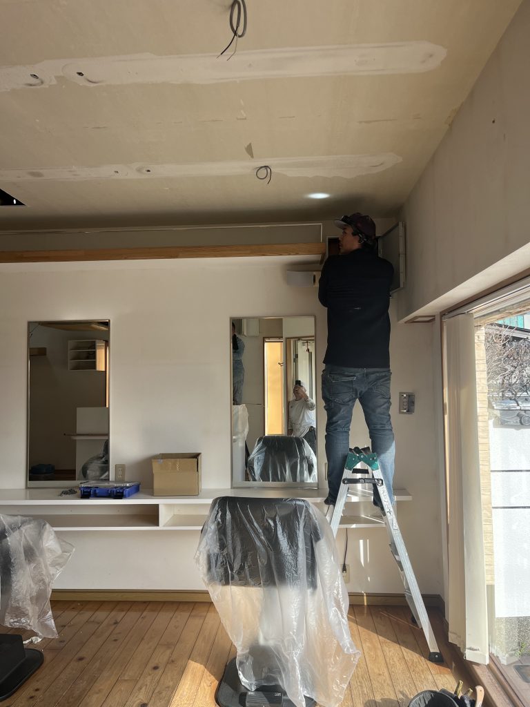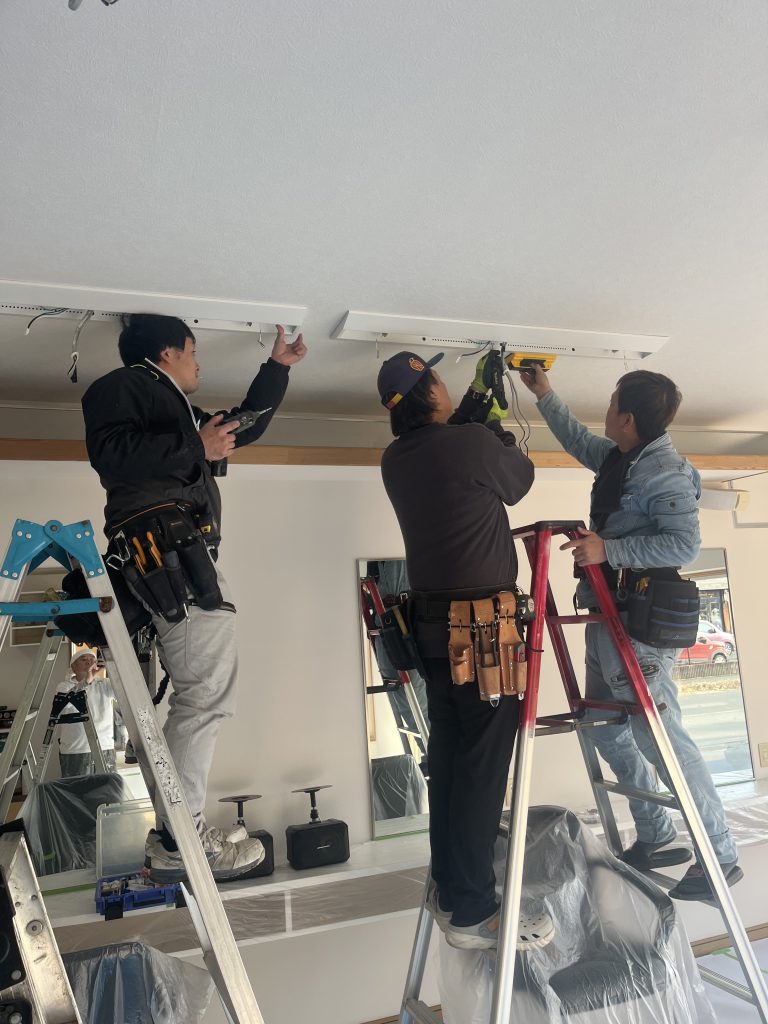 大変お世話になります。本日は朝より乗り込ませて頂き照明器具取付からスタートしております。器具取付、防犯カメラ取付、コンセント取付を行い平行しながらドア後壁塗布、カウンターシーリング充填など行なっております。