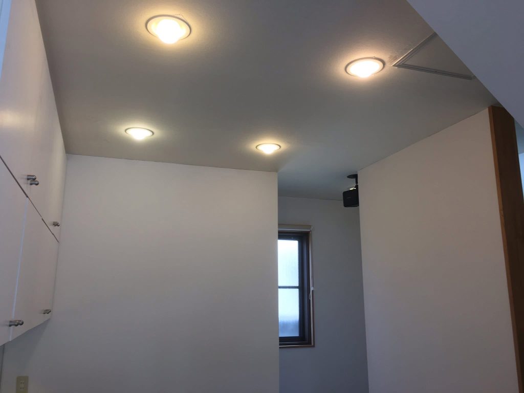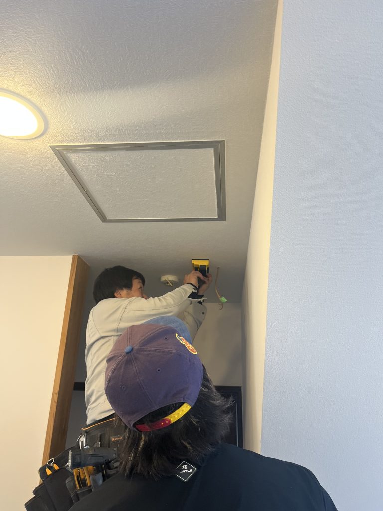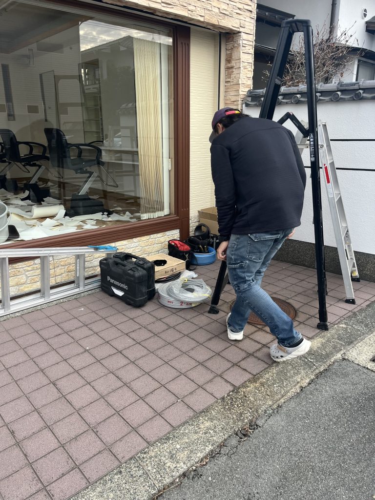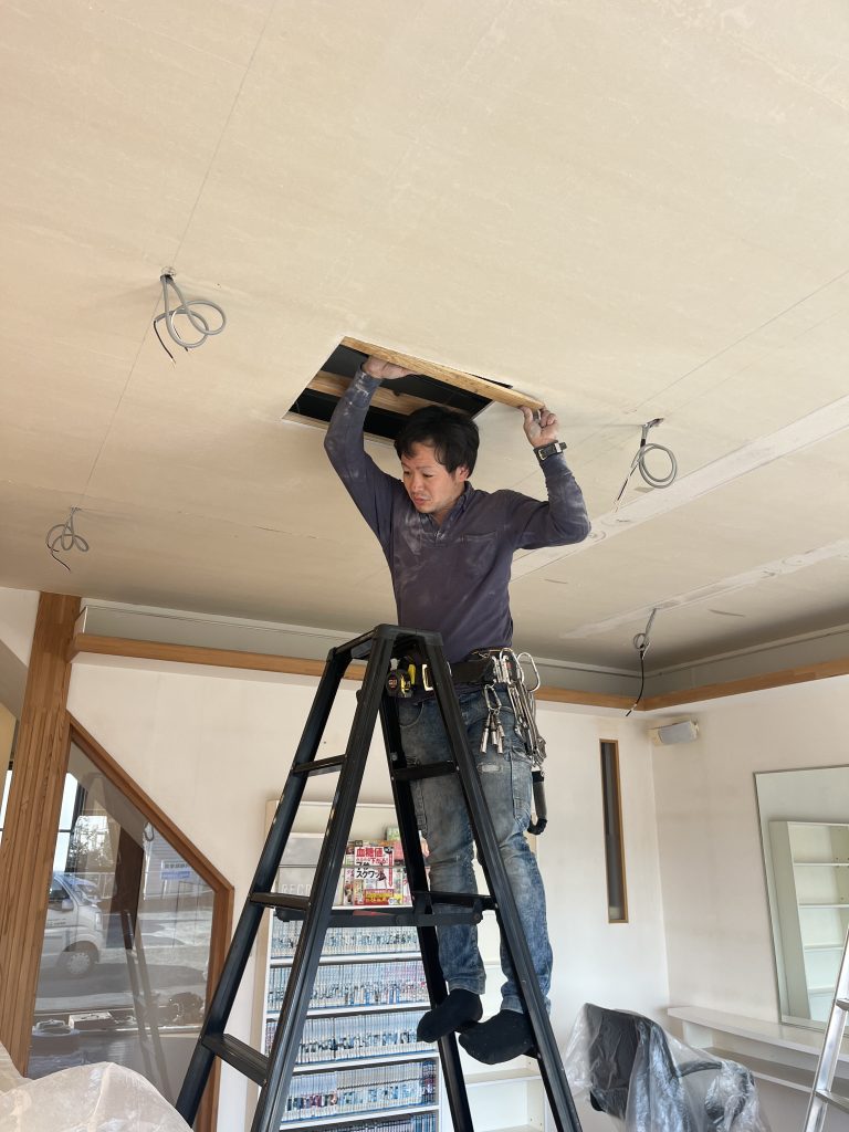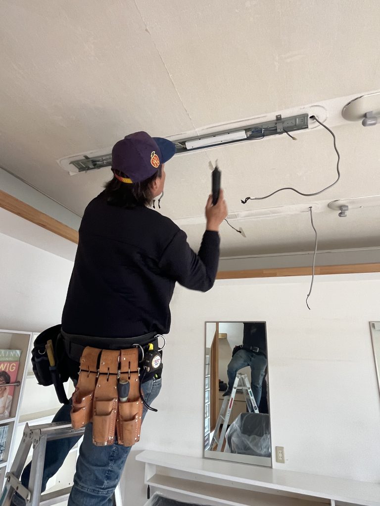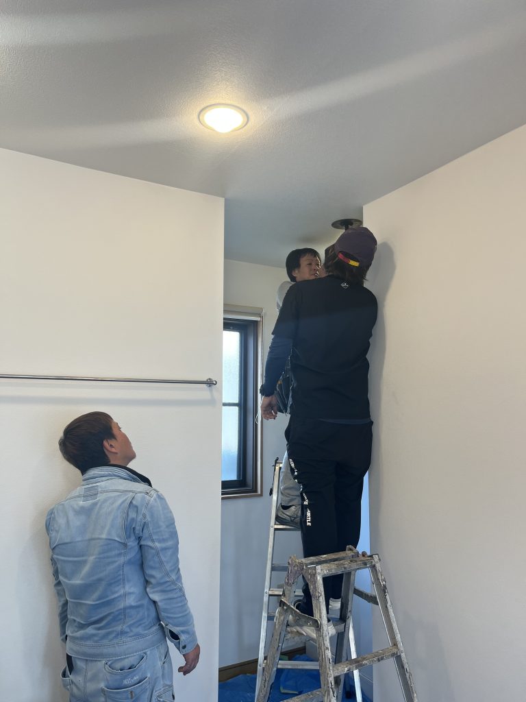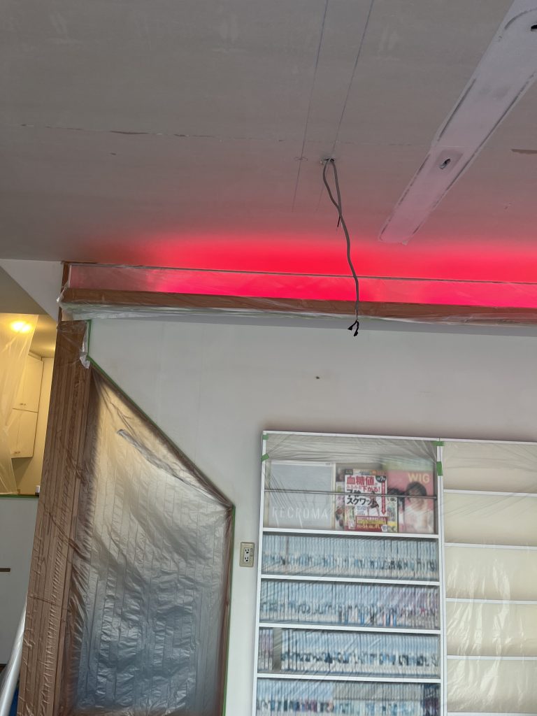 大変お世話になります。本日は朝より乗り込ませて頂き照明器具取付からスタートしております。器具取付、防犯カメラ取付、コンセント取付を行い平行しながらドア後壁塗布、カウンターシーリング充填など行なっております。