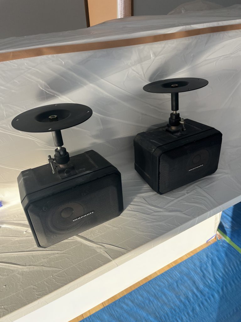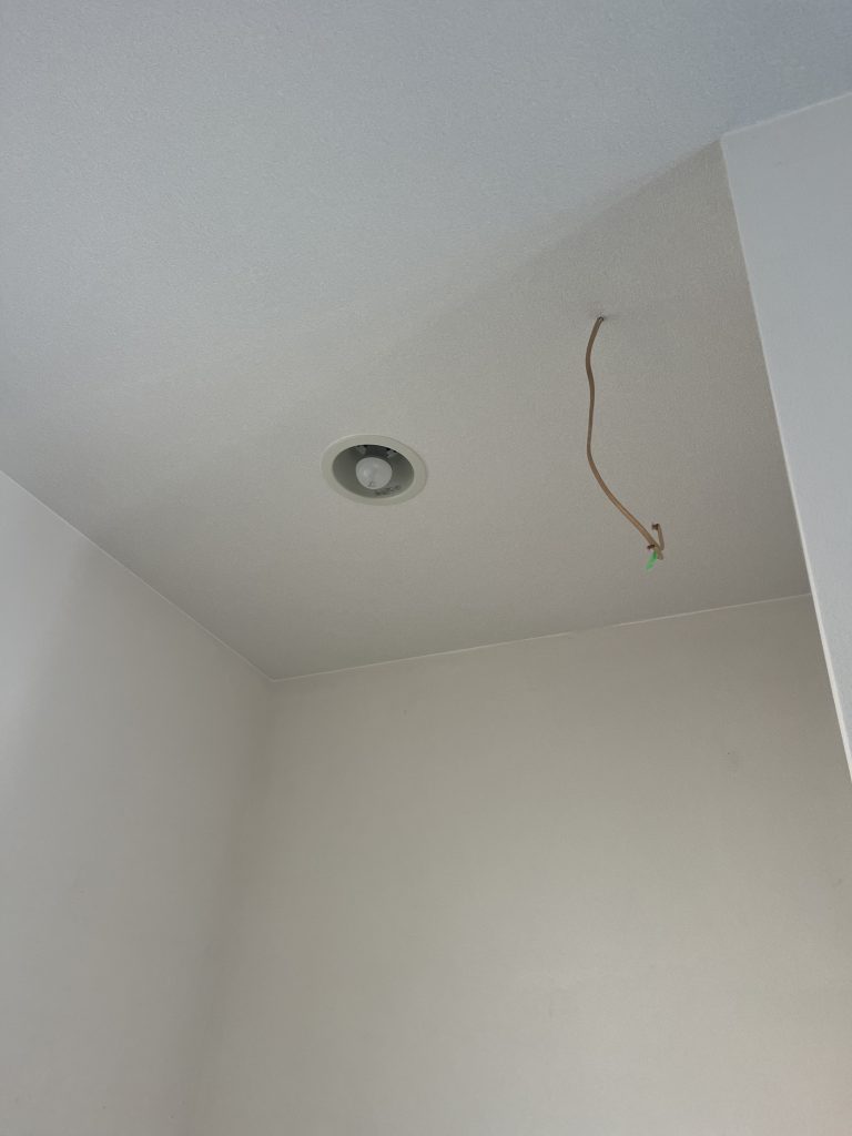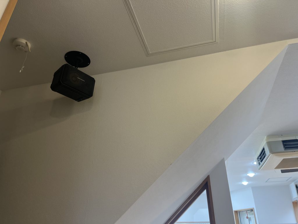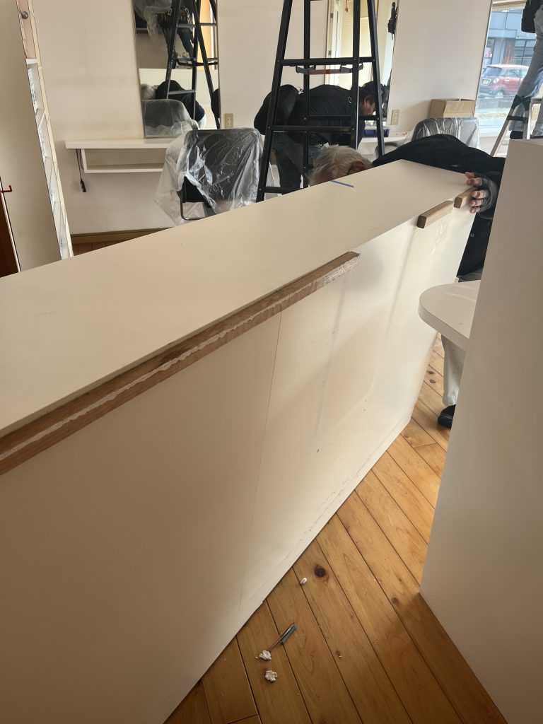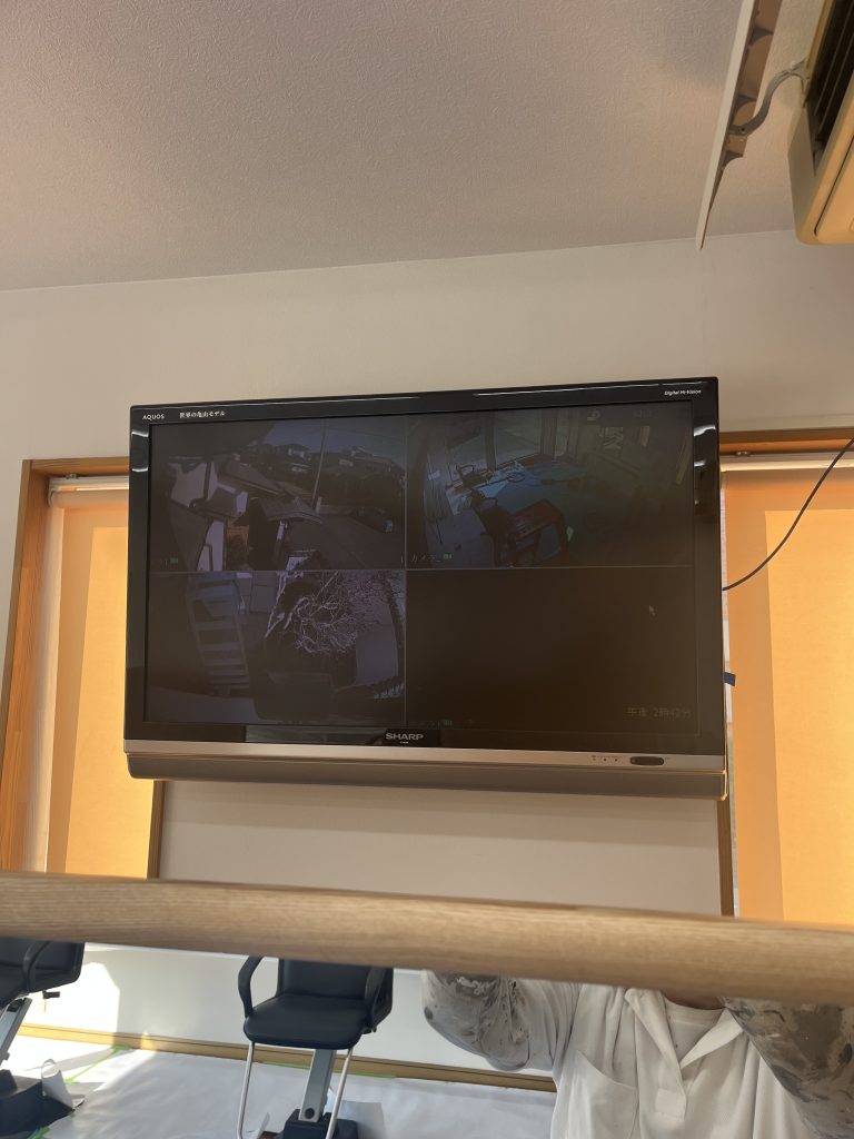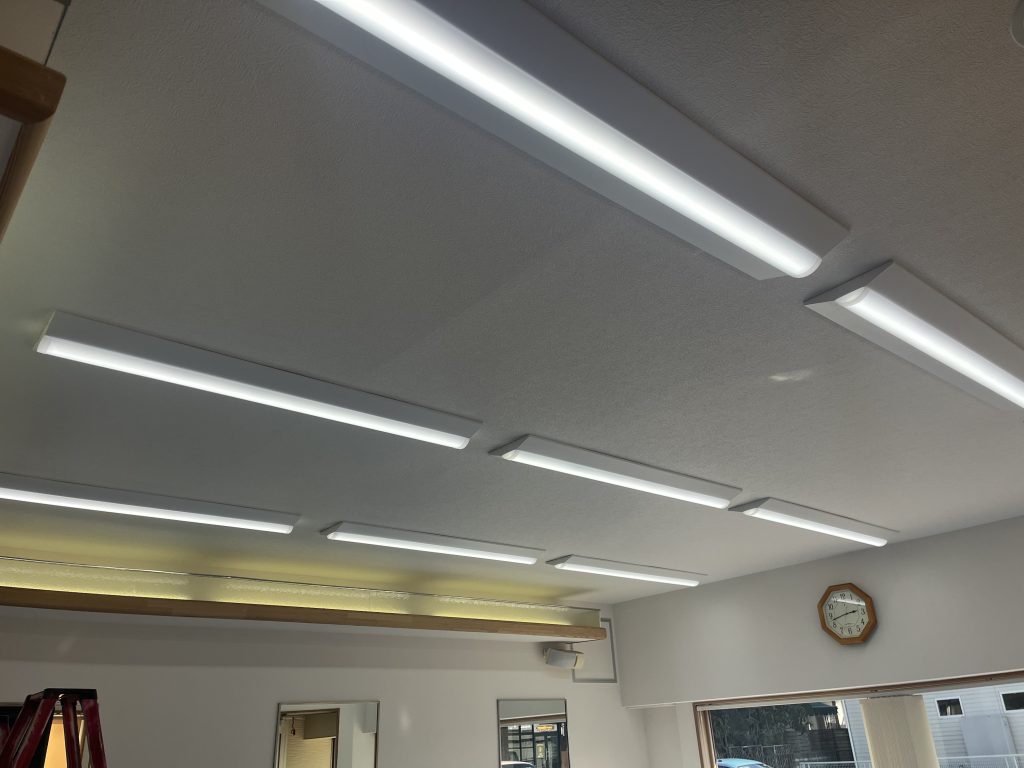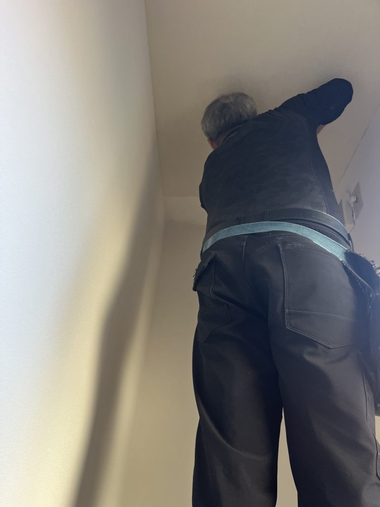 大変お世話になります。本日は朝より乗り込ませて頂き照明器具取付からスタートしております。器具取付、防犯カメラ取付、コンセント取付を行い平行しながらドア後壁塗布、カウンターシーリング充填など行なっております。