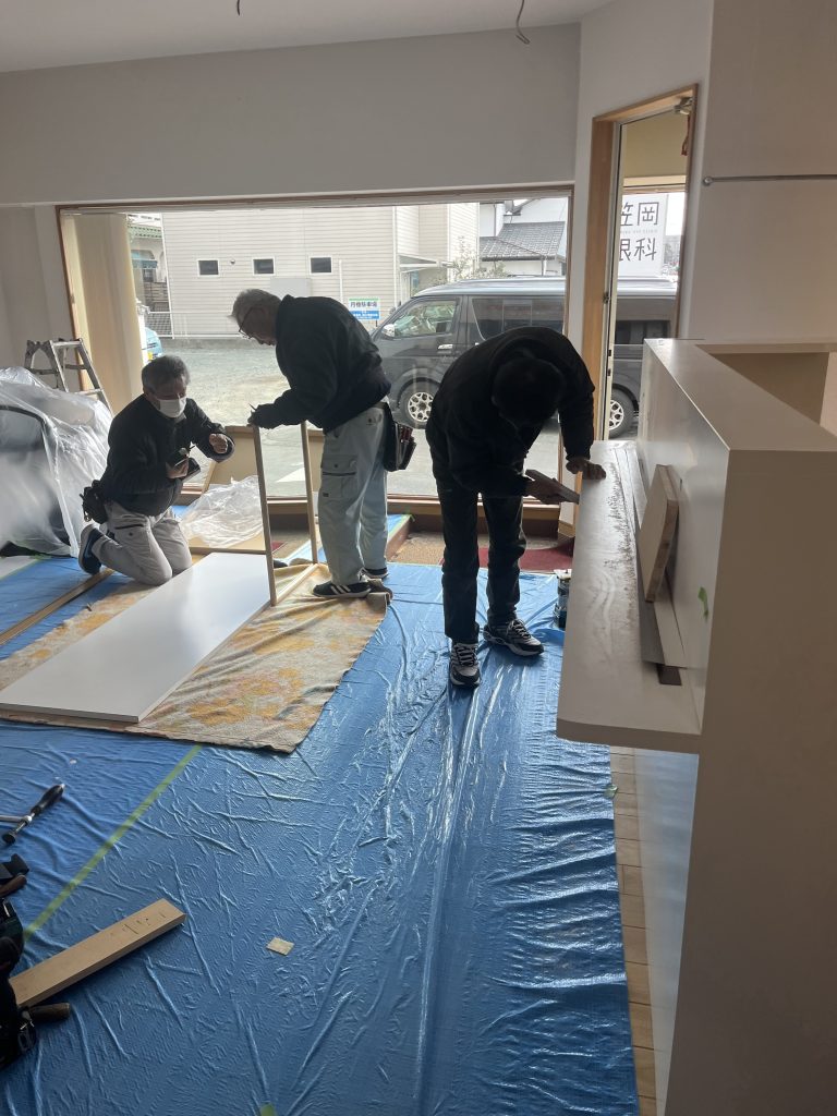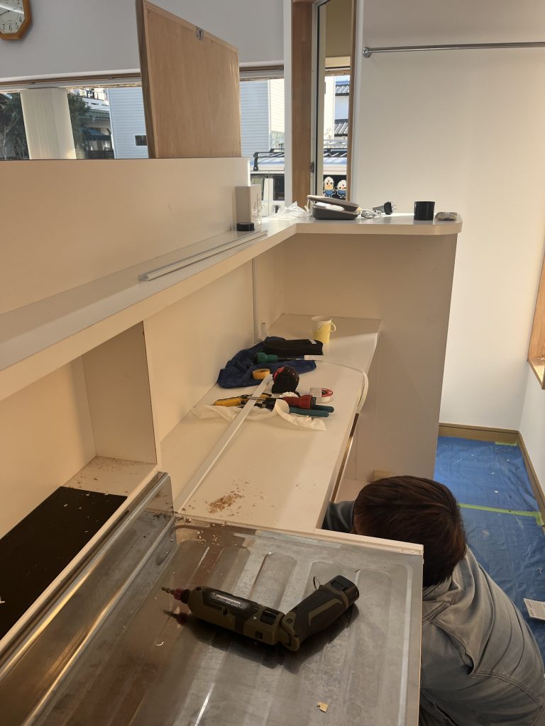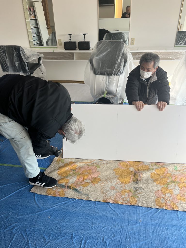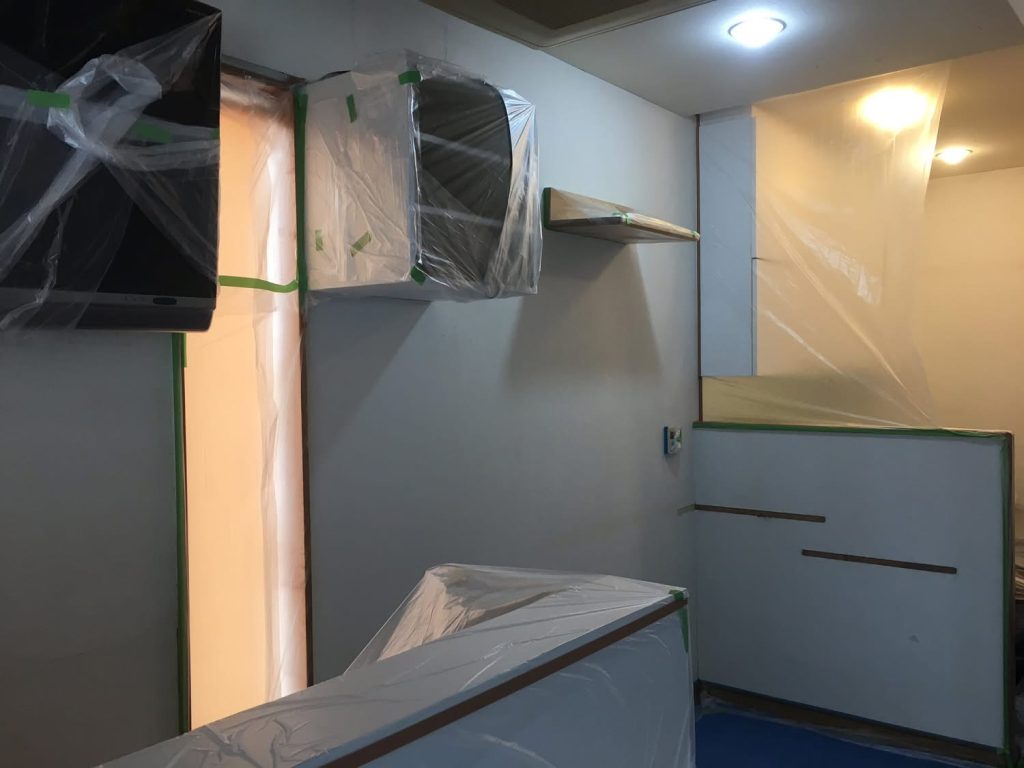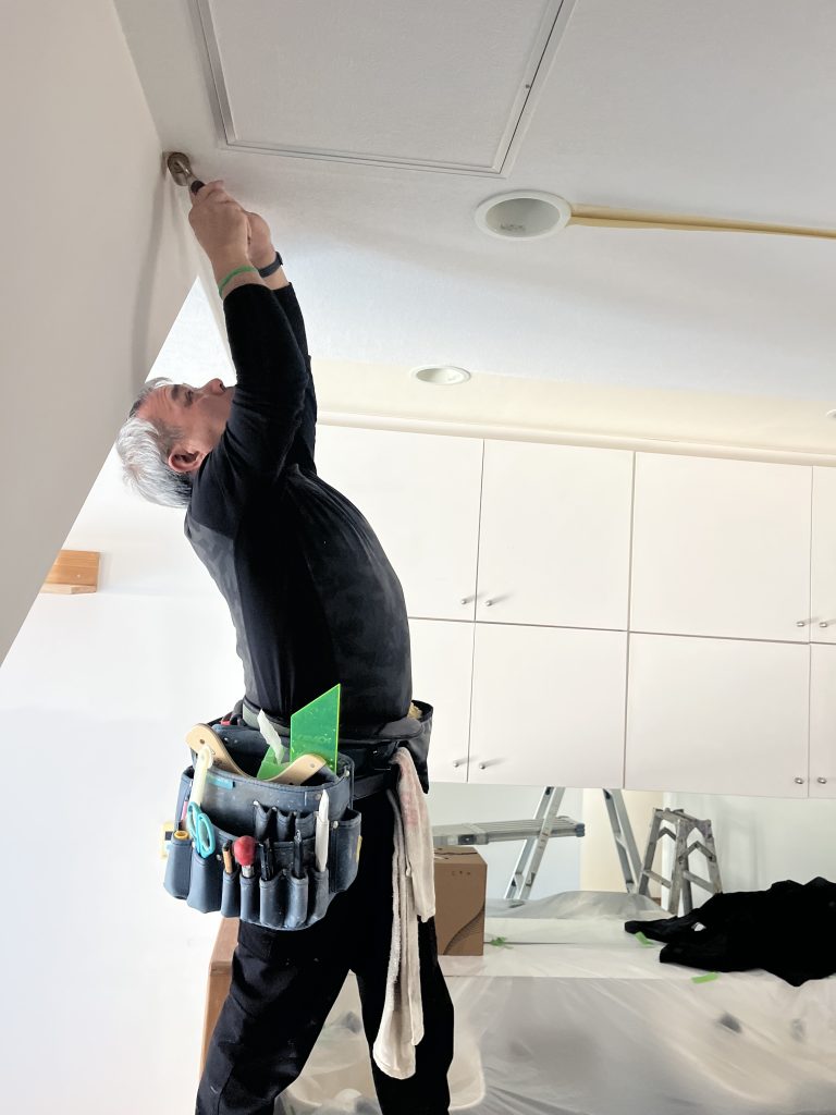 明日も朝より乗り込ませて頂き引き続き天井クロス張り、家具の搬入、取付など行なって参ります。
