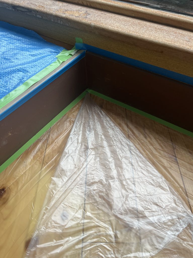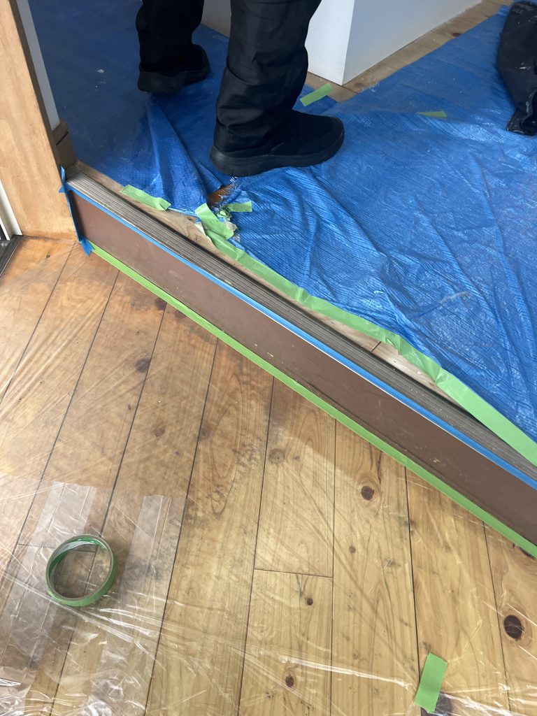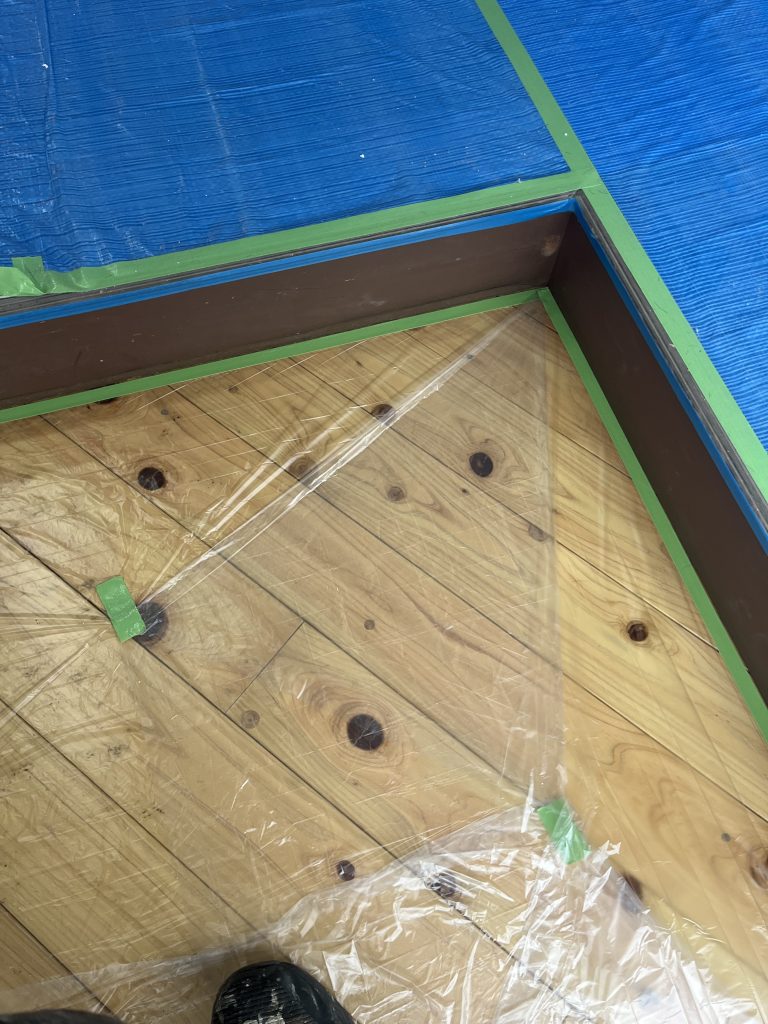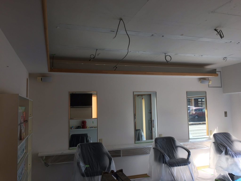 大変お世話になります。本日は朝より乗り込ませて頂き店舗内部マスキング作業を行なっております。