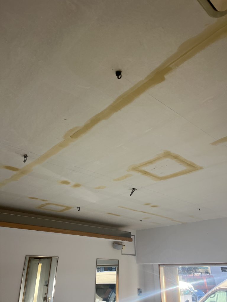大変お世話になります。本日は朝より乗り込ませて頂き天井下地処理パテよりスタートしております。