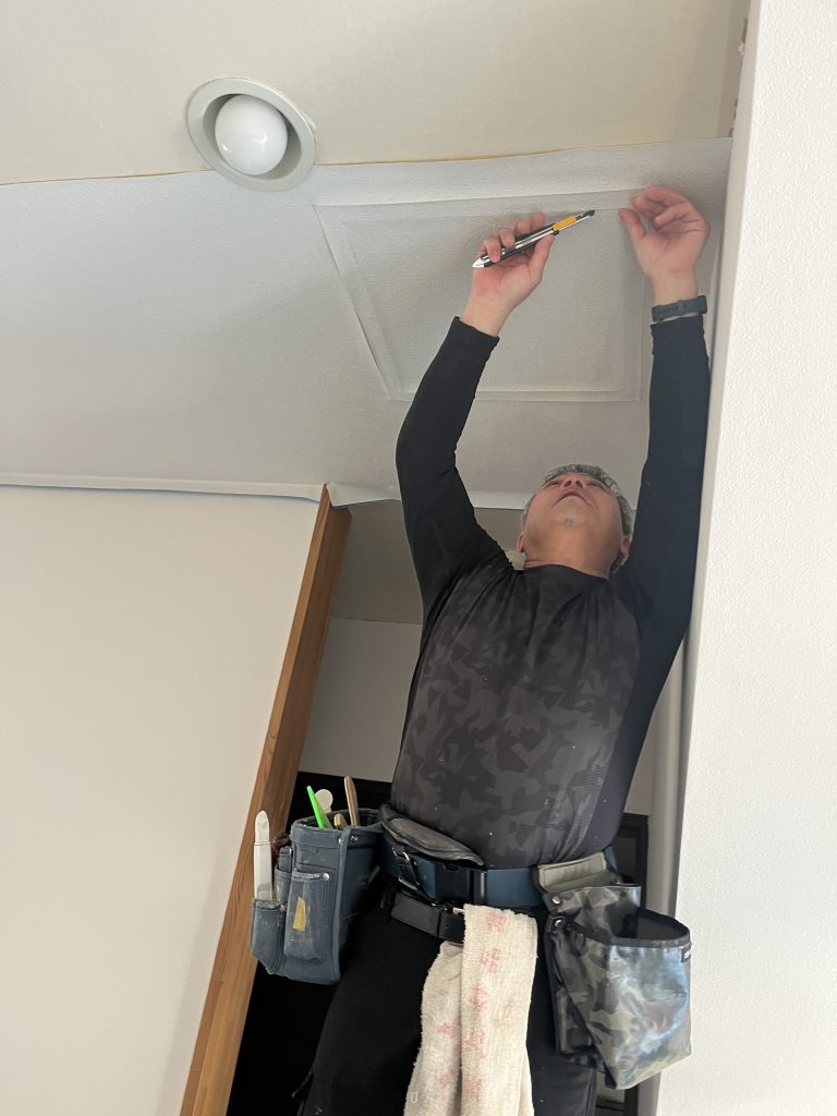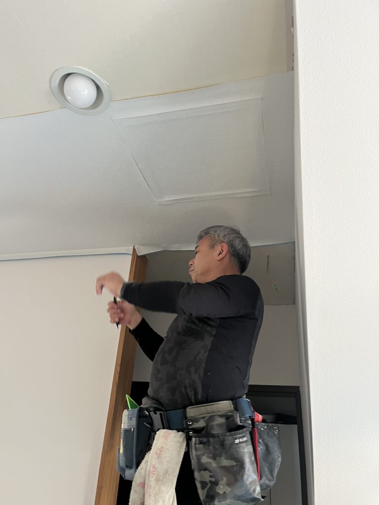 大変お世話になります。本日は朝より乗り込ませて頂き昨日に引き続き天井クロス張りからスタートしております。